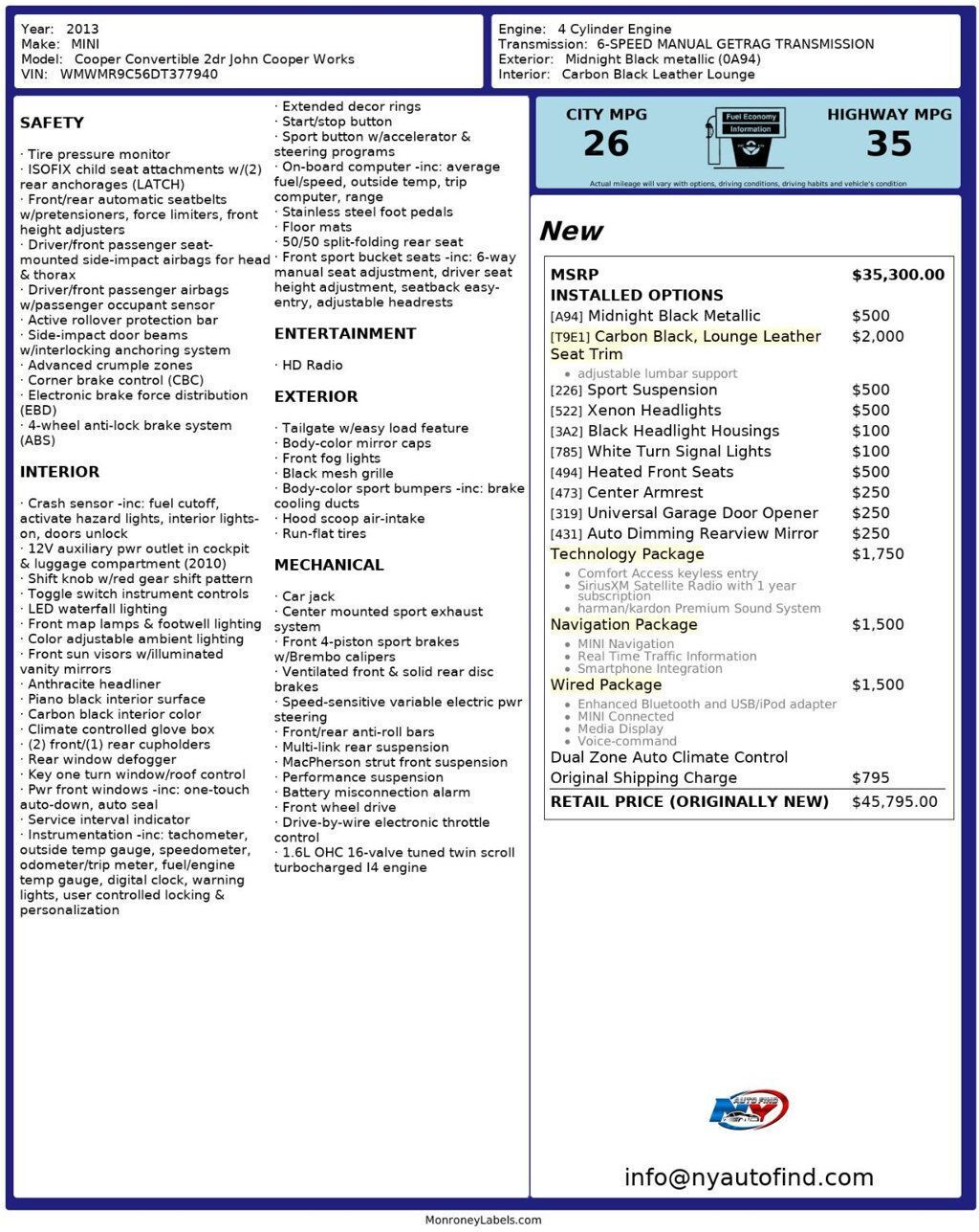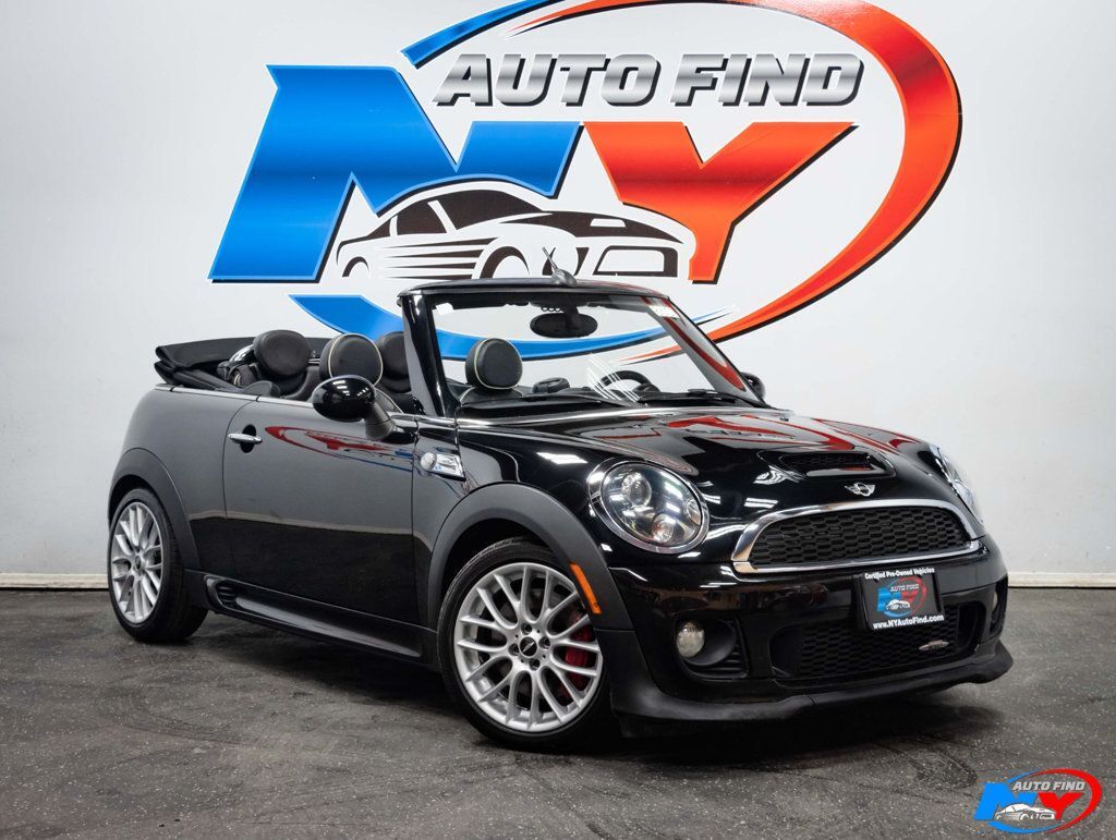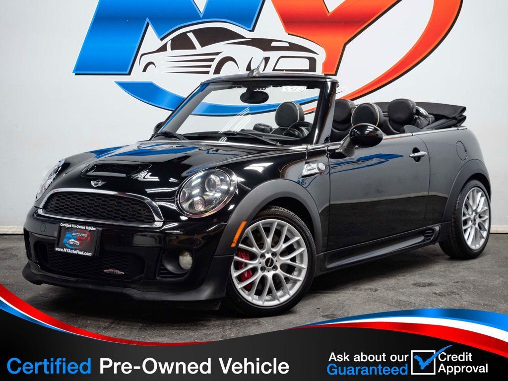Take a look at this 2013 Midnight Black Metallic MINI Cooper John Cooper Works Convertible with Carbon Black Leather Interior, a Clean Carfax and only 77,817 miles. This car has everything you could want in a car. It has a super clean history, a ton of options, low mileage and absolutely stunning looks. The impressive wheels and beautiful surfaces really make a statement. It comes equipped with a 1.6L 4-cylinder engine paired to an 6-speed Manual Transmission, Technology Package (with Harman/Kardon Premium Sound System, Comfort Access Keyless Entry, SiriusXM Satellite Radio), Navigation Package (with MINI Navigation, Smartphone Integration, Real Time Traffic Information), Wired Package (with Enhanced Bluetooth and USB, MINI Connected, Media Display, Voice-Command), Leather Seats, Sport Suspension, Xenon Headlights, Black Headlight Housings, White Turn Signal Lights, Heated Front Seats, Universal Garage Door Opener, Auto Dimming Rearview Mirror, Center Armrest, Cruise Control, AM/FM/HD Radio, Steering Wheel Controls, Power Windows, Power Locks, Air Conditioning and so much more. Every NY Auto Find vehicle comes with a complimentary Limited Warranty and a Carfax Vehicle Report. Our vehicles are priced to sell quickly. Please call to check availability and to schedule an appointment. -