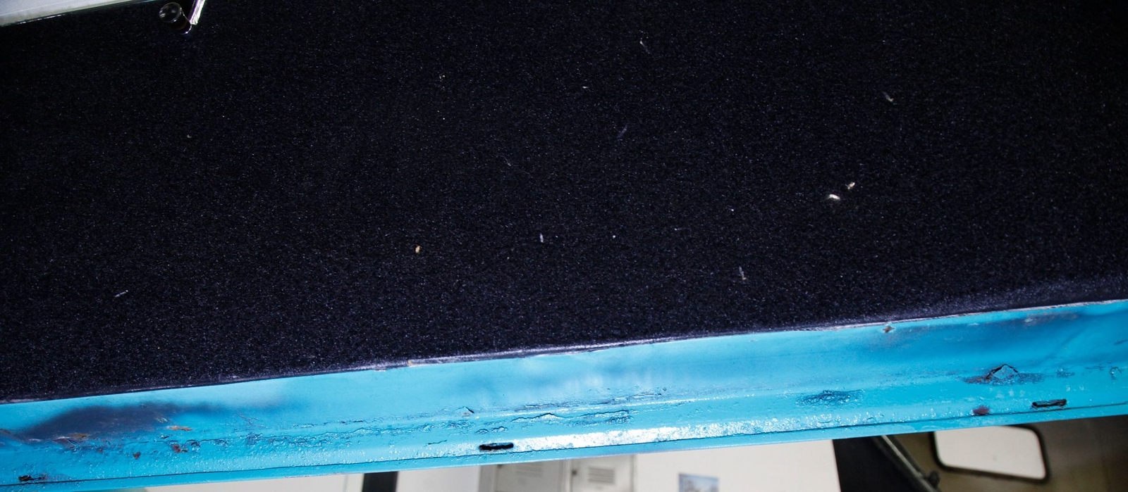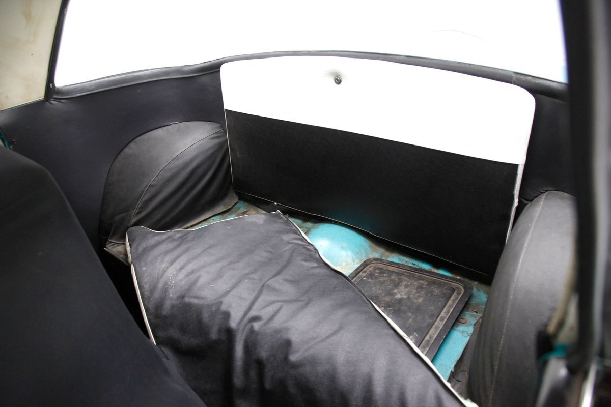 The utilitarian door panels in black and white vinyl show some soiling and wrinkling on each side and house the window crank and door handle. Chromed trimming separates the colors and adds some bling to the utilitarian look. Slipping inside using my shoehorn, I'm on a front bench with a split back so one has access to the rear area. These are covered in aqua vinyl and have tight tuck and roll inserts, smooth vinyl bolsters and a central smooth pattern. They are in surprisingly good condition for the age and provide decent comfort for my larger frame. Note the rear bench lower has been removed and we see the rear panel has a lock in the center which gives access to the trunk. An original aqua dash in steel is fronted by a large 2 spoke black steering wheel and gives view to the nice chromed bezel surrounding a centrally located round speedo gauge cluster. A nifty dial tuner and volume control radio is in the dash center and a few other simple knobs and pulls line up along the bottom. Black carpeting is on the floors, and a stained white headlight hangs tightly above.