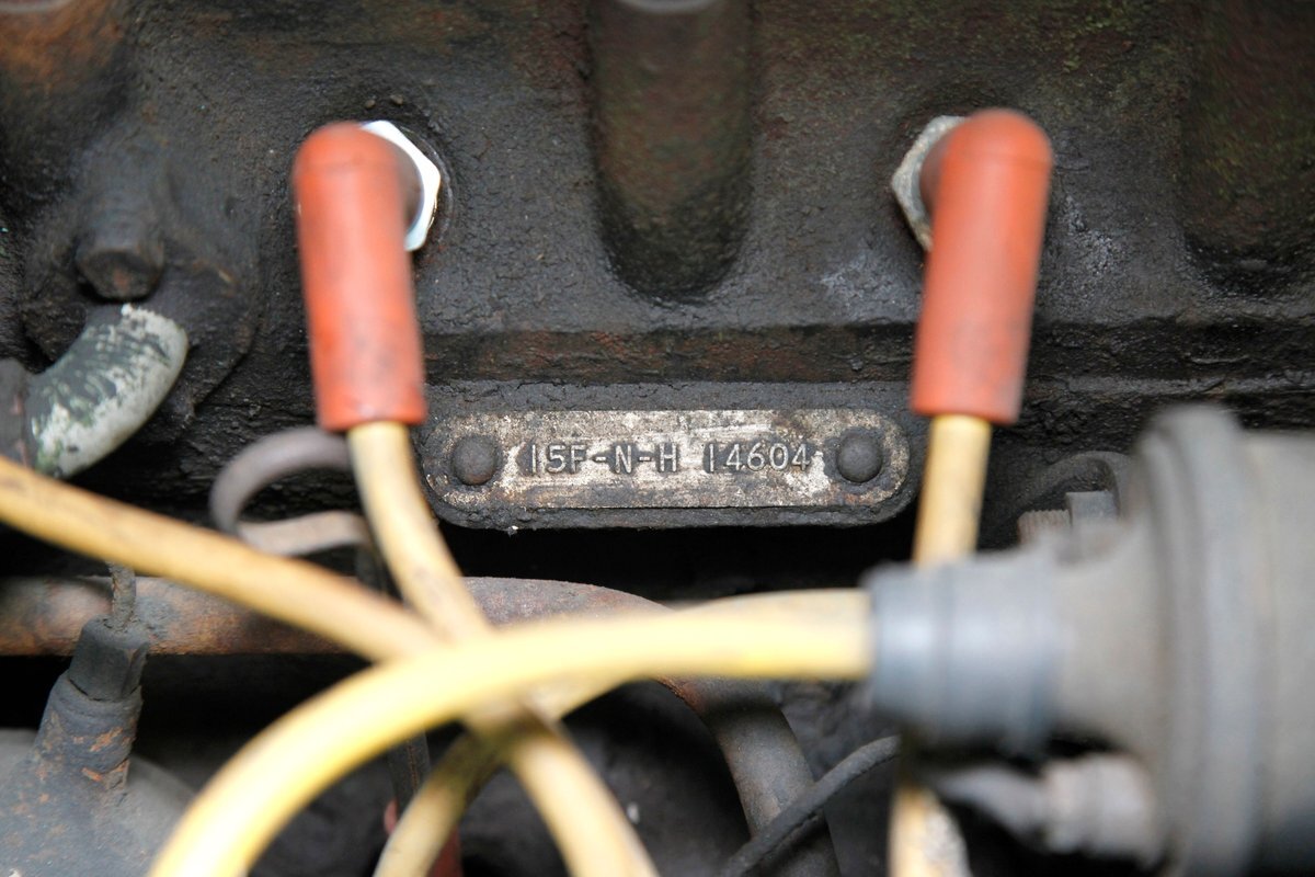 A flip of the hood and we see the original 90.89ci BMC engine in 4-cylinder format with a black block and green valve cover and 1-barrel Zenith carb under the black air cleaner. The engine and bay present as complete with a healthy dose of patina. A 3-speed manual transmission is on back sending power to a 4.22 geared axle.