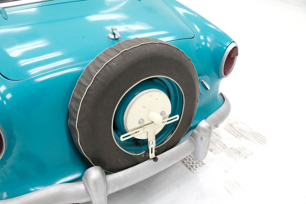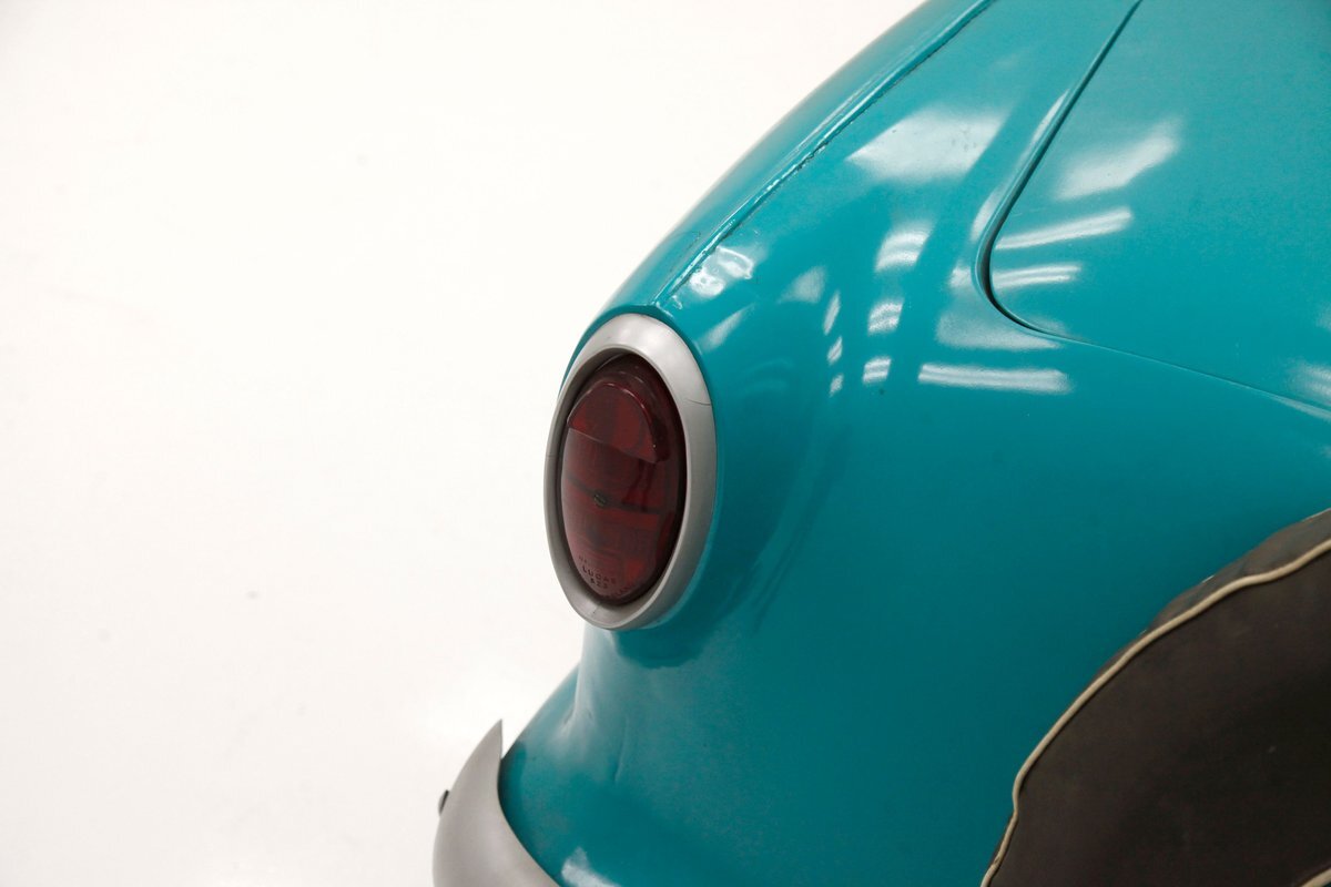 So we have the smallest car with a feature ubiquitous to the largest car...the "Continental", (think big car), rear tire enclosure...go figure! This metal bean has been refinished in a two tone aqua and white that presents with chips, inclusions, and cracks in the body work. Exterior panels otherwise retain decently minded gaps for the steel. An accentuated dip in the door and lower body bulge give a somewhat boat-like appearance to the body and what little chrome we see has dimpling or has been painted silver. A white roof hovers over the aqua body and the roofline is just lovely, with the triangular "B" pillar holding fort for the curved rear glass. Oval tail lights are flanking the rear mounted spare tire enclosure, wrapped in a black cover with a cream retainer. This cream appears again on the painted egg crate oval grille with a single headlight mounted on the corner of each front quarter. Beep! Beep!