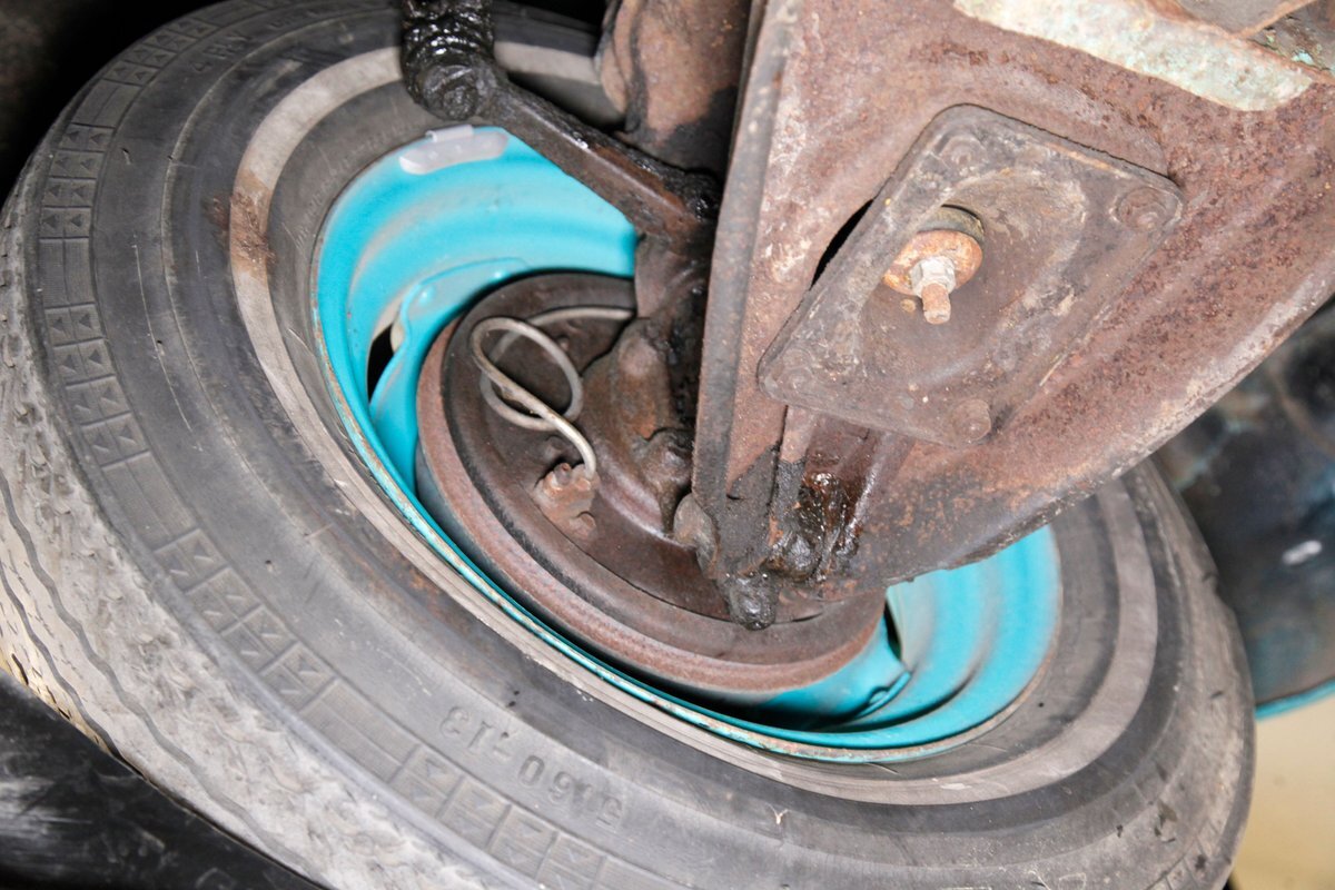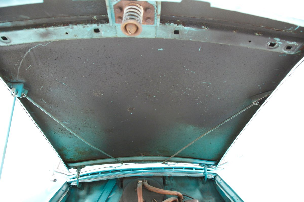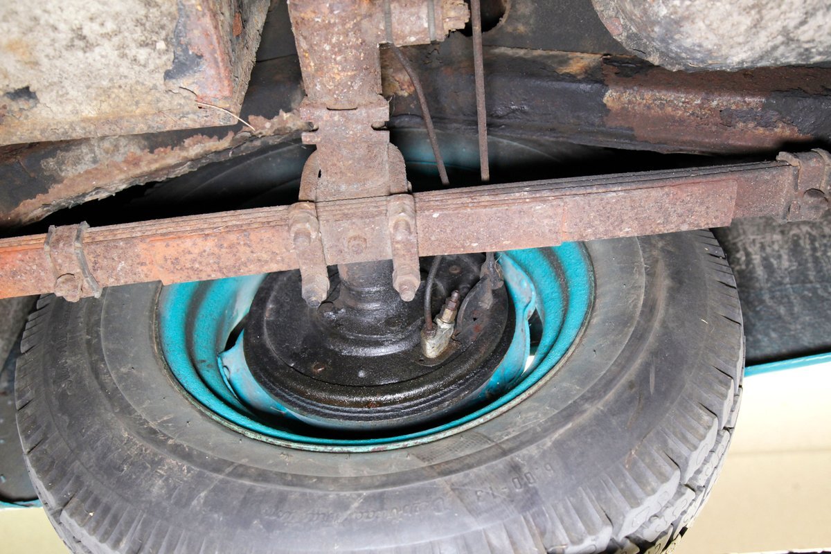 Some patina, undercoating and surface rust make an appearance down below. But the areas of concern are the flooring, rockers, crossmembers, and frame that are all suffering from invasive rust with some areas being in need of immediate remediation. Independent coil sprung front suspension, and leaf springs for the back provide the ride. Drum brakes are on all 4 corners.