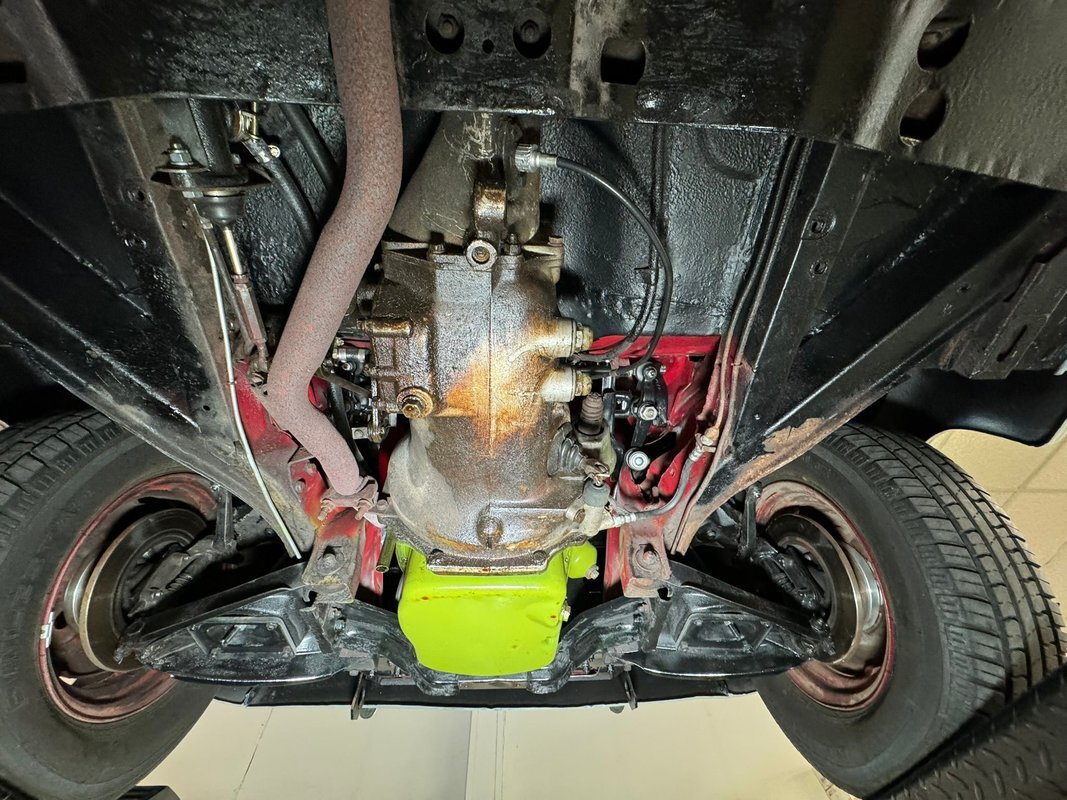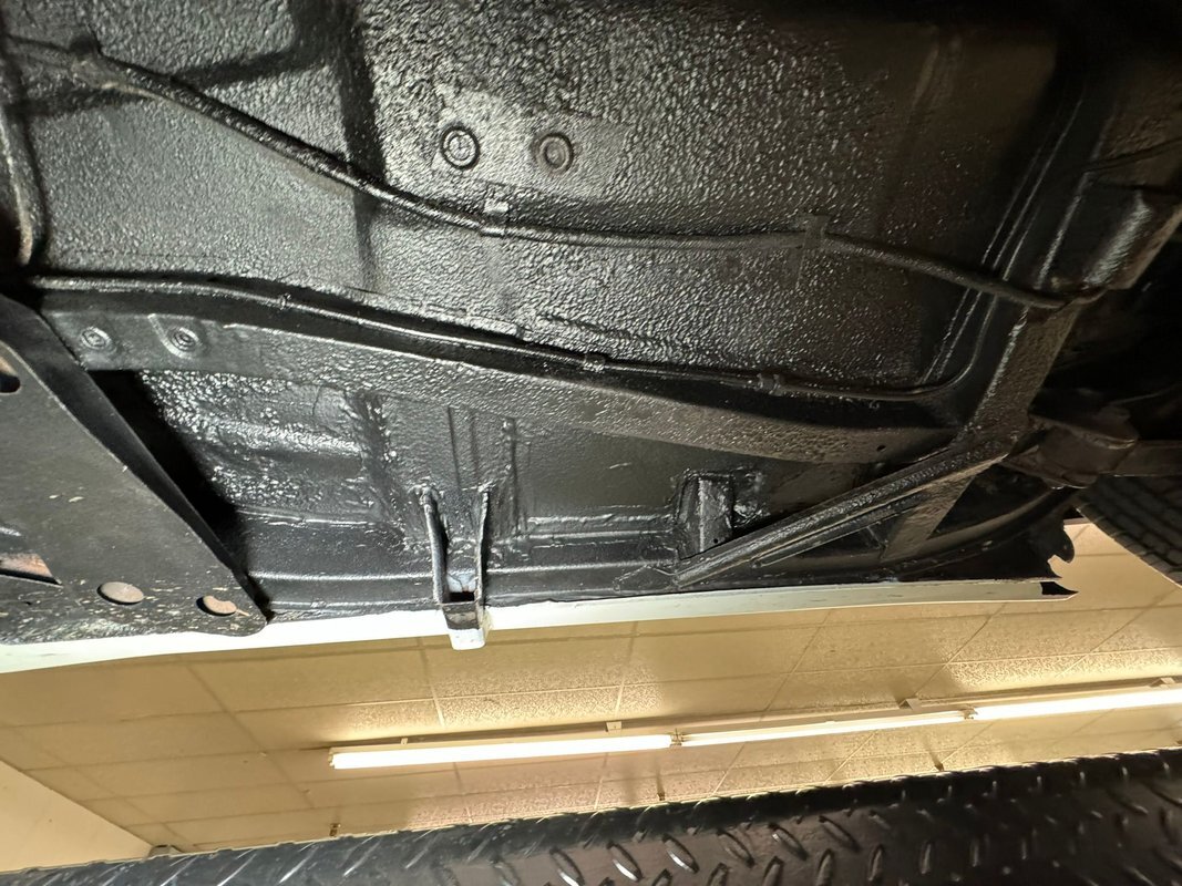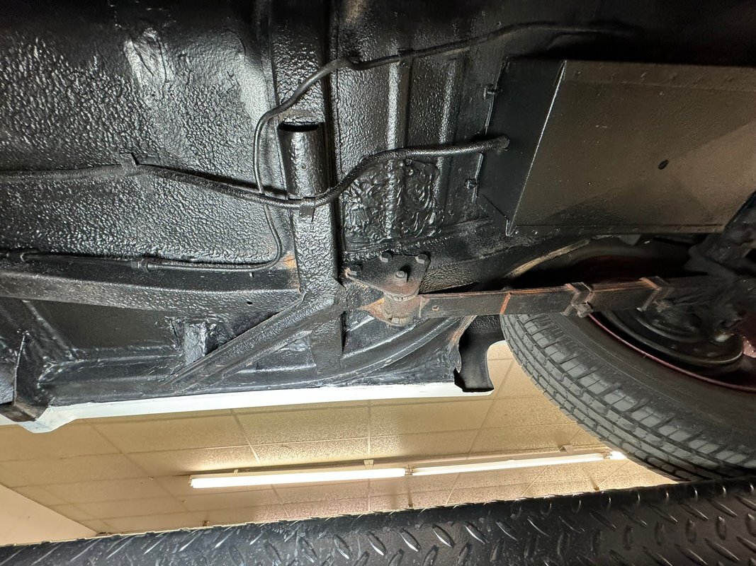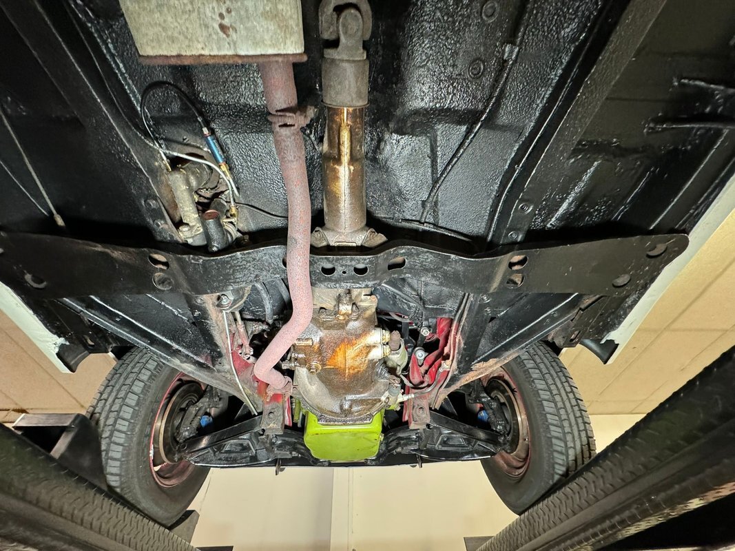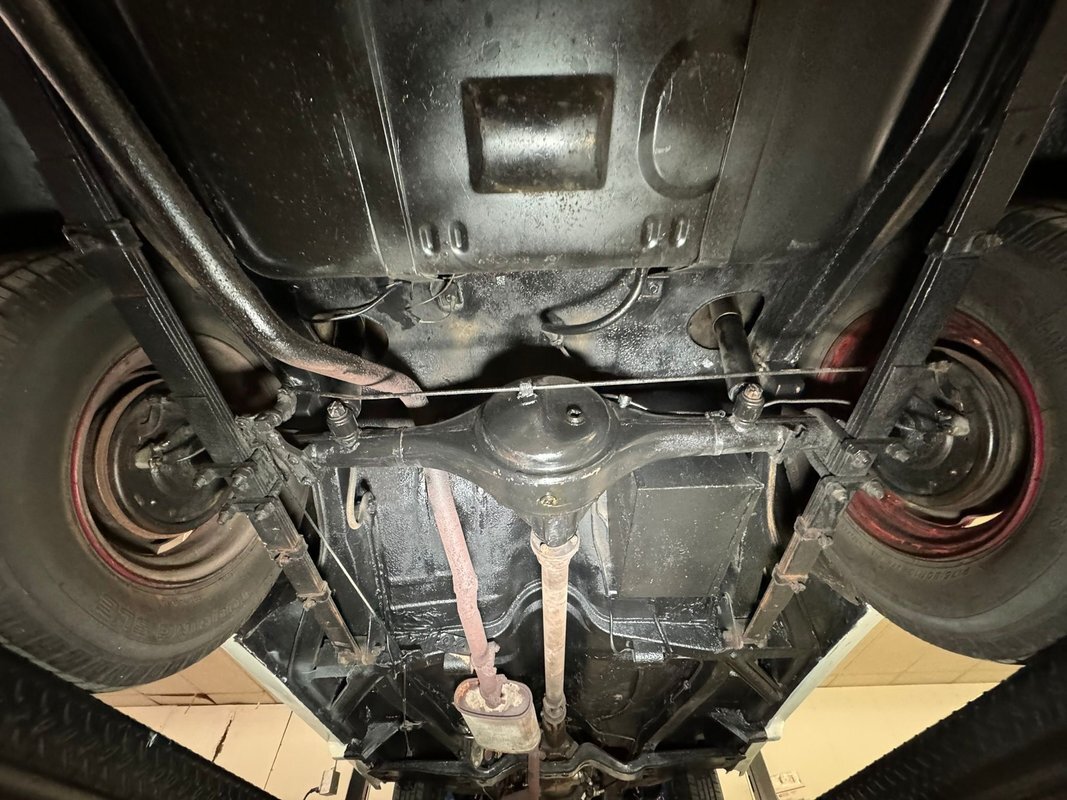 All black and no surface rust, and sprayed on rustproofing is seen on the underside steel floor pans and frame. Independent coil sprung front suspension, and leaf springs for the back provide the ride. 4 wheel disc brakes provide the stopping power.