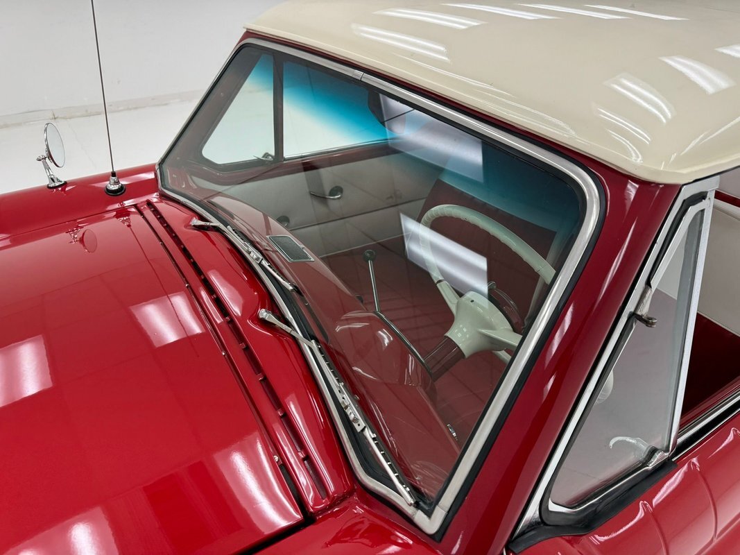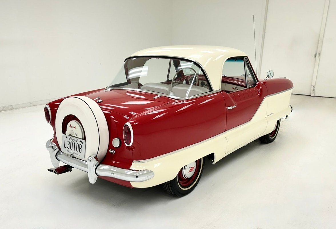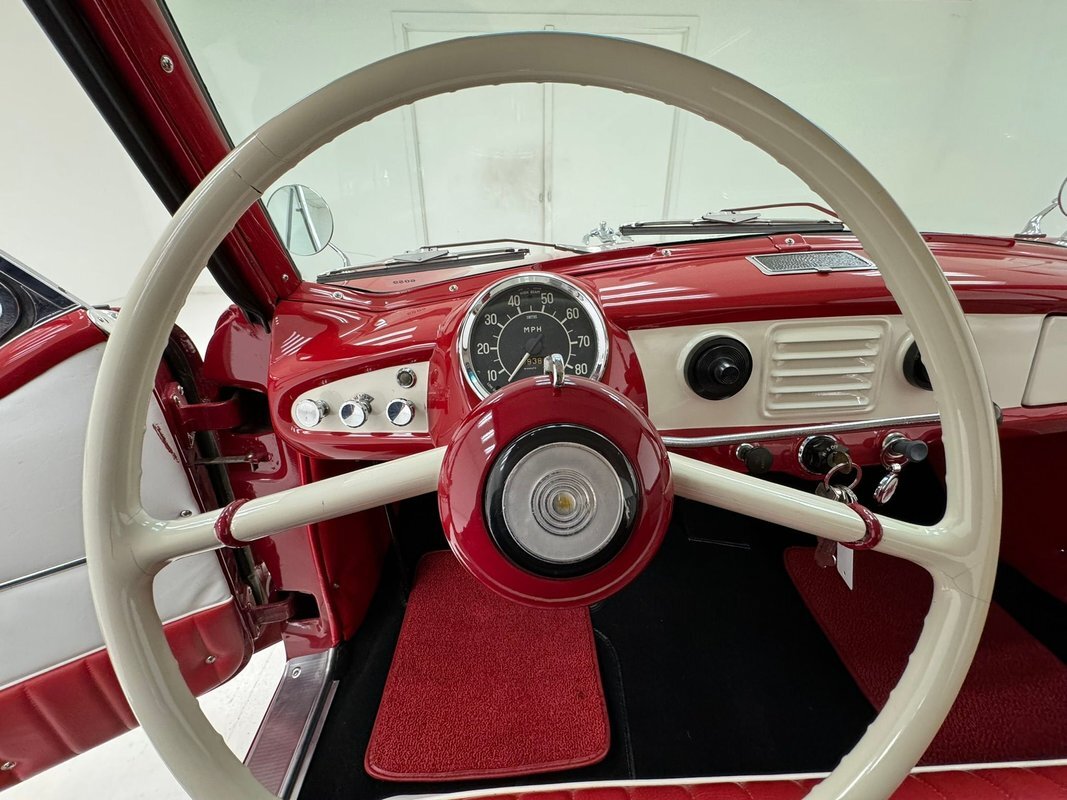 The utilitarian door panels in white vinyl and screwed on along each side house the window crank and door handle. A thin band of chromed trimming races through the white vinyl and adds some bling to the utilitarian. Slipping inside using my shoehorn, I'm on a front bench with a split back so one has access to the back bench. Both these are covered in red tuck and roll vinyl inserts and have white vinyl bolsters and back of seat uppers. They are just pristine. Note the rear bench has a lock in the center which gives access to the trunk. Wheel well covers are also bathed in red vinyl. A red steel top and bottom painted dash with a white painted center is in great condition and stretches across the front. A nice chromed bezel is surrounding a centrally located round speedo gauge cluster, and the steering wheel is fronting the dash which is white painted plastic. A nifty big black dial tuner and volume control AM radio is in the dash center and a few other simple knobs and pulls line up along the bottom of the dash. On the passenger side a N A S H badge has been painted on the door. Black carpeting is on the floors, and a whitey tightey headliner which appears as new is above.