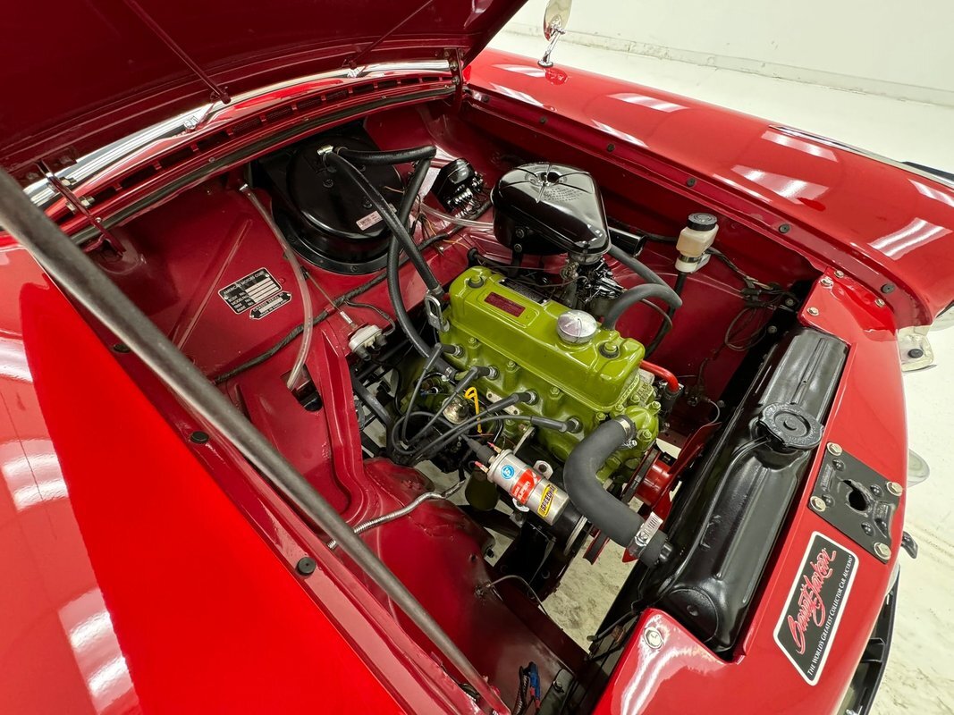 A flip of the hood and we see a fully restored and pea green repainted 1489cc engine courtesy of Austin in 4-cylinder format. It has a rounded triangular air cleaner covering a 1-barrel Zenith carburetor. On the back is a 3 speed manual transmission with a new clutch. The rear axle is 4.22. This engine bay has had every piece restored or rebuilt and it all appears as showroom new and then some.