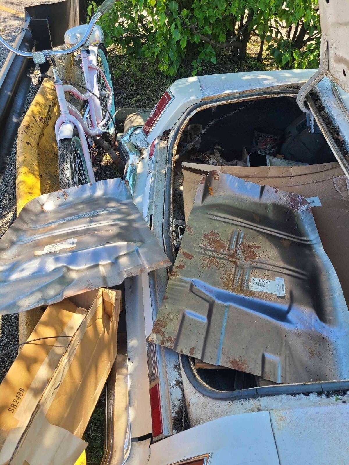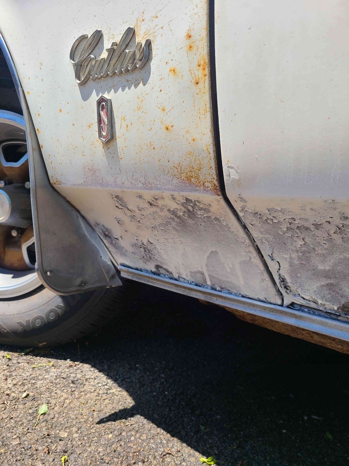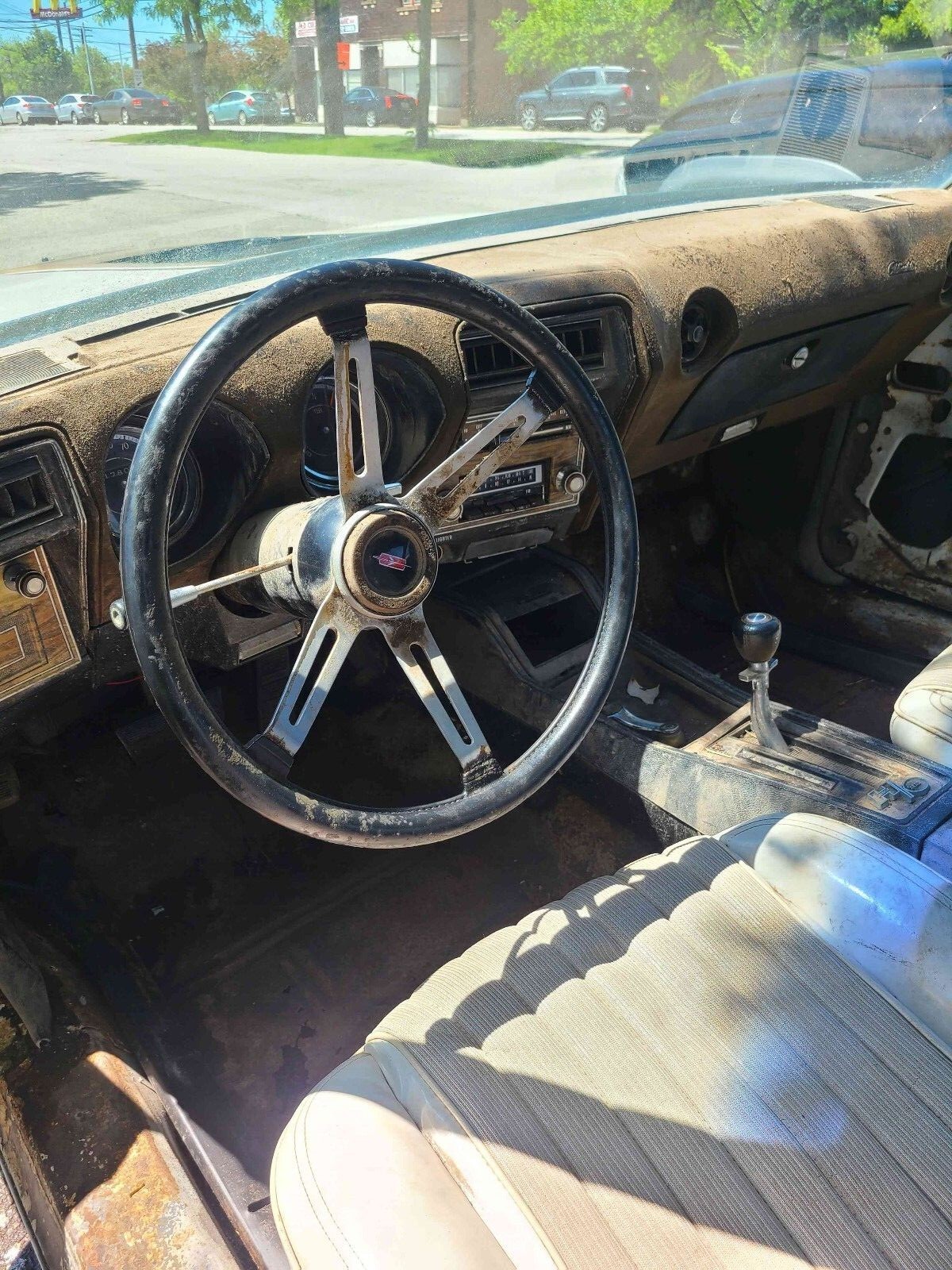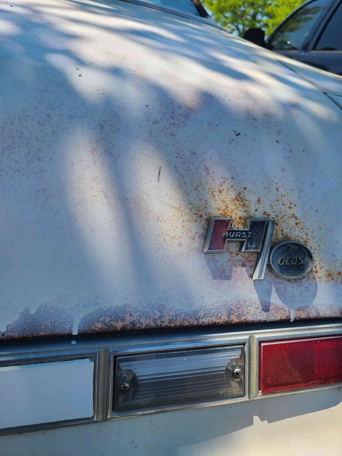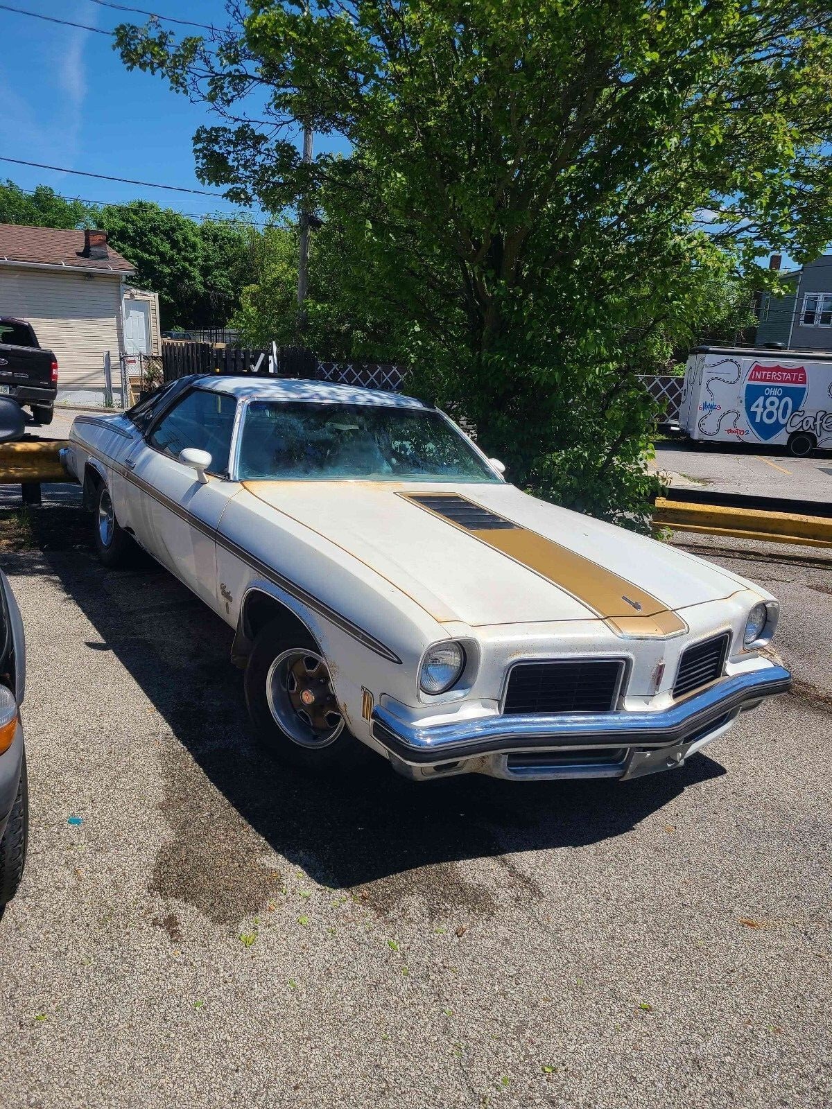 1974 Cutlass hurst 350 engine, runs and drives, has alot of surface rust and few holes in the body please see photos, frame in good shape, holes in floor pans but it comes with new floor pans see photos they are in the trunk, all the trim and panels come with it they are in a box, swivel bucket seats are attached to the floor, needs carpet, runs loud will need exhaust work, no cracks in windshield, manual locks and windows, clean title in hand