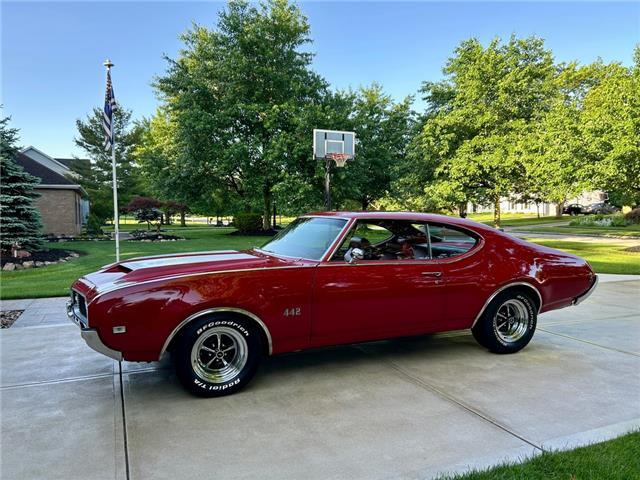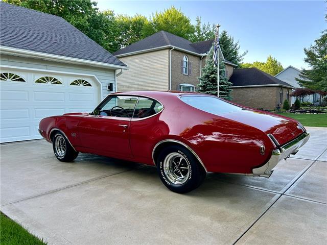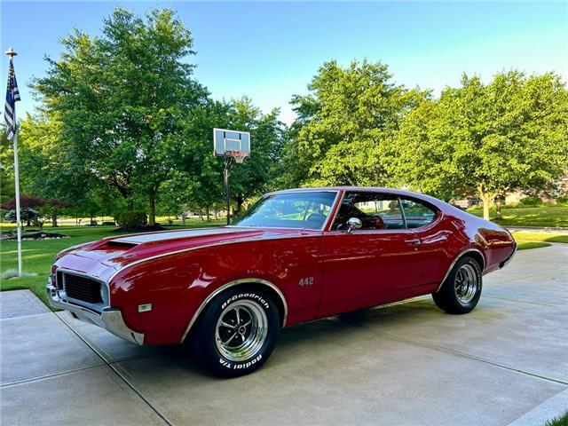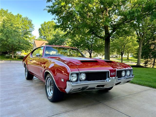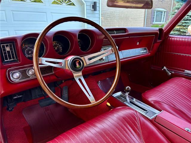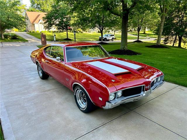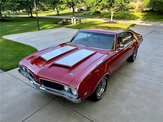 GORGEOUS RED PAINT WITH A BEAUTIFUL LUSTER THROUGHOUT! UPGRADED TO A 1970 442 HOOD WITH CHROME LOCKING HOOD PINS AND WHITE STRIPPING. THE ORIGINAL 1969 BASE WAS BEAUTIFULLY GRAFTED TO THE TOP OF A 1970 HOOD SO EVERYTHING LINES UP PERFECTLY. THE PAINT SHOWS GORGEOUS THROUGHOUT. THERE IS SOME MINOR CHECKING ON THE HOOD.