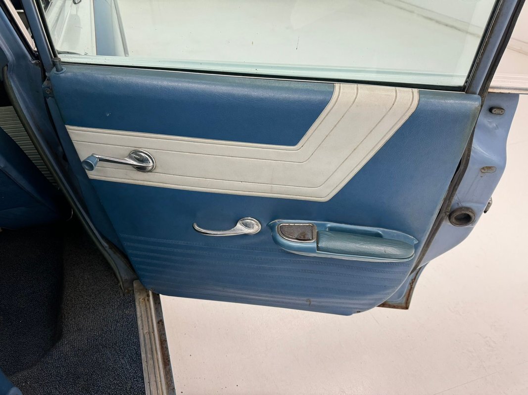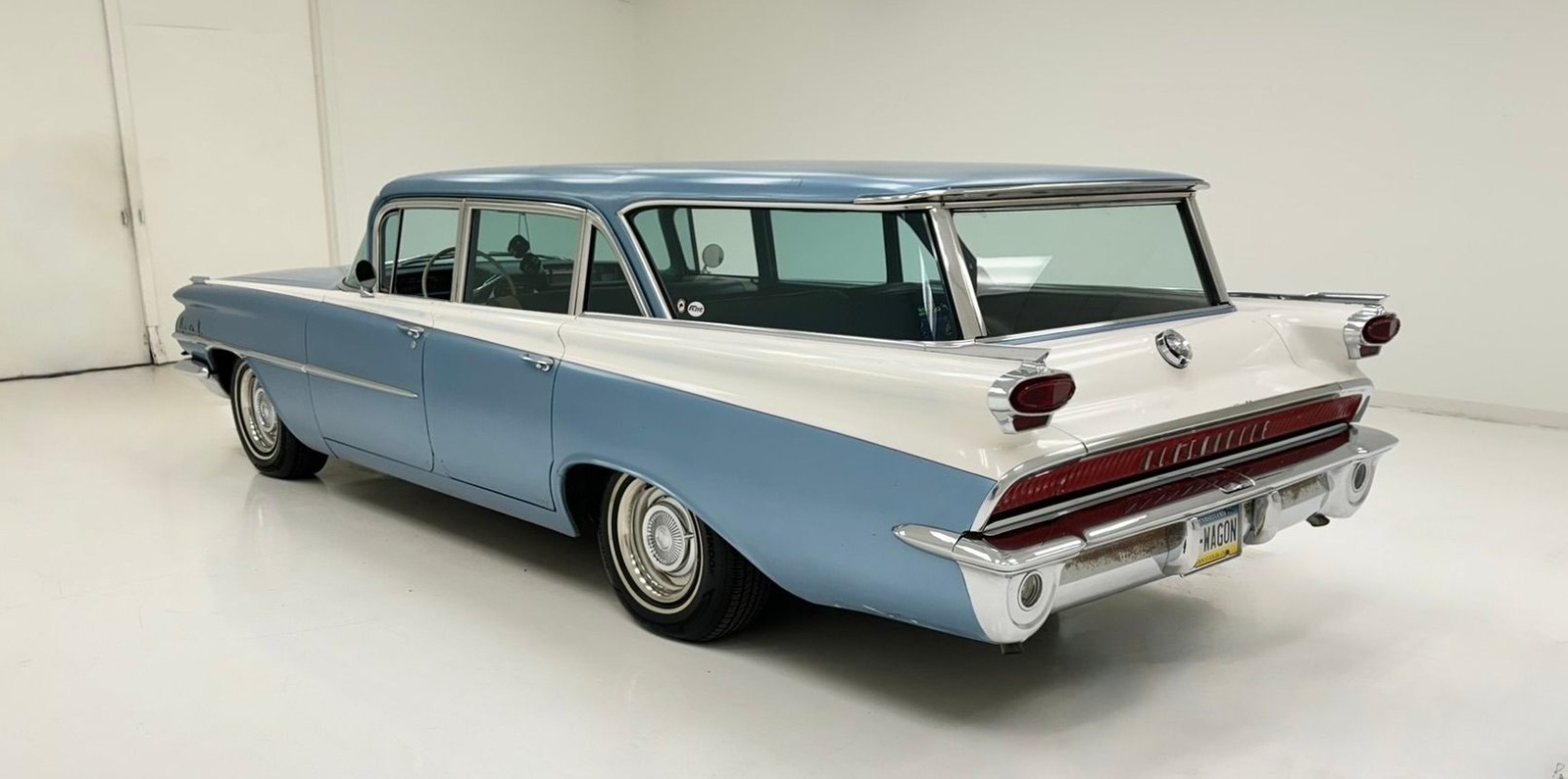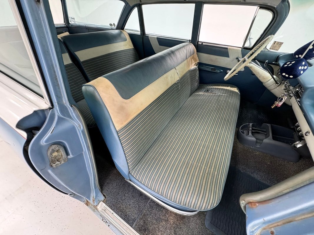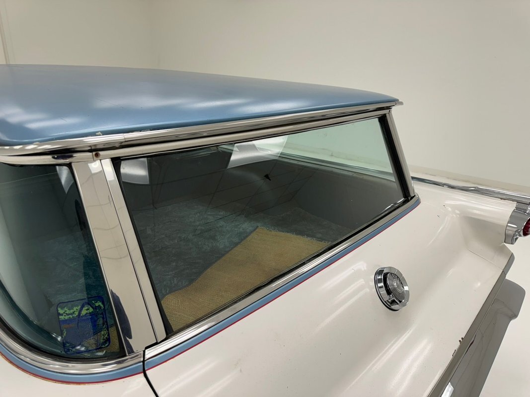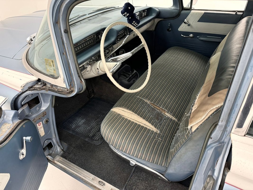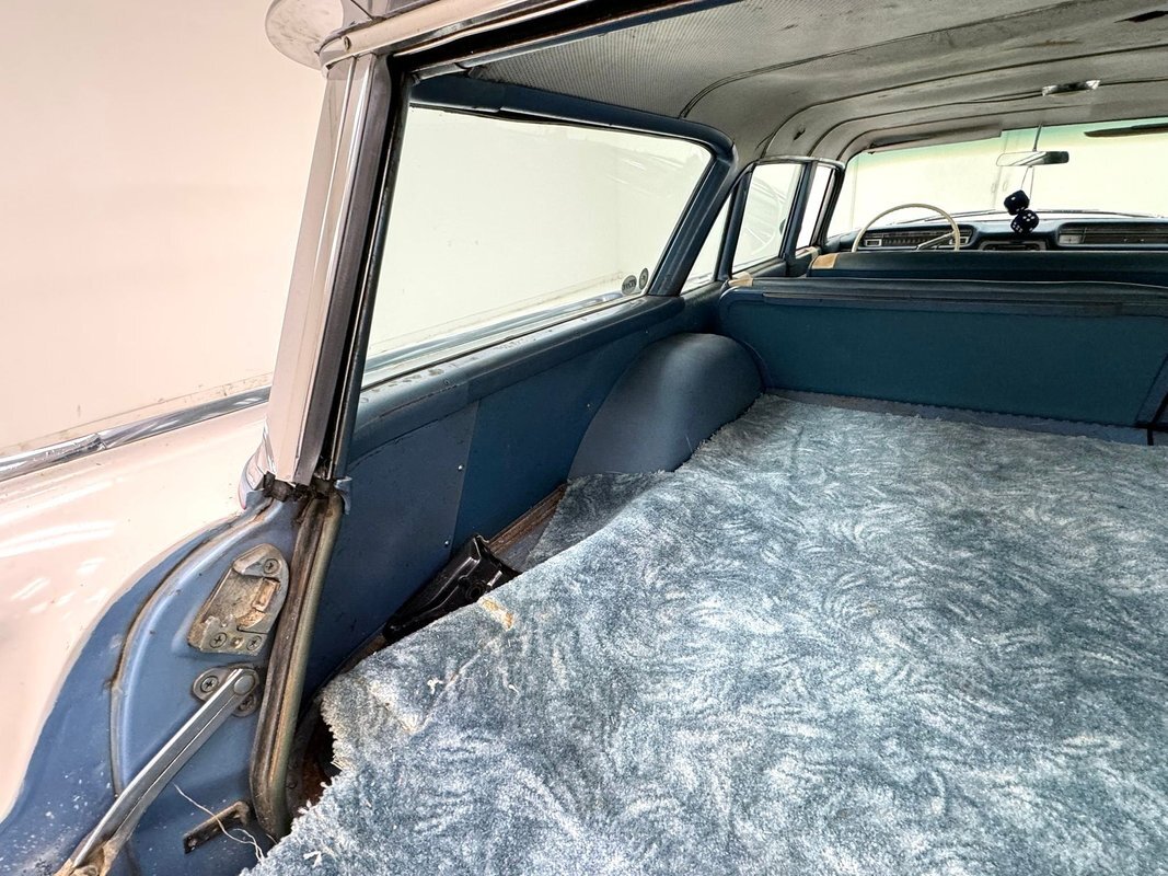 From an era when men were men and women were housewives, kids sat in the back or stood in the hump and families went on vacations and actually talked to each other and not on their cell phones. This massive steel slab sided and finned creation has wrap around front and rear glass, plenty of chrome and is presented in a two tone Frost Blue and Polar White paint job. A large shaver style grille, dual headlights, wide bumpers and jet age front quarter ornaments that create the delineation between the white and blue with an ever widening contrail as it streaks to the back of this wagon's tailgate. On the way it passes by 4 doors, a front quarter mid level trim spear, wide window trimmings and a sleek roofline in blue. The back of the car is like a wide grinning face with a white tailgate, tall rear glass and small fins with oval tail lights on their edges. The grin is a wide red strip that stretches from edge to edge and has turned down edges with chromed surrounds. Fancy round tail lights reside in two drops of chrome formed by the rear bumper as it conforms to the bottom of the rear quarters. Overall paint has a few chips and some dulling, rust areas in the seams and doors underlying and scratches. The chrome is slightly pitted, and also has some scratches, but overall considering its age and the amount of metal, it presents pretty well. And the design is late 50's wretched excess.