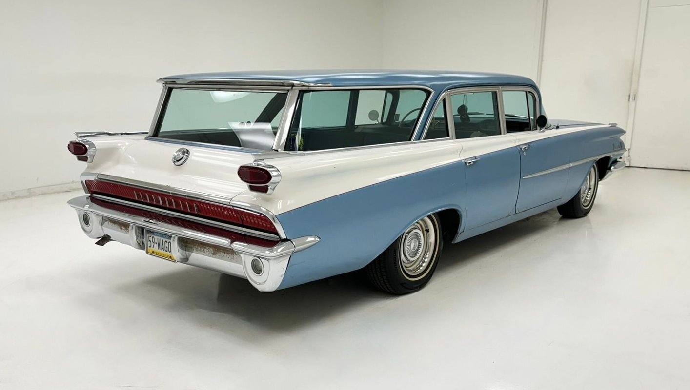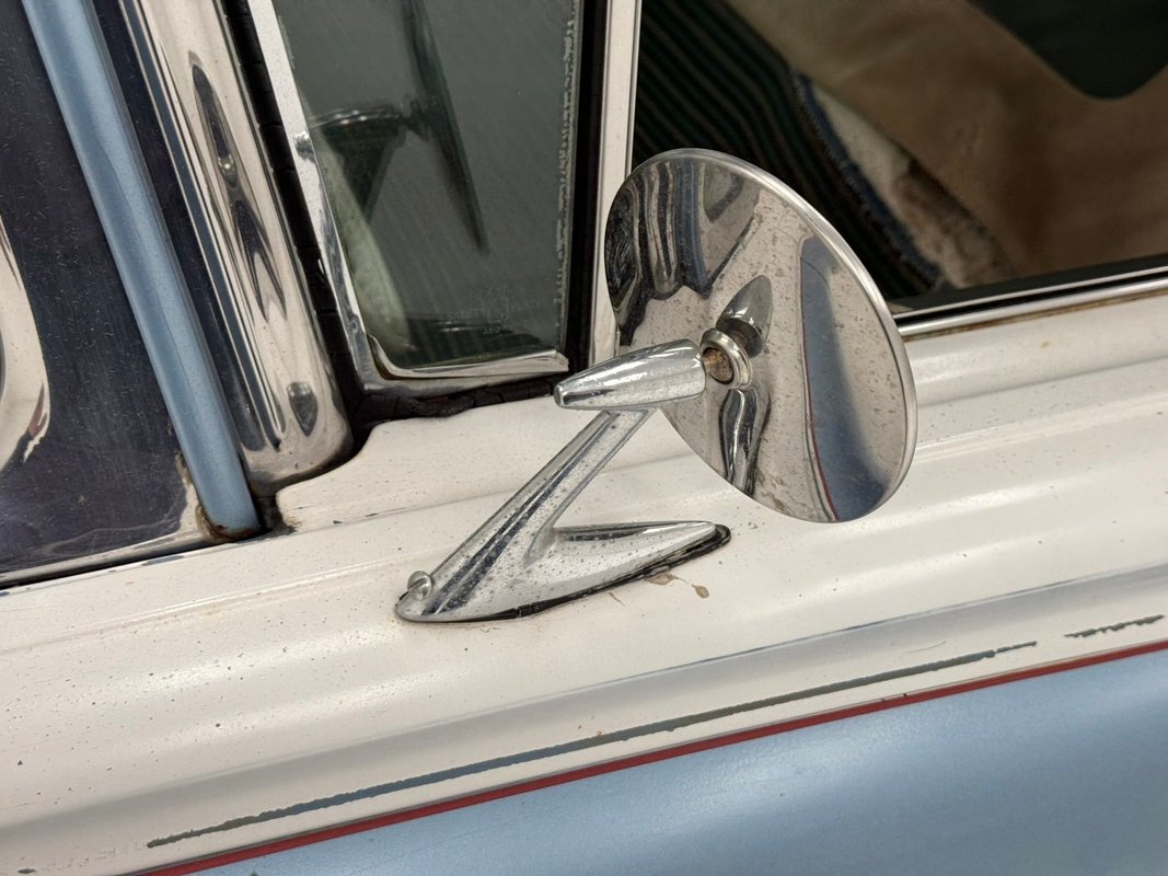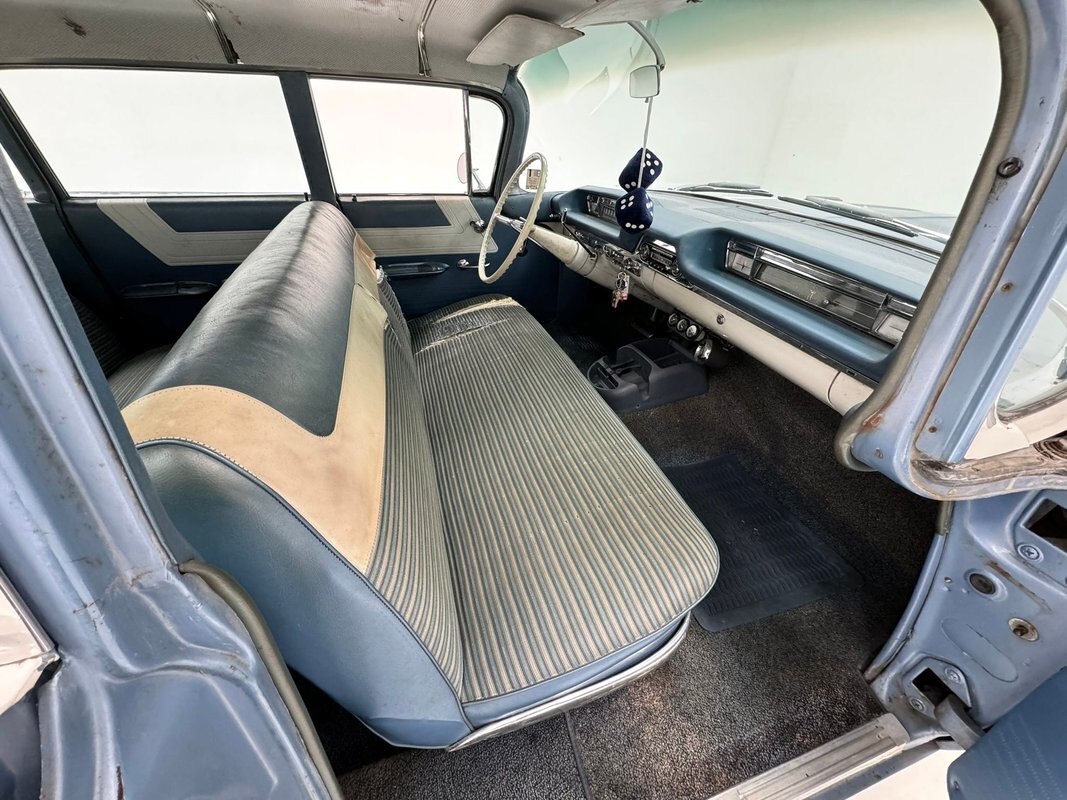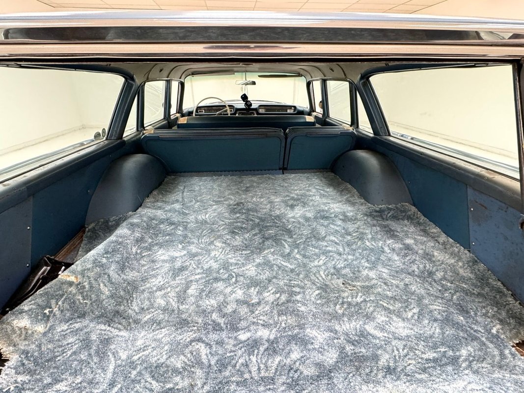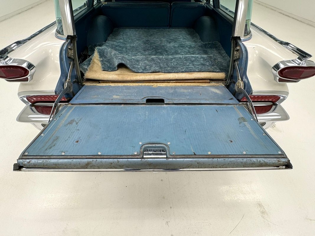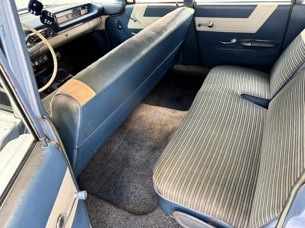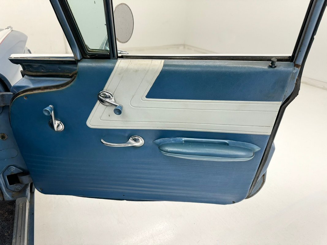 From an era when men were men and women were housewives, kids sat in the back or stood in the hump and families went on vacations and actually talked to each other and not on their cell phones. This massive steel slab sided and finned creation has wrap around front and rear glass, plenty of chrome and is presented in a two tone Frost Blue and Polar White paint job. A large shaver style grille, dual headlights, wide bumpers and jet age front quarter ornaments that create the delineation between the white and blue with an ever widening contrail as it streaks to the back of this wagon's tailgate. On the way it passes by 4 doors, a front quarter mid level trim spear, wide window trimmings and a sleek roofline in blue. The back of the car is like a wide grinning face with a white tailgate, tall rear glass and small fins with oval tail lights on their edges. The grin is a wide red strip that stretches from edge to edge and has turned down edges with chromed surrounds. Fancy round tail lights reside in two drops of chrome formed by the rear bumper as it conforms to the bottom of the rear quarters. Overall paint has a few chips and some dulling, rust areas in the seams and doors underlying and scratches. The chrome is slightly pitted, and also has some scratches, but overall considering its age and the amount of metal, it presents pretty well. And the design is late 50's wretched excess.