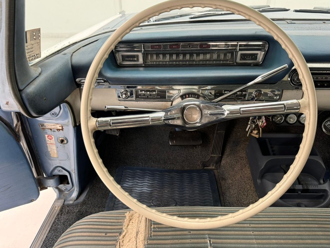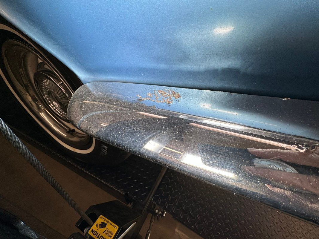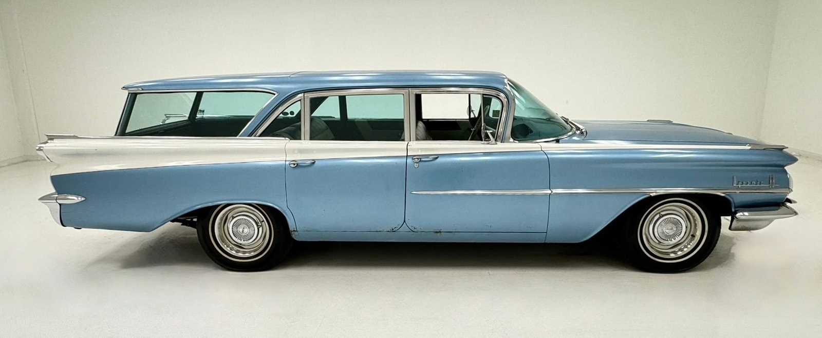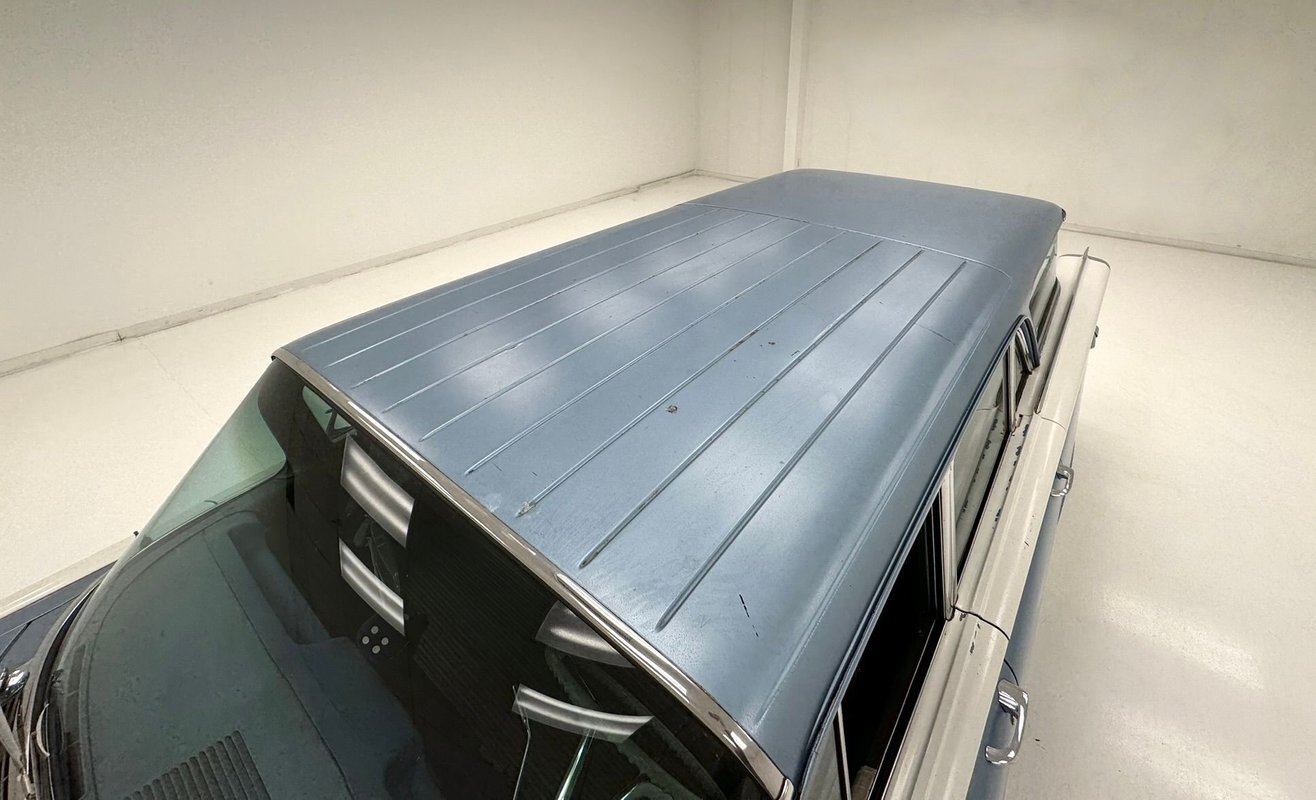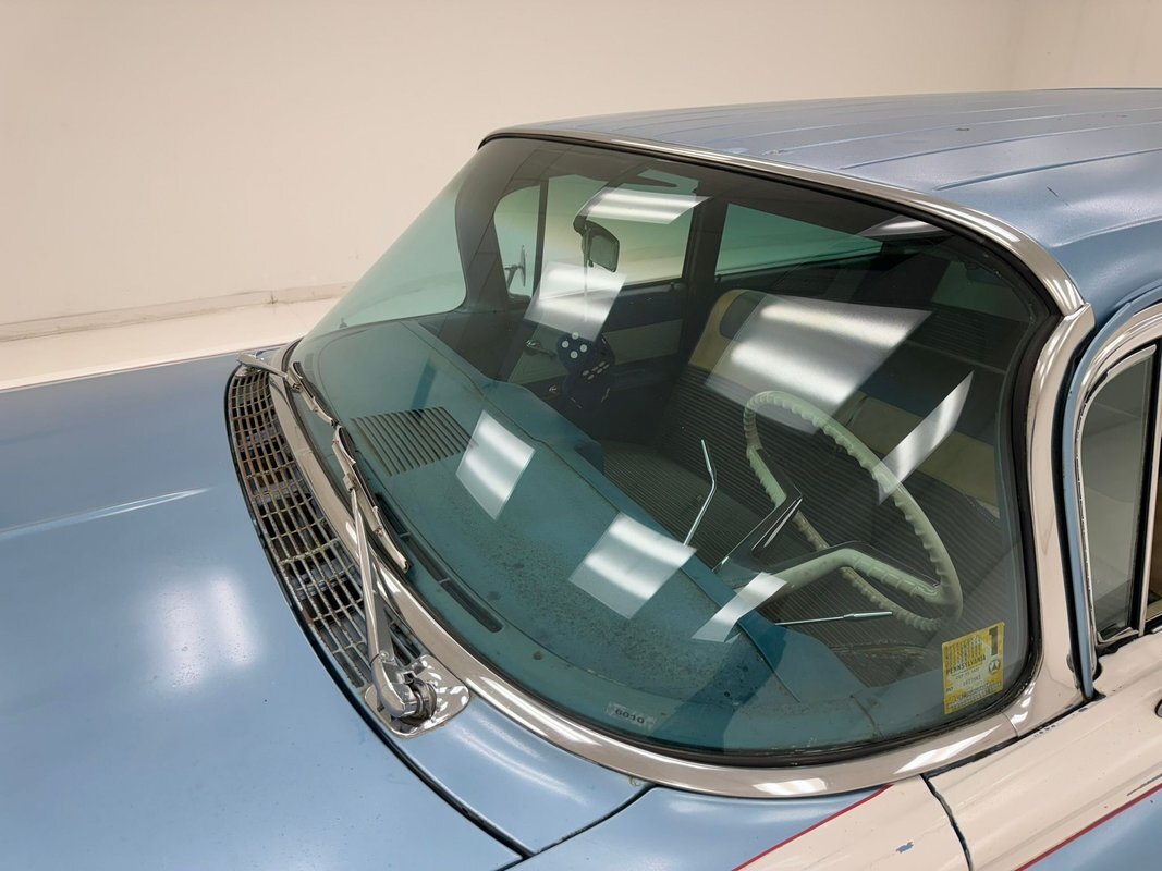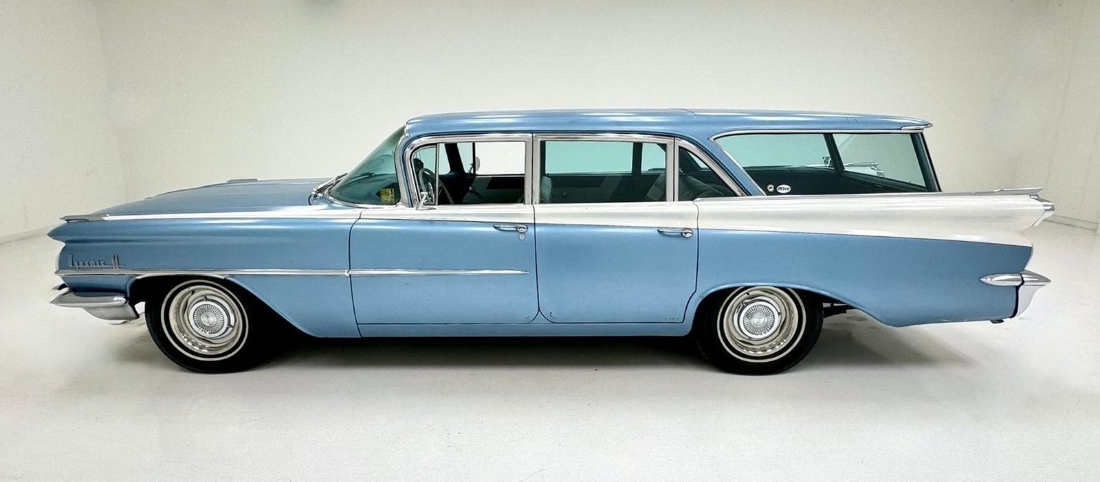 From an era when men were men and women were housewives, kids sat in the back or stood in the hump and families went on vacations and actually talked to each other and not on their cell phones. This massive steel slab sided and finned creation has wrap around front and rear glass, plenty of chrome and is presented in a two tone Frost Blue and Polar White paint job. A large shaver style grille, dual headlights, wide bumpers and jet age front quarter ornaments that create the delineation between the white and blue with an ever widening contrail as it streaks to the back of this wagon's tailgate. On the way it passes by 4 doors, a front quarter mid level trim spear, wide window trimmings and a sleek roofline in blue. The back of the car is like a wide grinning face with a white tailgate, tall rear glass and small fins with oval tail lights on their edges. The grin is a wide red strip that stretches from edge to edge and has turned down edges with chromed surrounds. Fancy round tail lights reside in two drops of chrome formed by the rear bumper as it conforms to the bottom of the rear quarters. Overall paint has a few chips and some dulling, rust areas in the seams and doors underlying and scratches. The chrome is slightly pitted, and also has some scratches, but overall considering its age and the amount of metal, it presents pretty well. And the design is late 50's wretched excess.