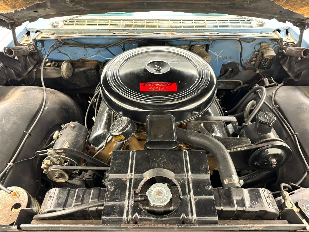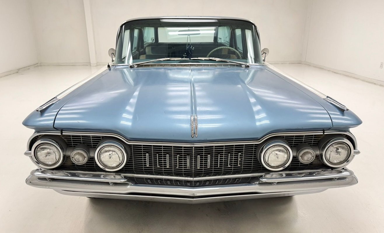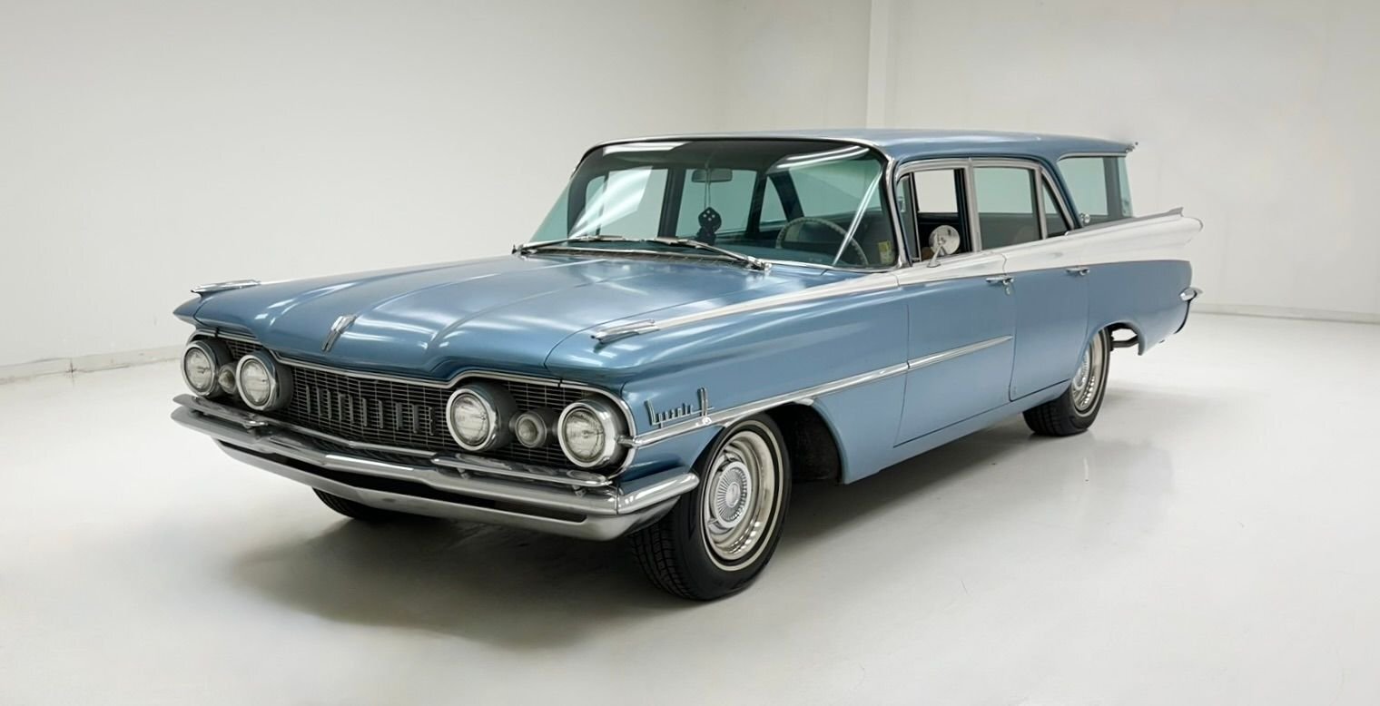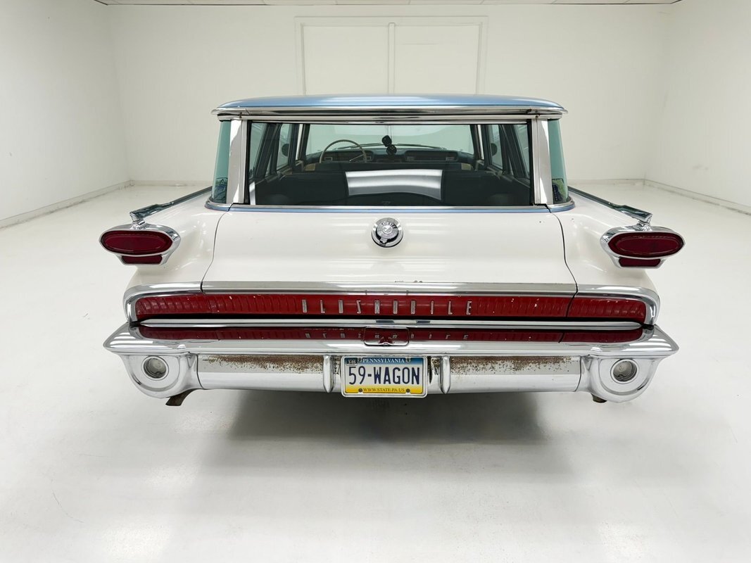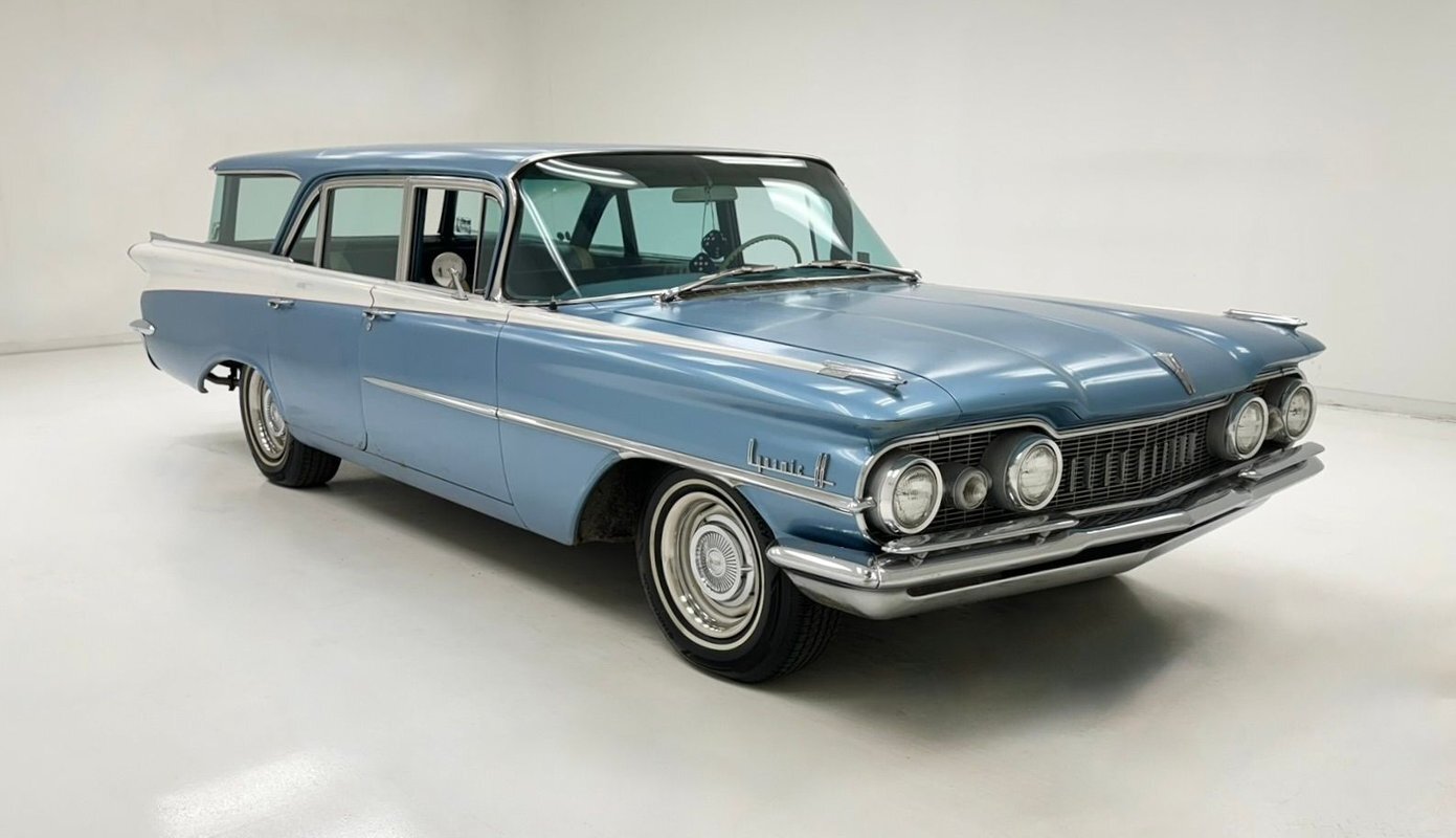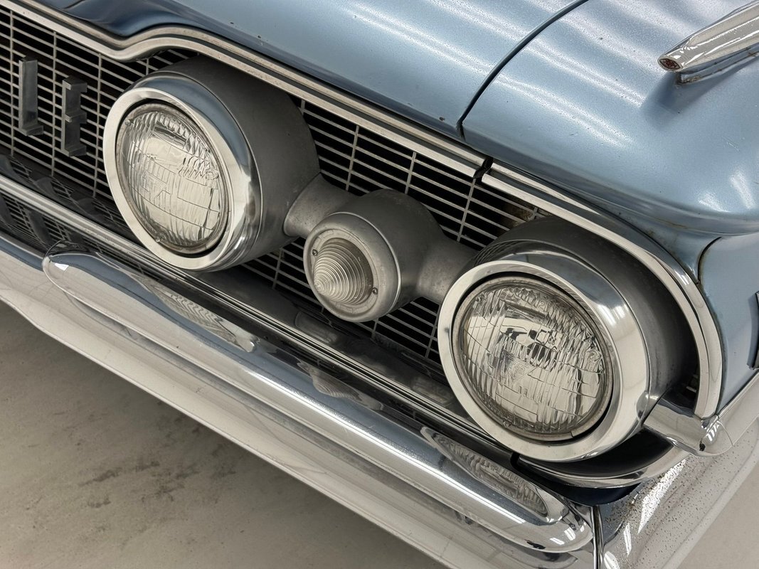 From an era when men were men and women were housewives, kids sat in the back or stood in the hump and families went on vacations and actually talked to each other and not on their cell phones. This massive steel slab sided and finned creation has wrap around front and rear glass, plenty of chrome and is presented in a two tone Frost Blue and Polar White paint job. A large shaver style grille, dual headlights, wide bumpers and jet age front quarter ornaments that create the delineation between the white and blue with an ever widening contrail as it streaks to the back of this wagon's tailgate. On the way it passes by 4 doors, a front quarter mid level trim spear, wide window trimmings and a sleek roofline in blue. The back of the car is like a wide grinning face with a white tailgate, tall rear glass and small fins with oval tail lights on their edges. The grin is a wide red strip that stretches from edge to edge and has turned down edges with chromed surrounds. Fancy round tail lights reside in two drops of chrome formed by the rear bumper as it conforms to the bottom of the rear quarters. Overall paint has a few chips and some dulling, rust areas in the seams and doors underlying and scratches. The chrome is slightly pitted, and also has some scratches, but overall considering its age and the amount of metal, it presents pretty well. And the design is late 50's wretched excess.