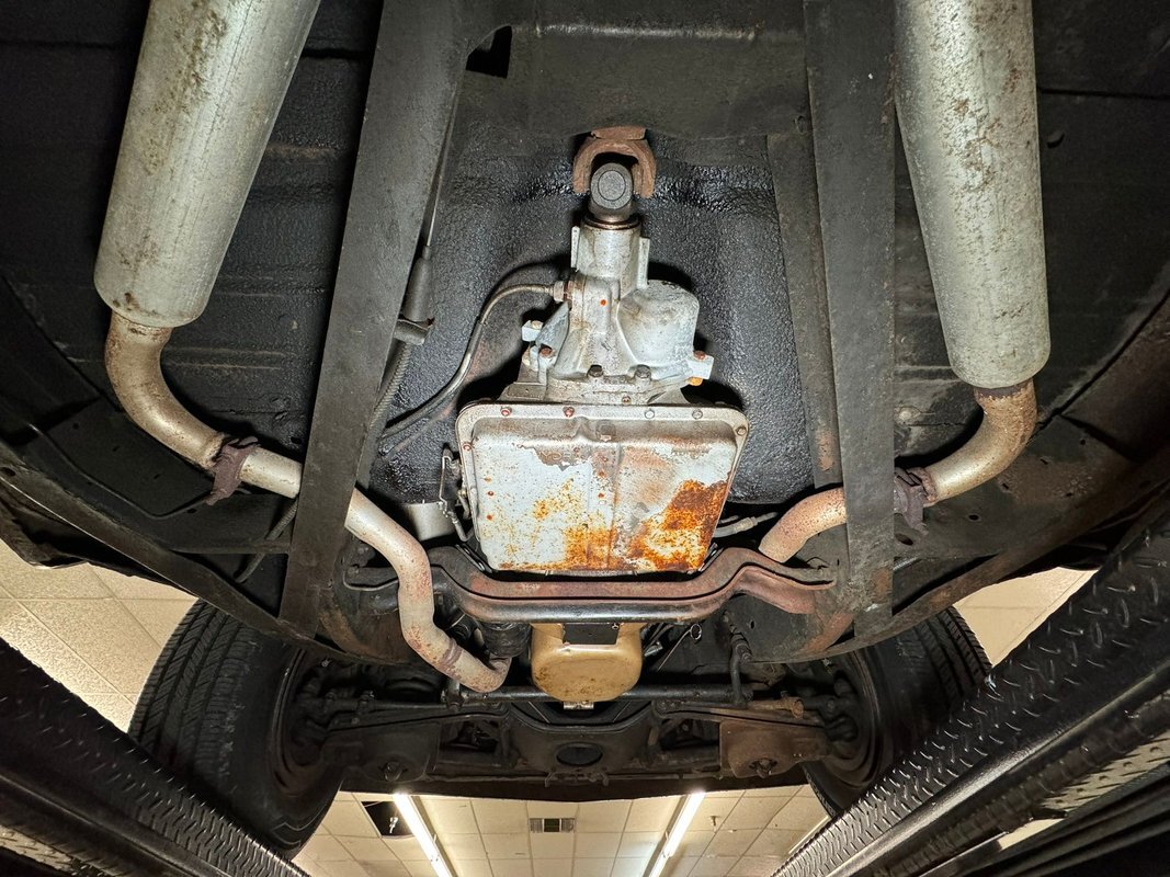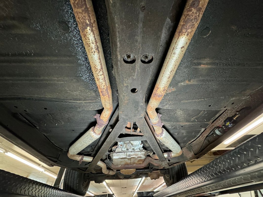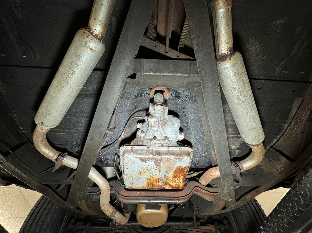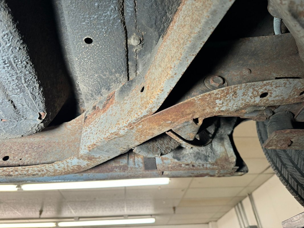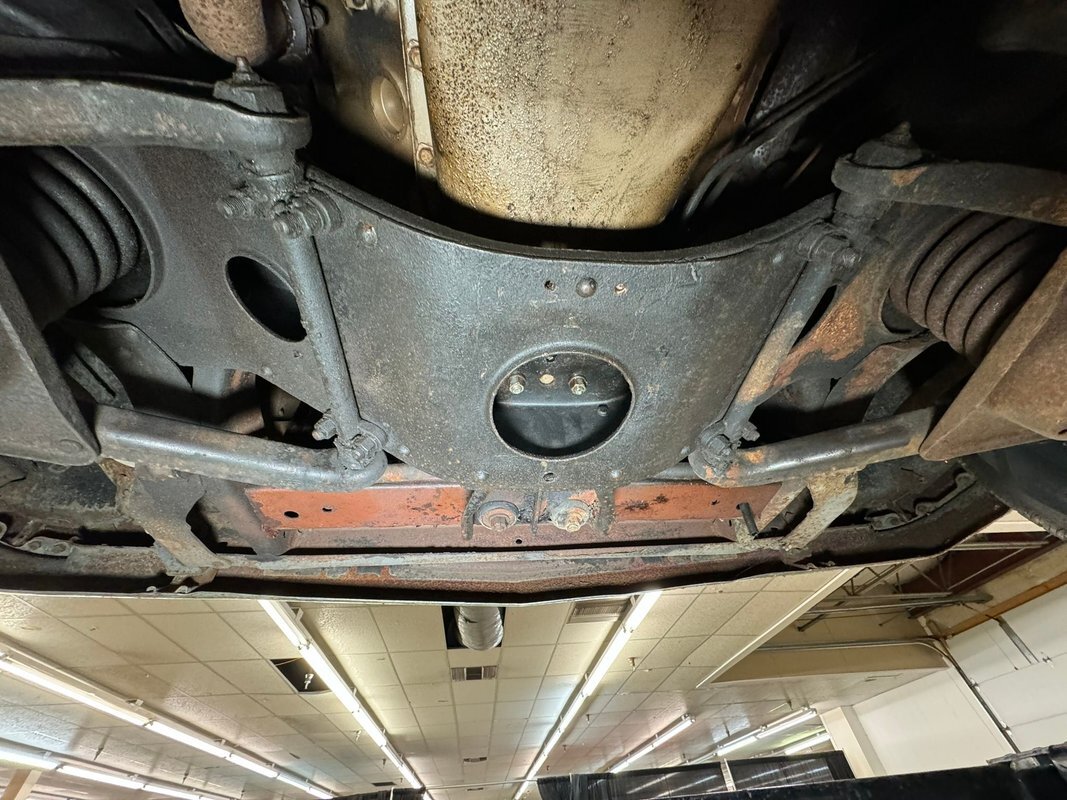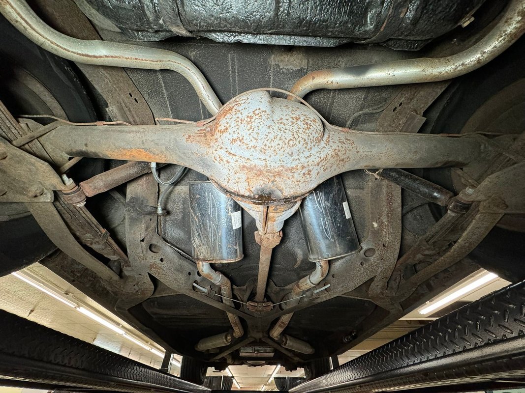 Under this long steel beauty we see some light to moderate surface rust in the X frame and some suspension parts. Floor pans are solid and fenders are rust free with just some road dirt caked on them. Suspension is independent coil springs for the fort and leaf springs for the rear. Drum braking is on all 4 corners. Fairly simple and some new mufflers are seen under here.