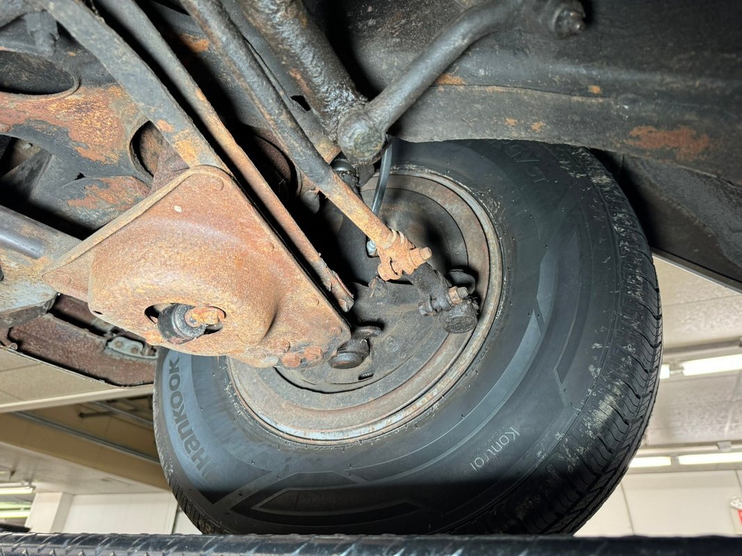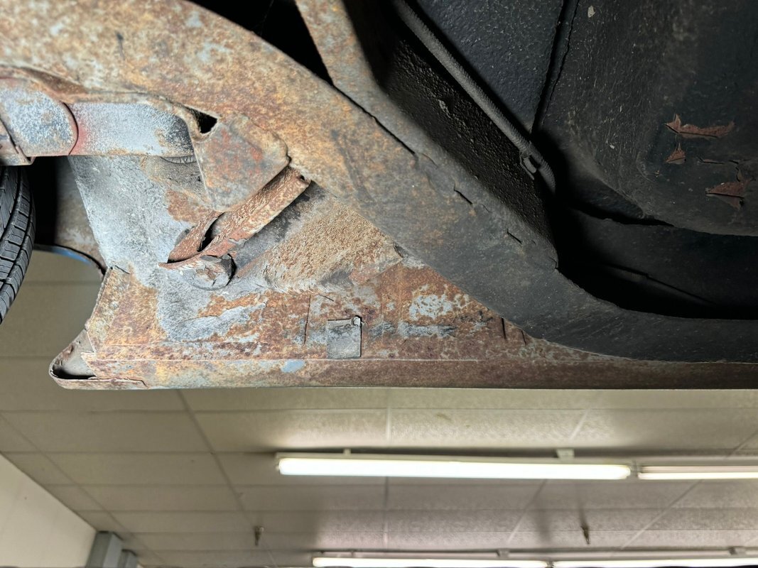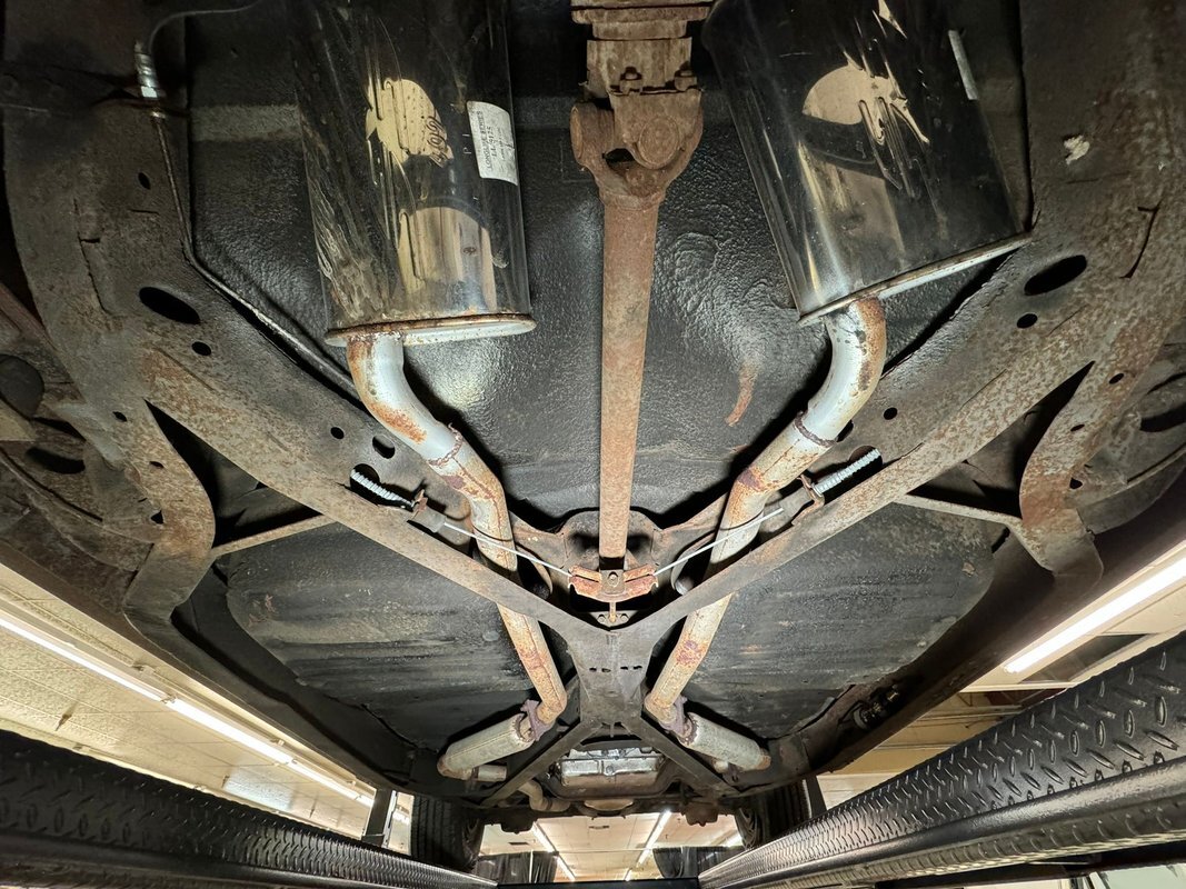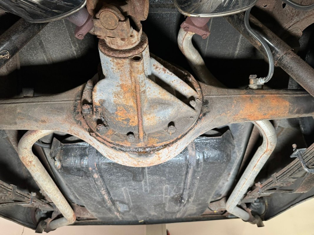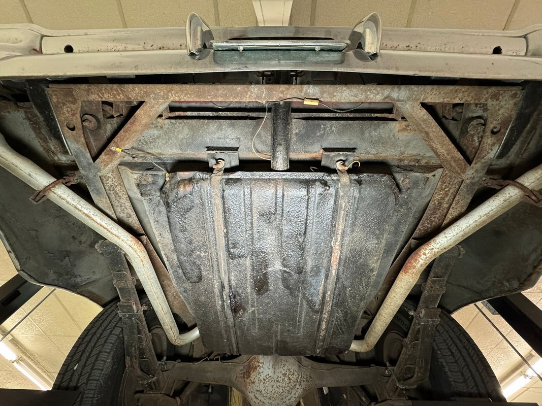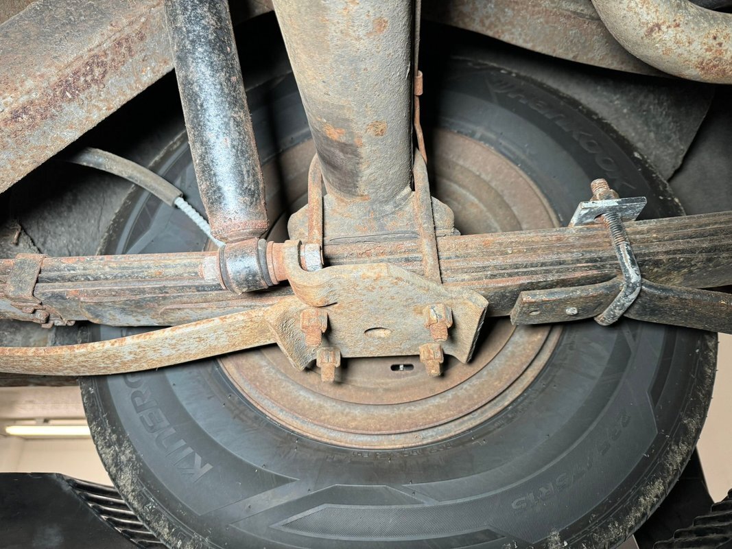 Under this long steel beauty we see some light to moderate surface rust in the X frame and some suspension parts. Floor pans are solid and fenders are rust free with just some road dirt caked on them. Suspension is independent coil springs for the fort and leaf springs for the rear. Drum braking is on all 4 corners. Fairly simple and some new mufflers are seen under here.
