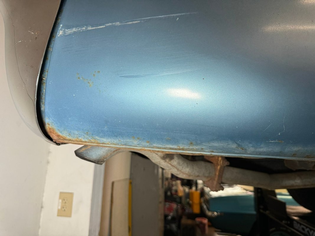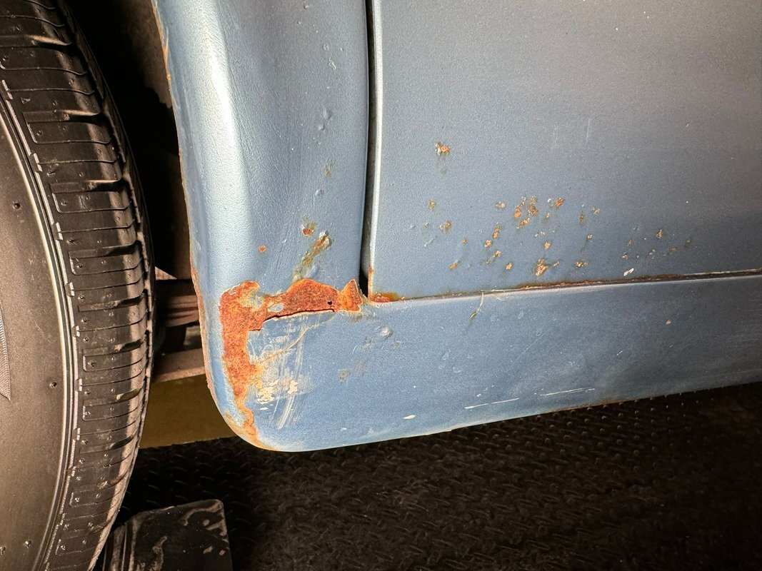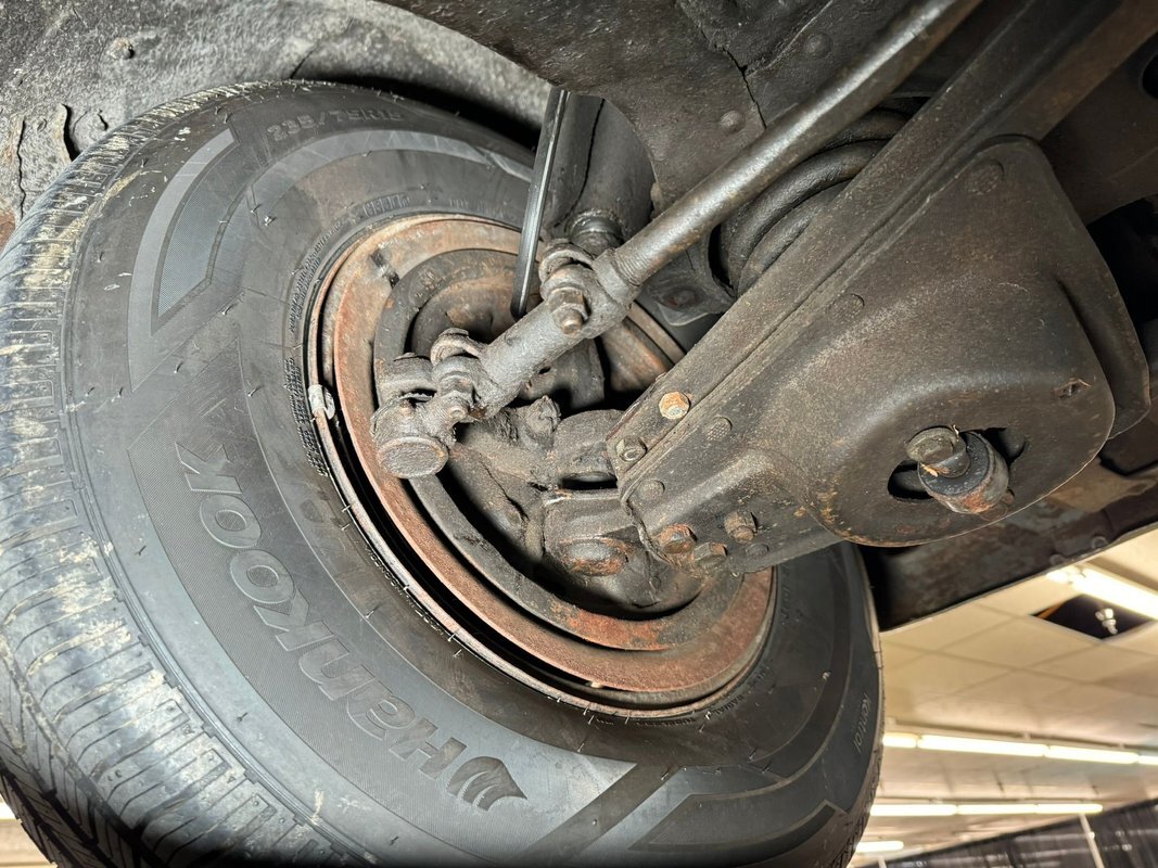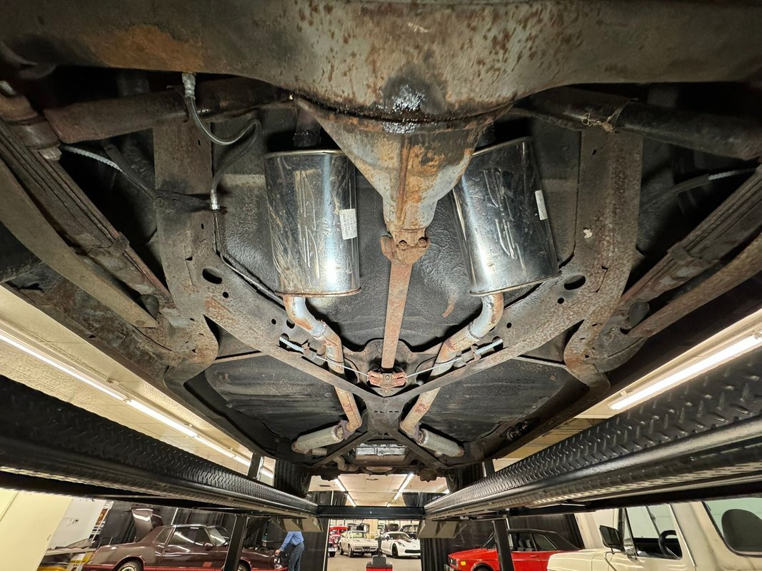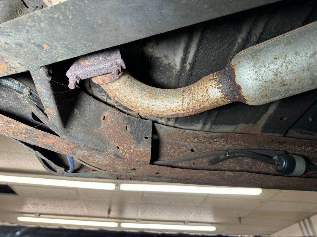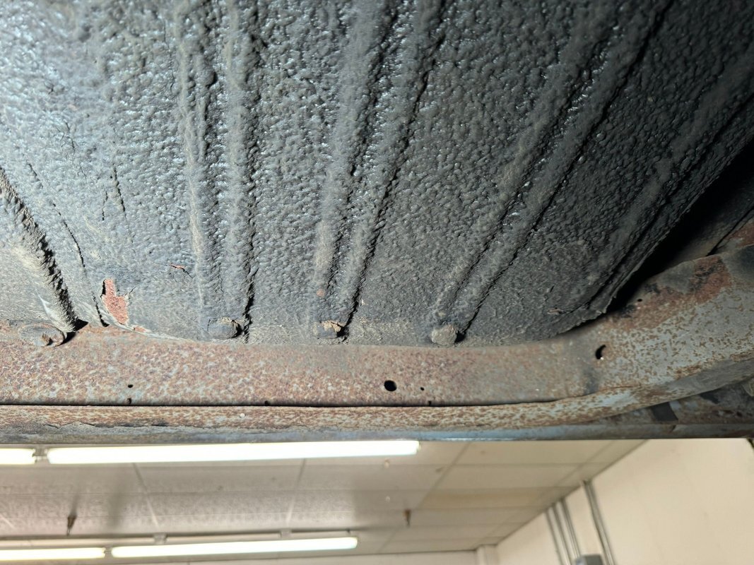 Under this long steel beauty we see some light to moderate surface rust in the X frame and some suspension parts. Floor pans are solid and fenders are rust free with just some road dirt caked on them. Suspension is independent coil springs for the fort and leaf springs for the rear. Drum braking is on all 4 corners. Fairly simple and some new mufflers are seen under here.