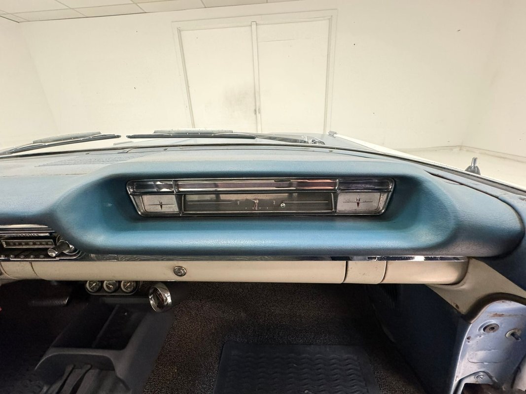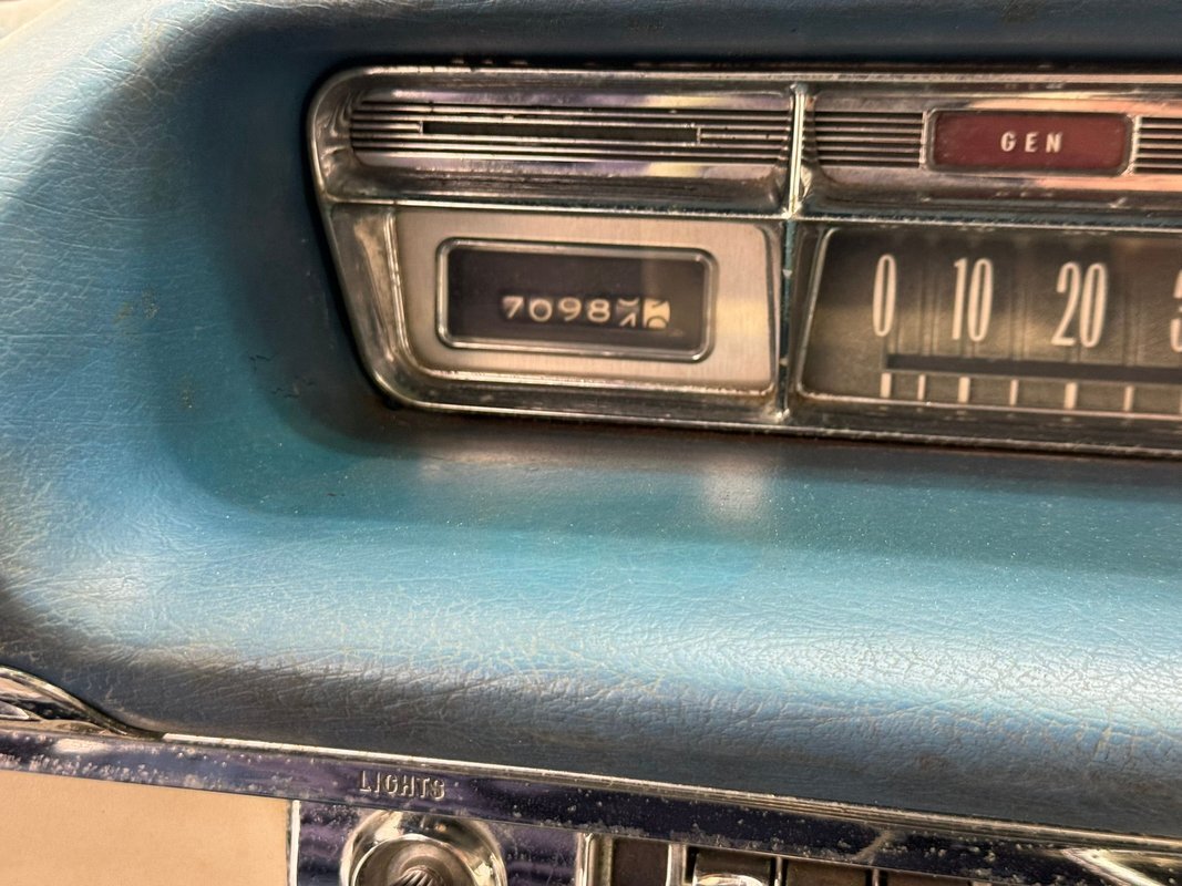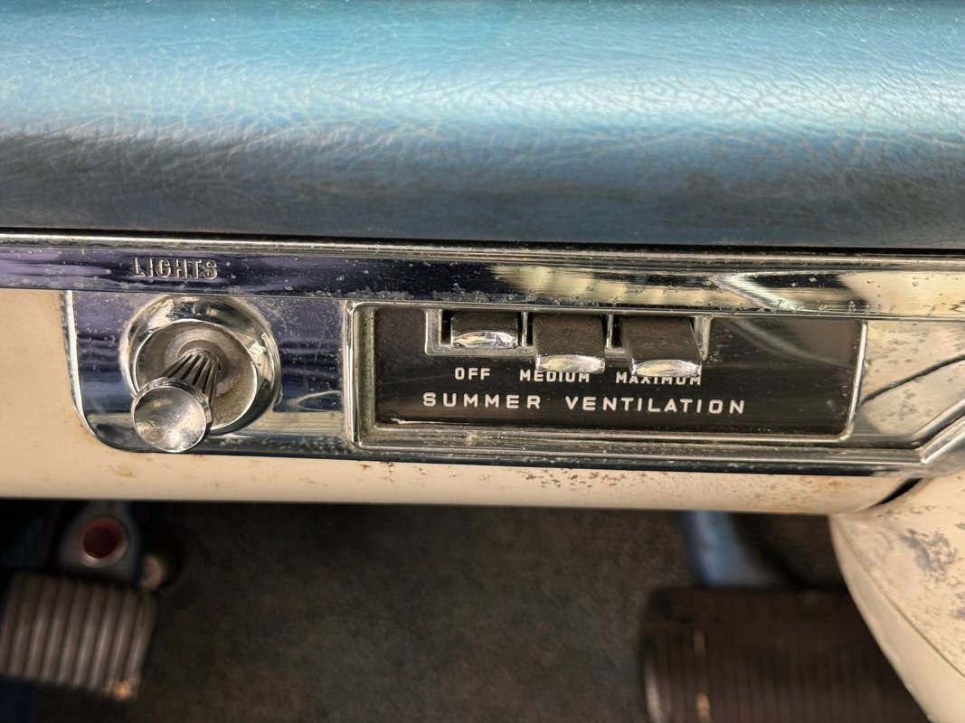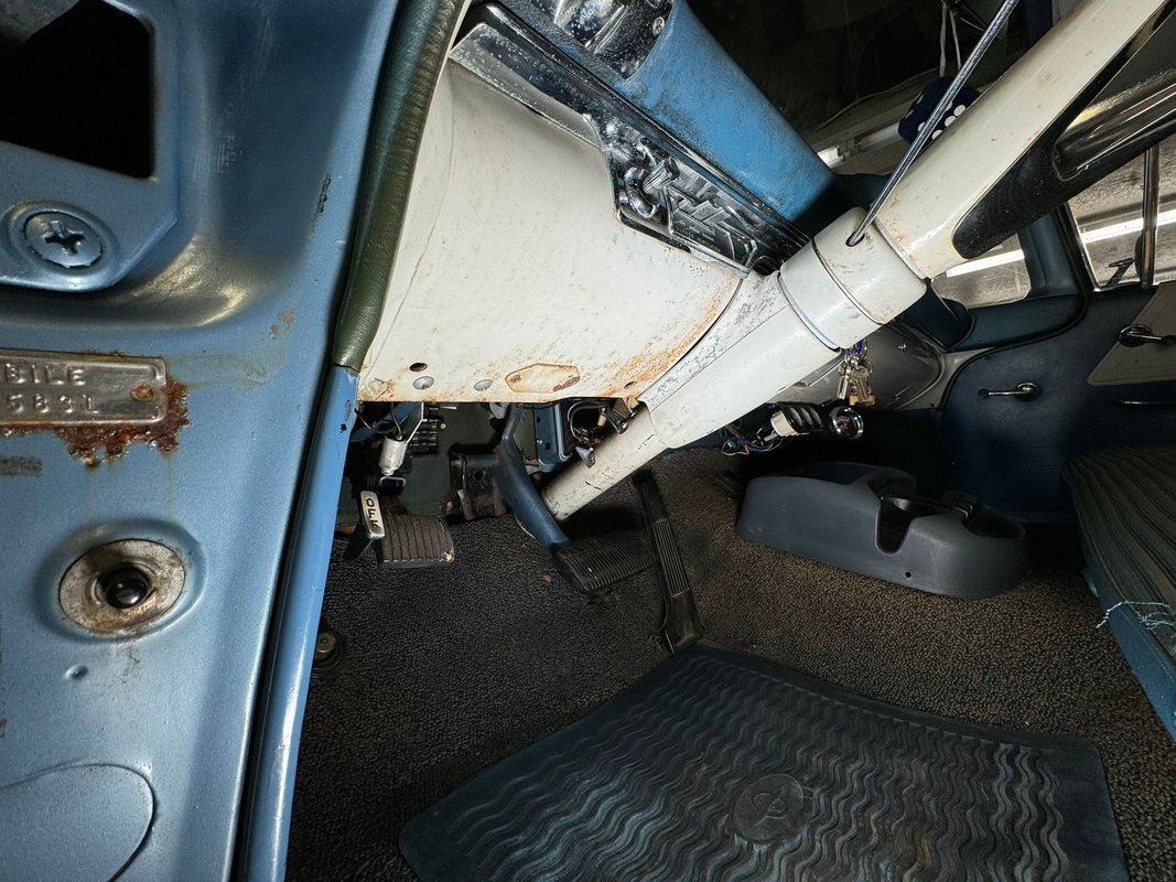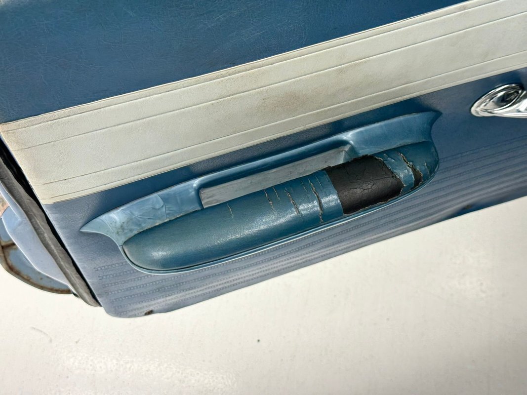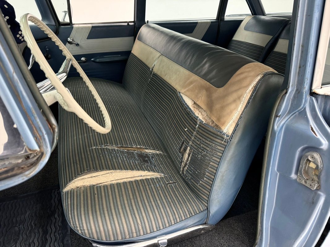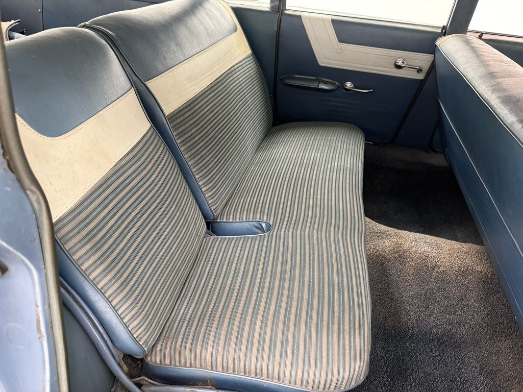 Sporting its original interior it will need some TLC on this front. We see blue vinyl for the door panels and these have a white vinyl streak running through them. Armrests show some splitting and taping for repairs. The white is soiled on some doors. A full on front bench is first and this shows with blue and gray striped broadcloth inserts and solid blue vinyl bolsters. The driver's seat is ripped and some stuffing is coming through. The uppers have a white vinyl streak on the top section of the backs and this is also torn at the seams and very dirty. The back bench is pretty good with the same pattern showing only not torn or as soiled. It is an 80/20 split configuration. In the back for the "bed" it has worn vinyl panels and some steel chromed dividers. The vinyl panels are cracking off. Up front, a sleek white steering wheel fronts a jet age dash with more two tone blue and white. Lots more chromed edge trimmings, buttons, levers, toggles, and knobs are abundant within the instrument cluster and driver controls. On the passenger side is a neat inset into the dash top where a clock and some star 3D graphics are inset into. Blue carpeting is covering the floors and above is a white headliner showing sagging and tears.