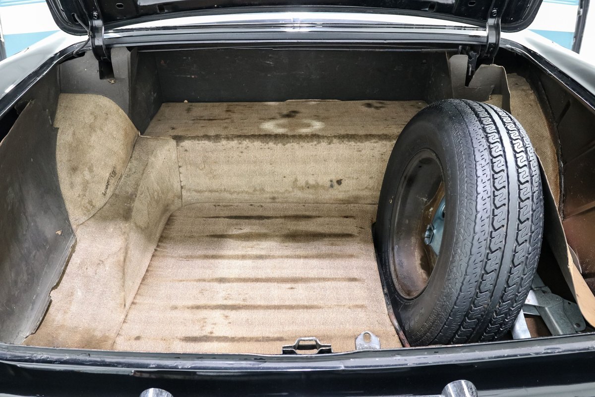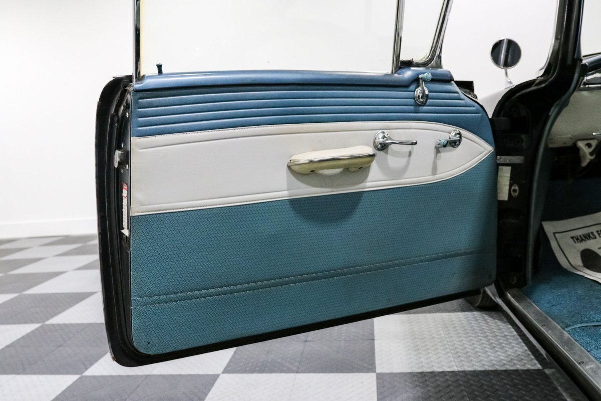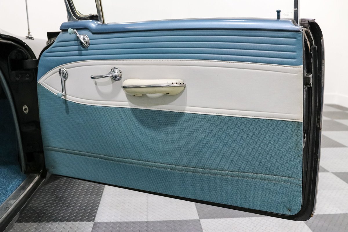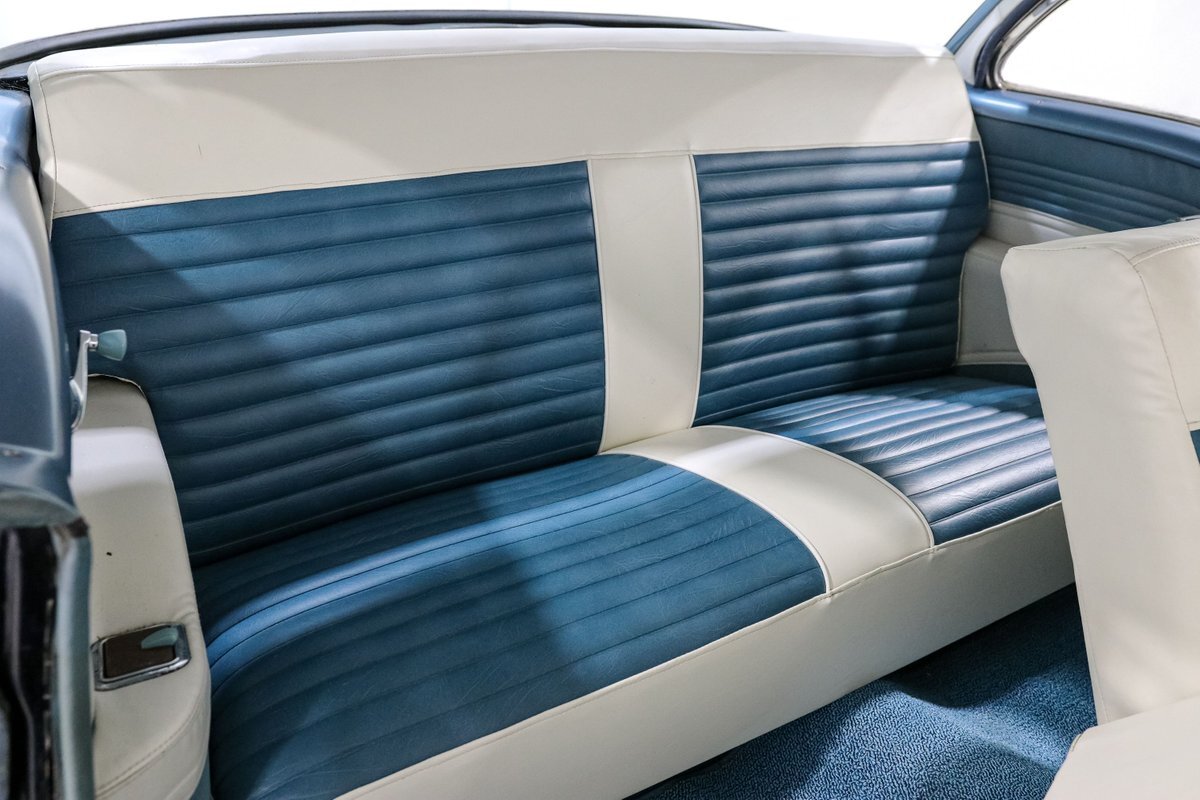 The interior is a striking blue and white vinyl affair, offering bench seating that invites you to slide in, take the wheel, and step back in time. The two-tone interior complements the exterior, creating a seamless look that's as stylish today as it was groundbreaking then. From the factory radio to the wide white tires crowned with original hubcaps, every detail on this vehicle speaks to an age of automotive elegance and simplicity.
