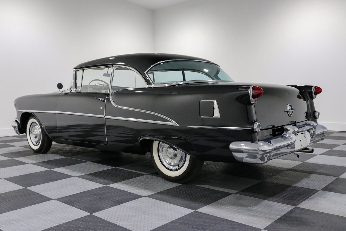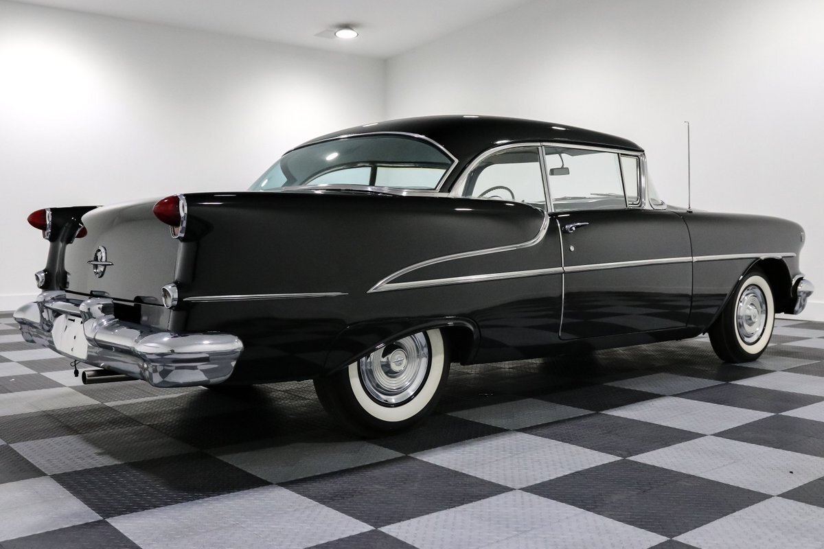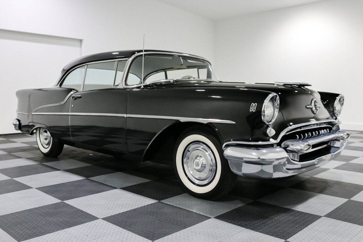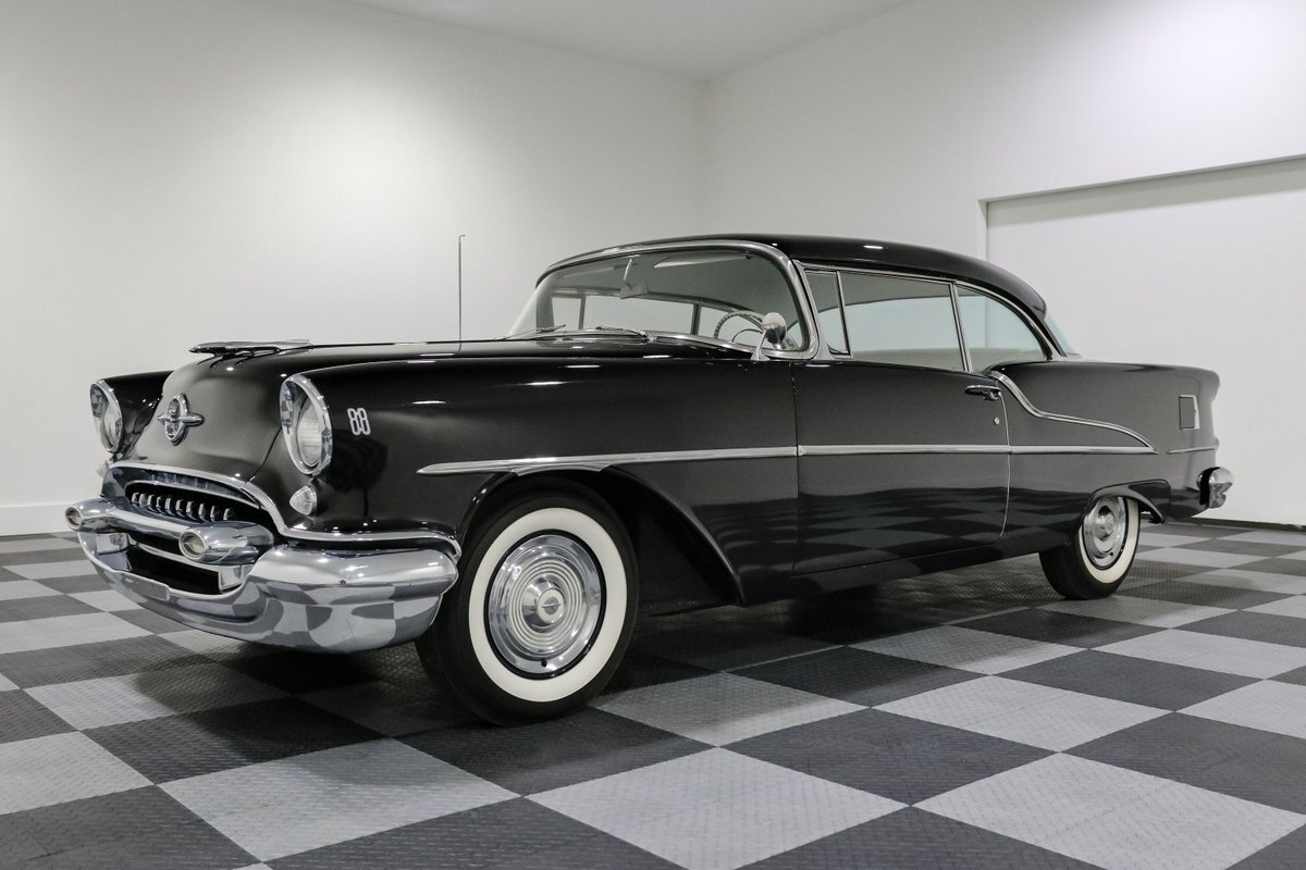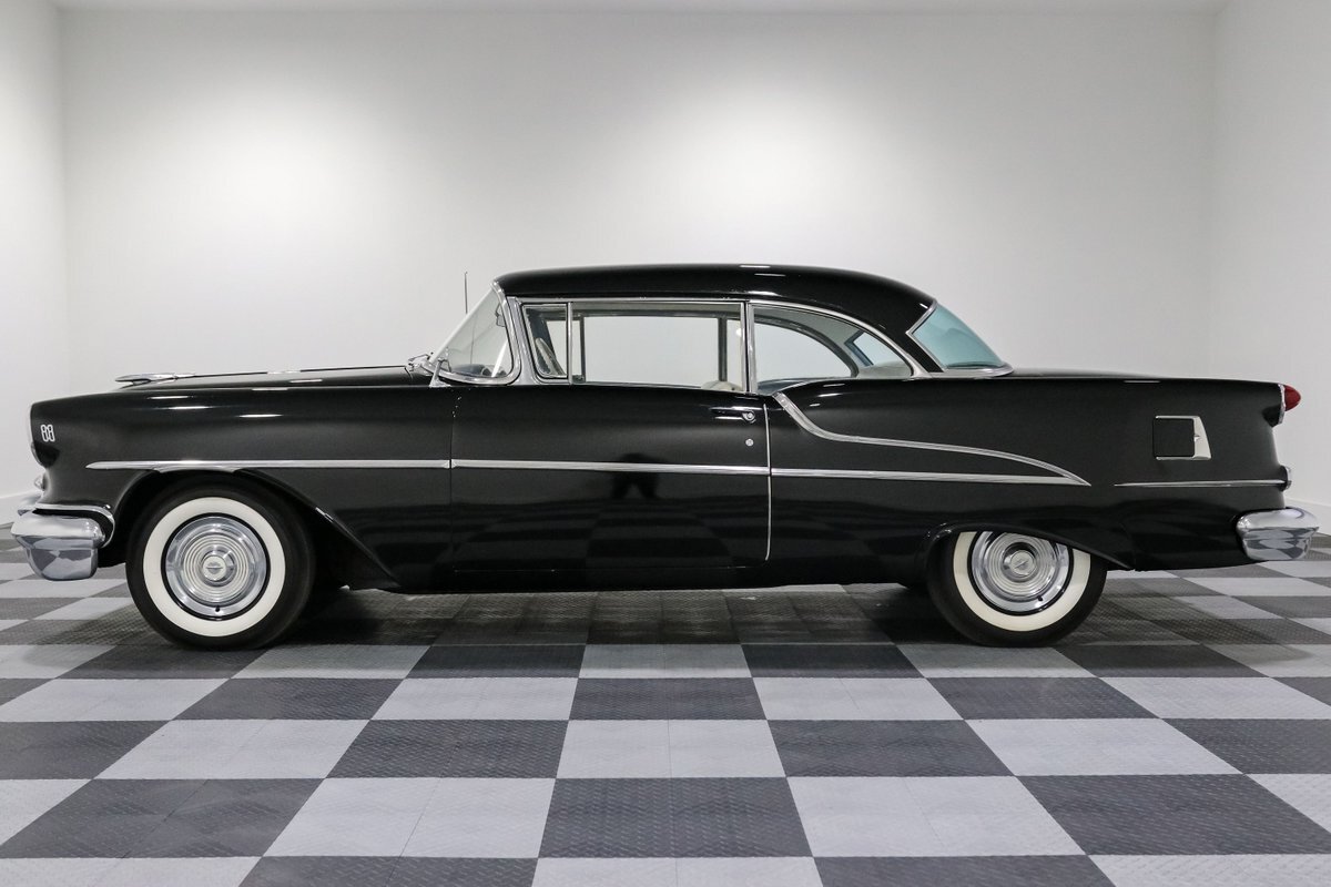 Here's a throwback that's as authentic as it gets – a 1955 Oldsmobile 88, a beacon of mid-century automotive design, cloaked in a sleek black finish that seems to absorb light and attention alike. Under the hood rests a 324 Rocket V8 engine, an icon in its own right, delivering 185 horsepower to the 3-speed automatic transmission, a testament to the engineering prowess of its era. It's a ride that promises the allure of the open road with the kind of power and prestige that was reserved for the top of the line back in the day.