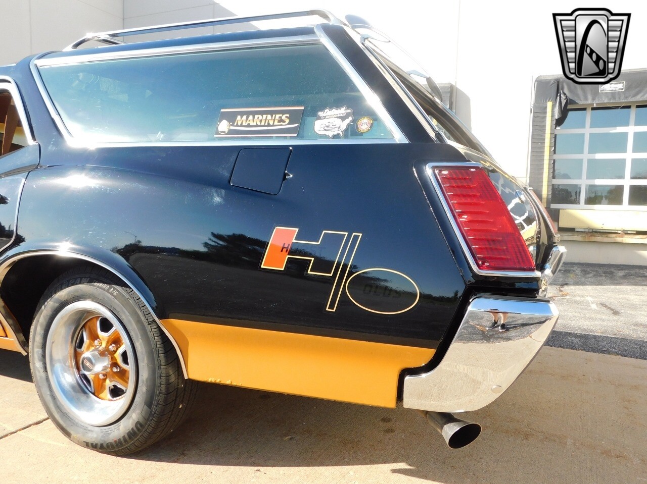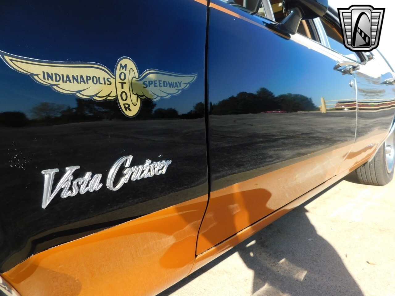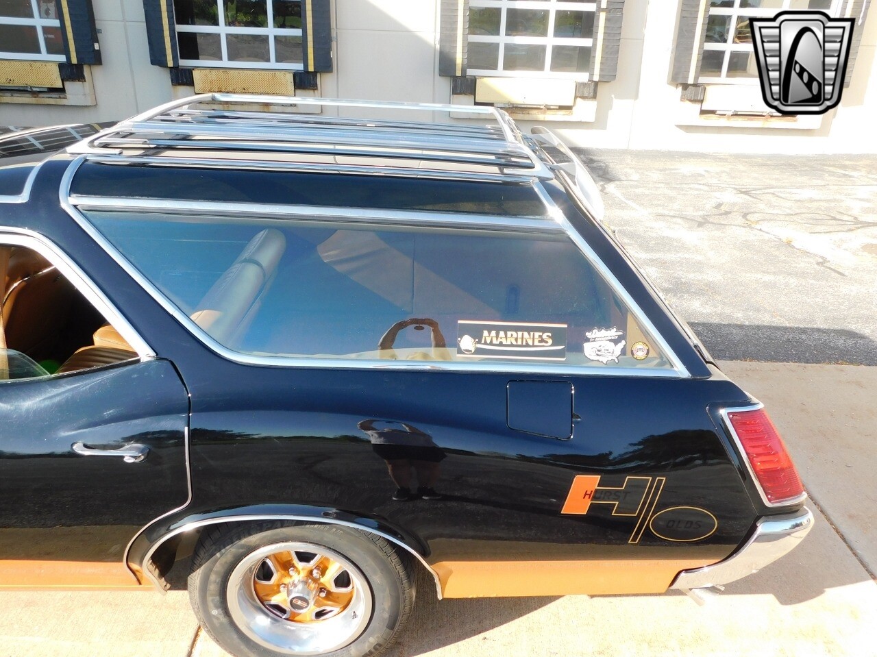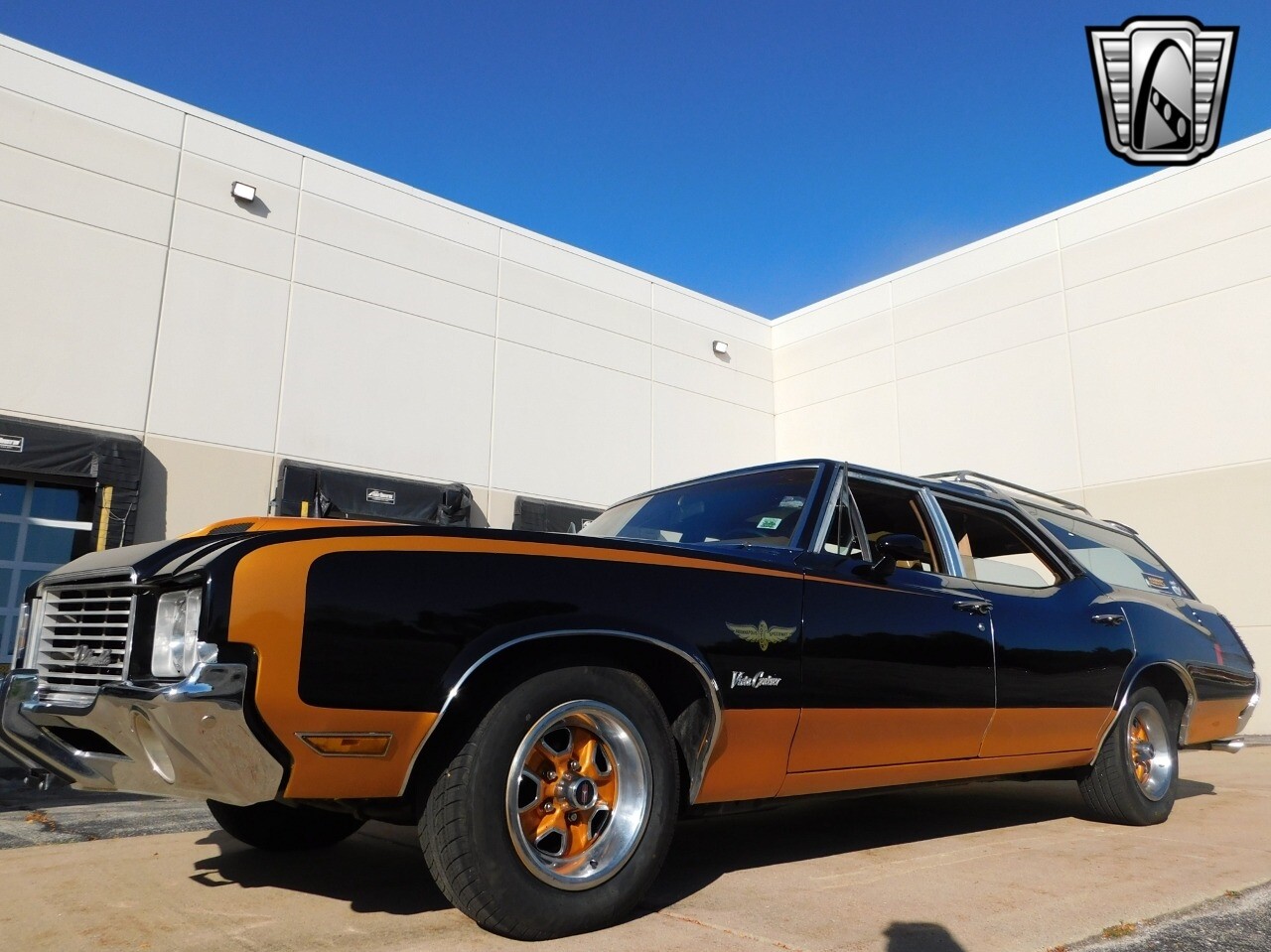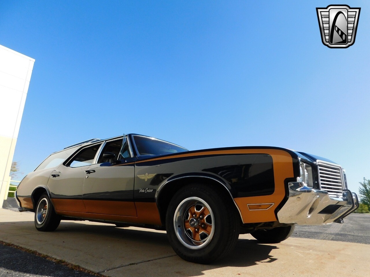 Discover the thrill of vintage charm with our 1972 Oldsmobile Vista Cruiser. This classic automobile comes in a dazzling black hue adorned with bold orange racing stripes - guaranteed to make a striking impression on the streets and at car gatherings.