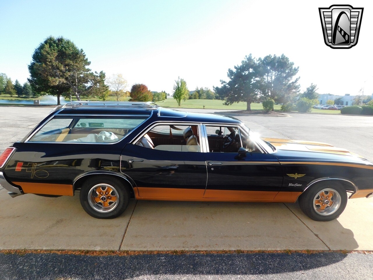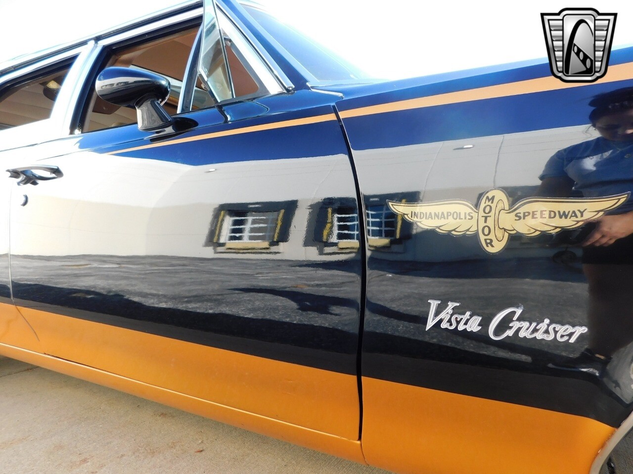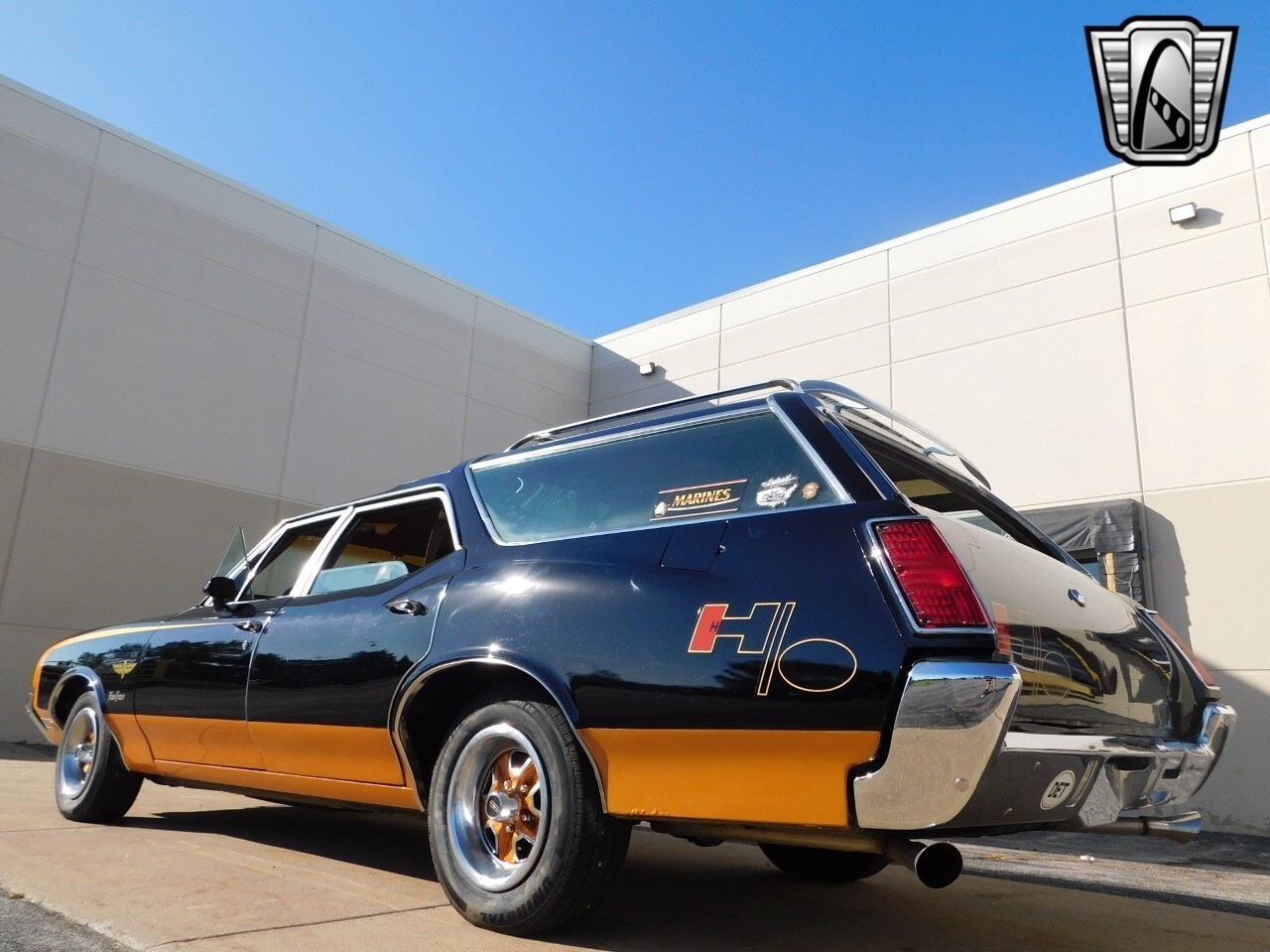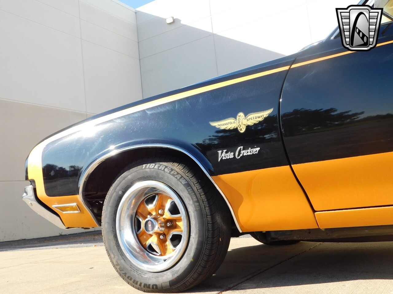 Discover the thrill of vintage charm with our 1972 Oldsmobile Vista Cruiser. This classic automobile comes in a dazzling black hue adorned with bold orange racing stripes - guaranteed to make a striking impression on the streets and at car gatherings.