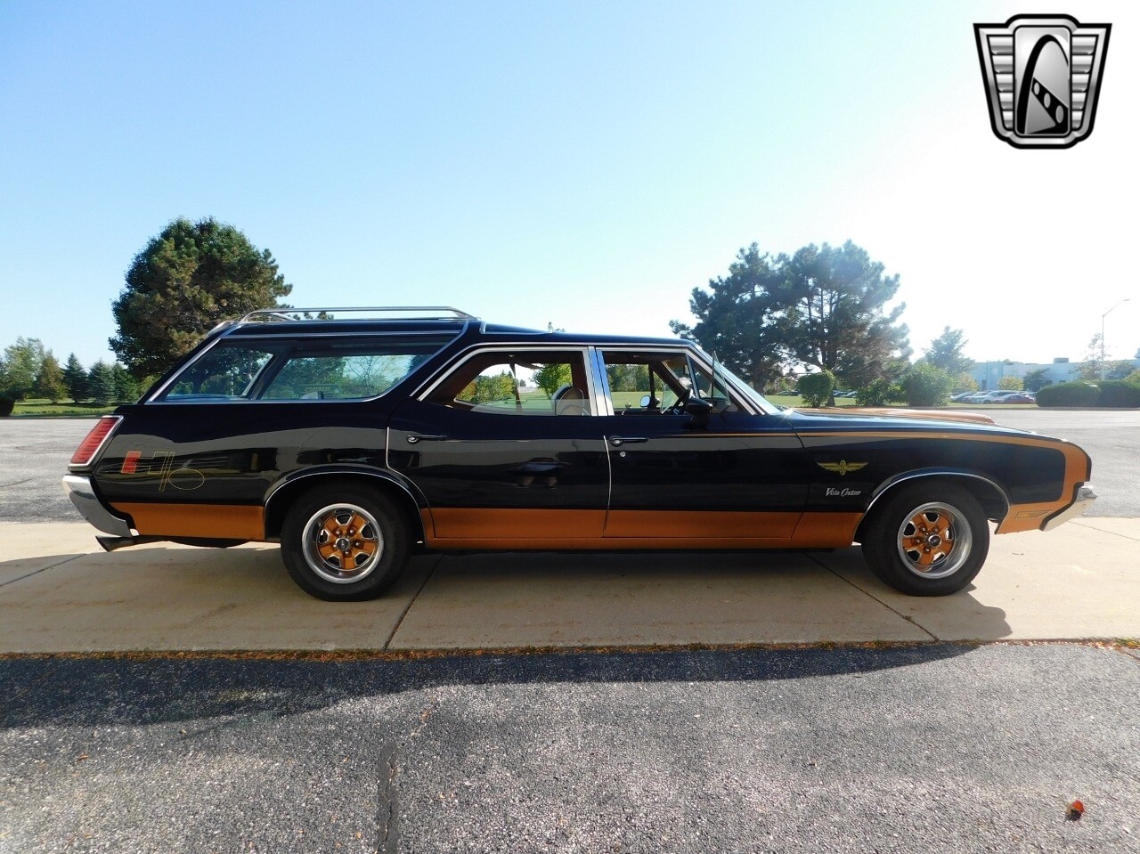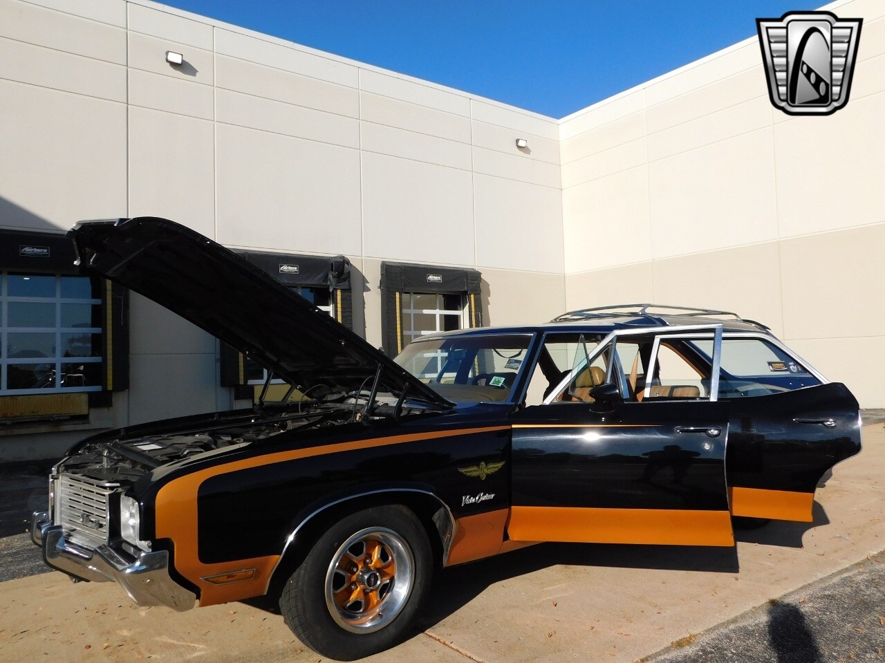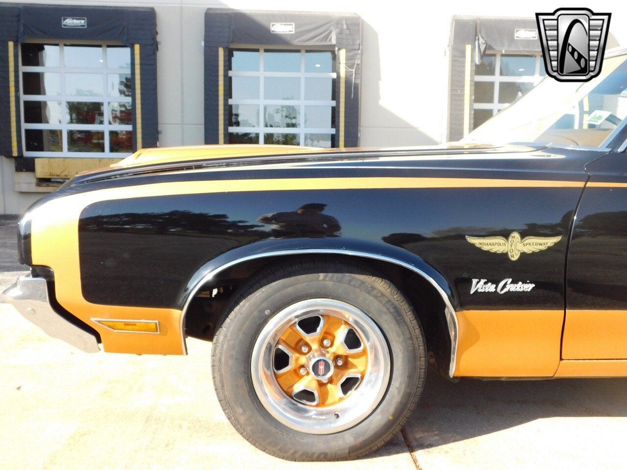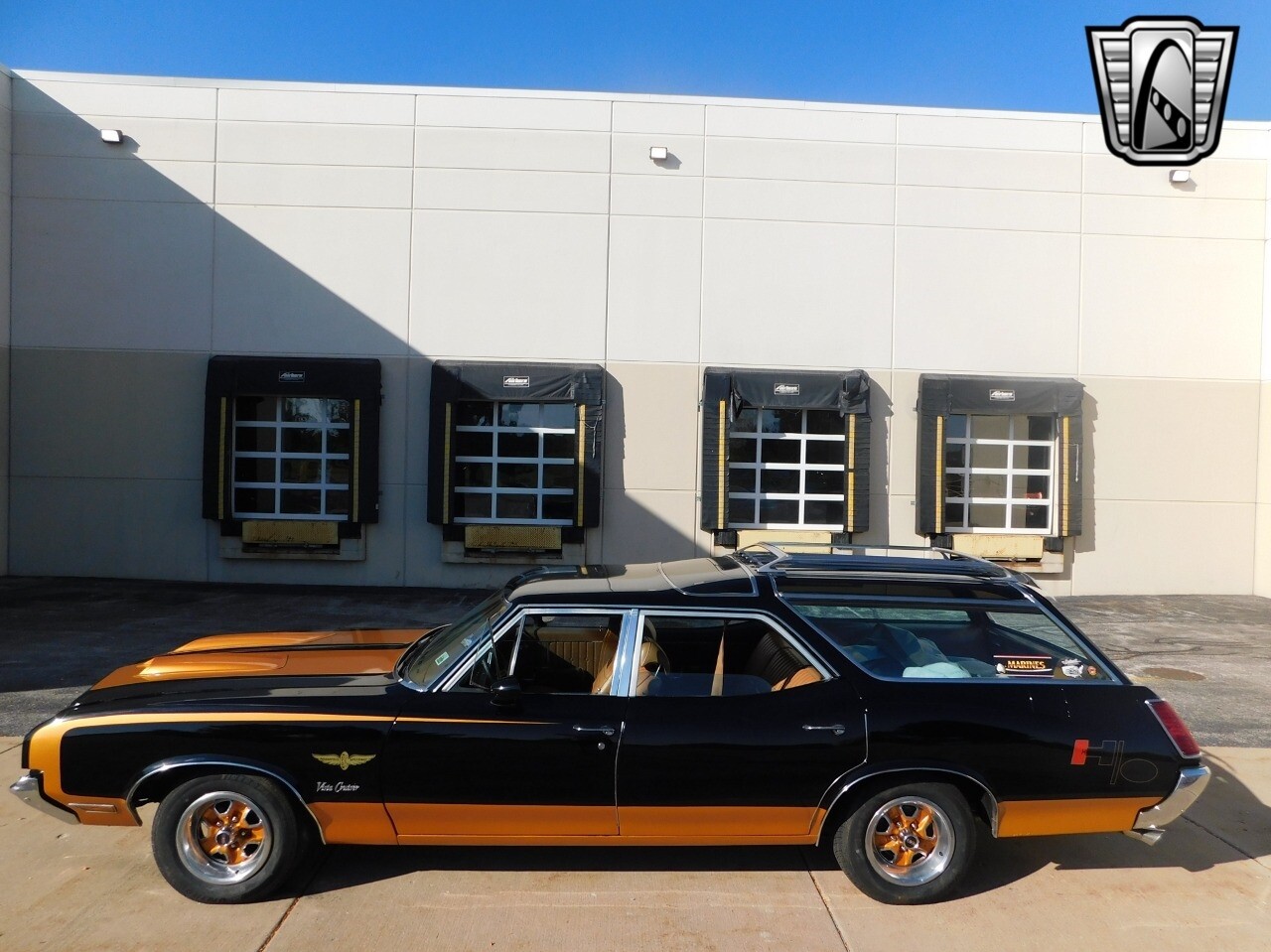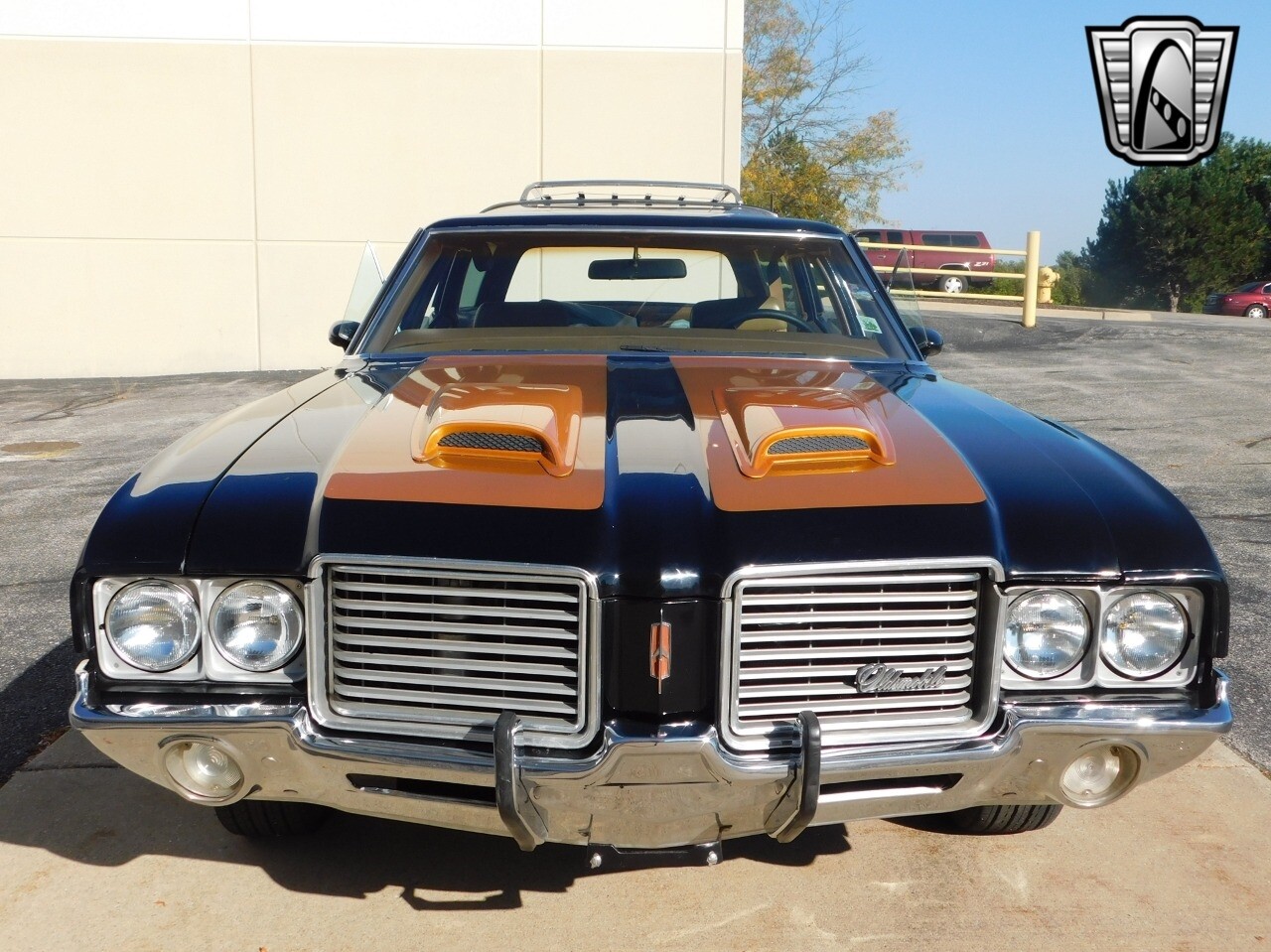 Discover the thrill of vintage charm with our 1972 Oldsmobile Vista Cruiser. This classic automobile comes in a dazzling black hue adorned with bold orange racing stripes - guaranteed to make a striking impression on the streets and at car gatherings.
