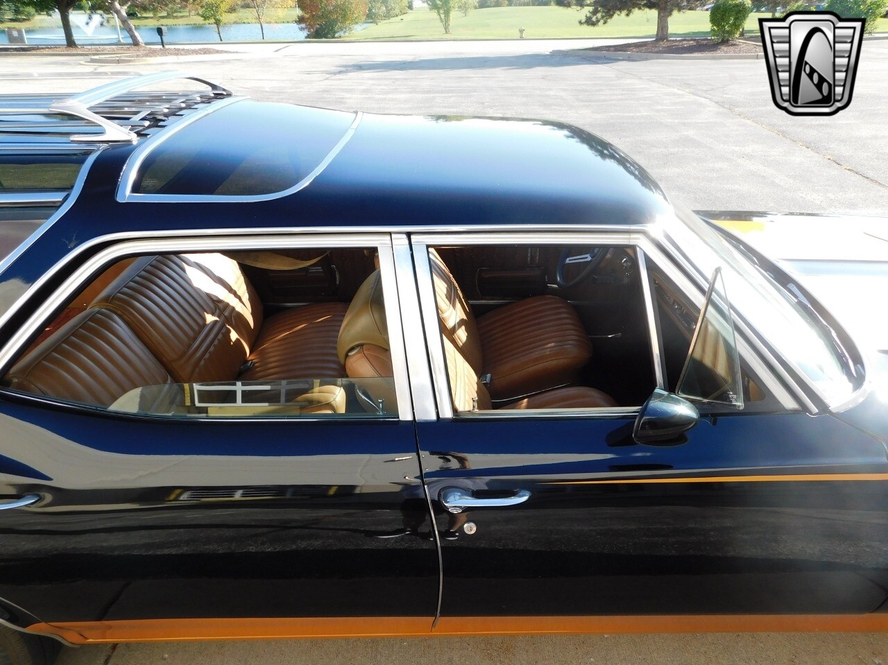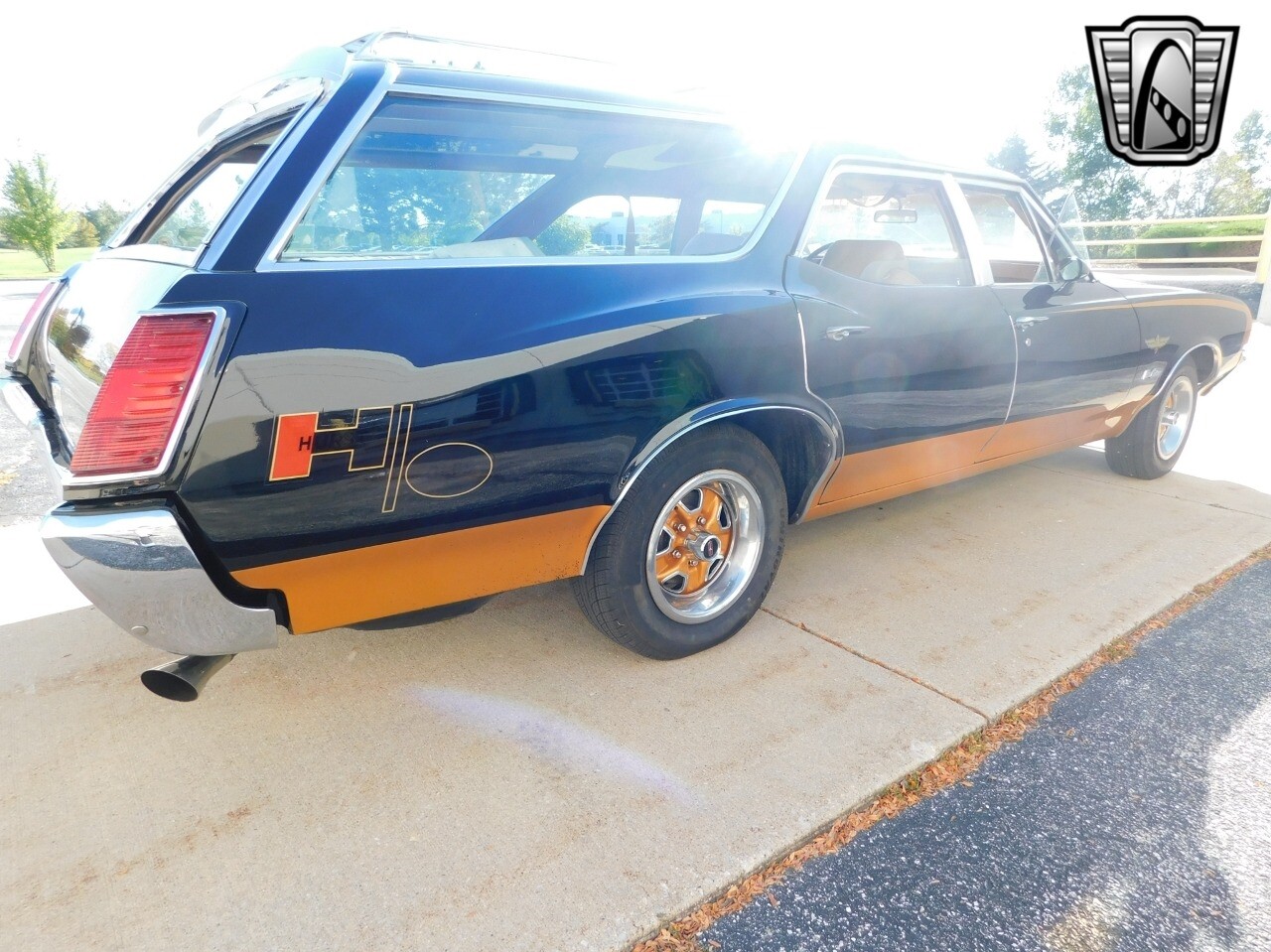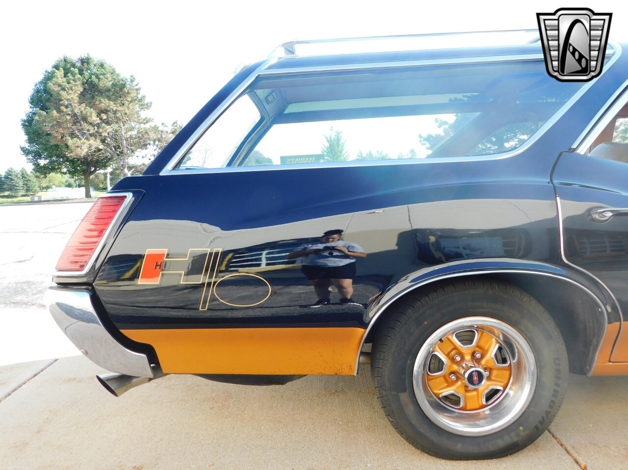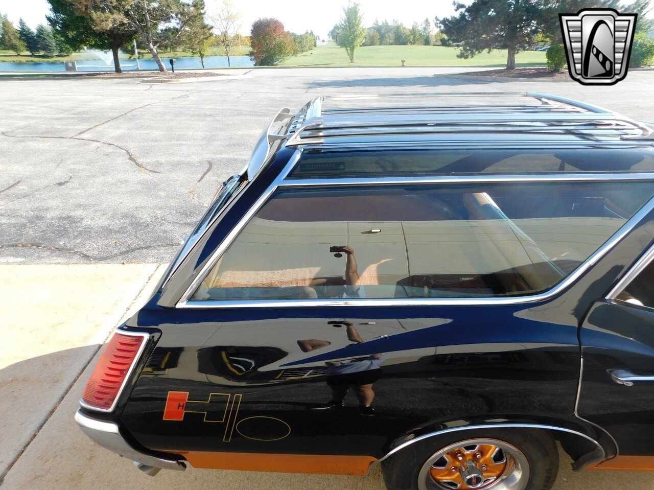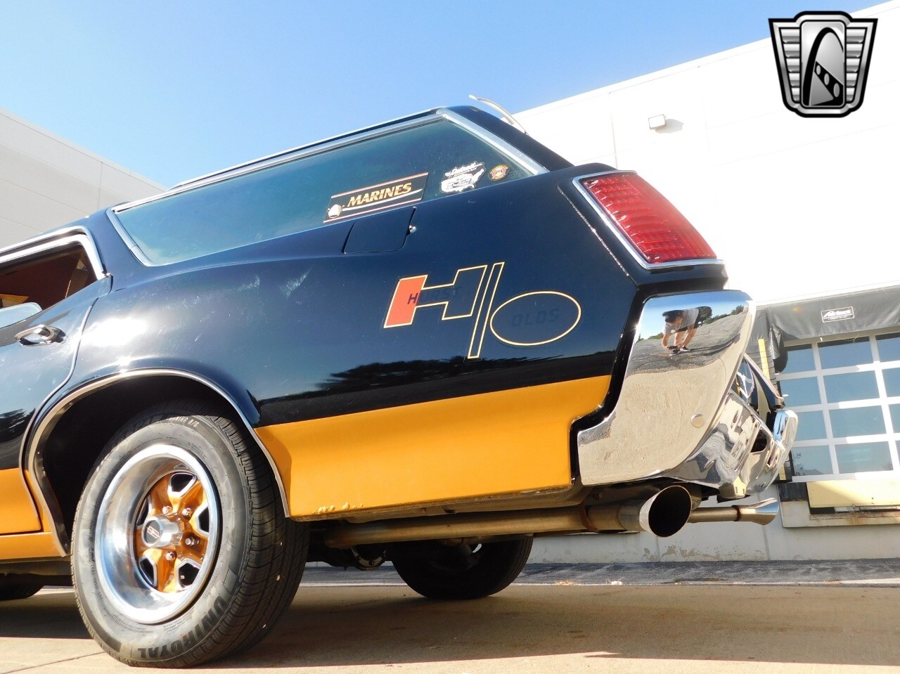 Discover the thrill of vintage charm with our 1972 Oldsmobile Vista Cruiser. This classic automobile comes in a dazzling black hue adorned with bold orange racing stripes - guaranteed to make a striking impression on the streets and at car gatherings.