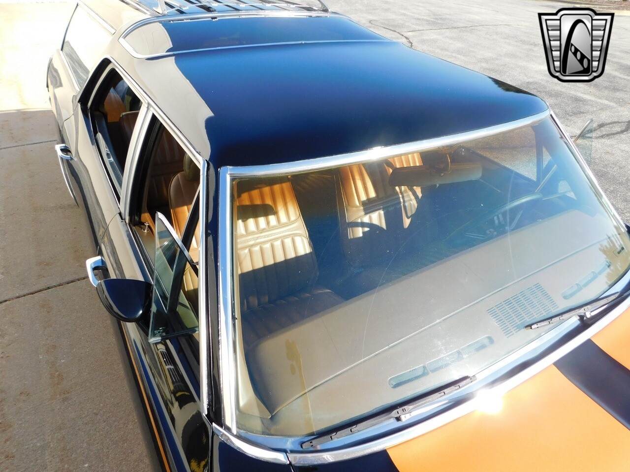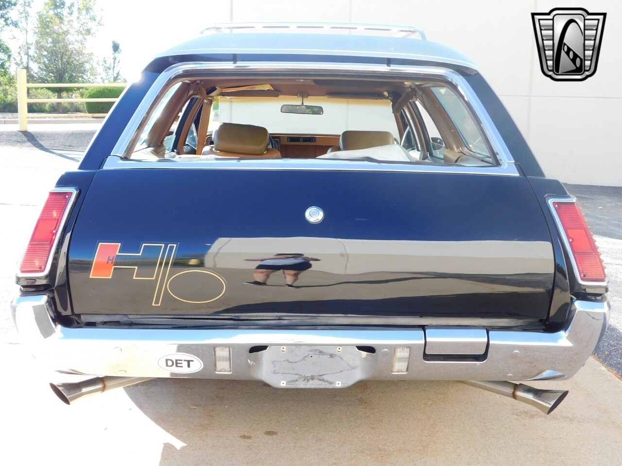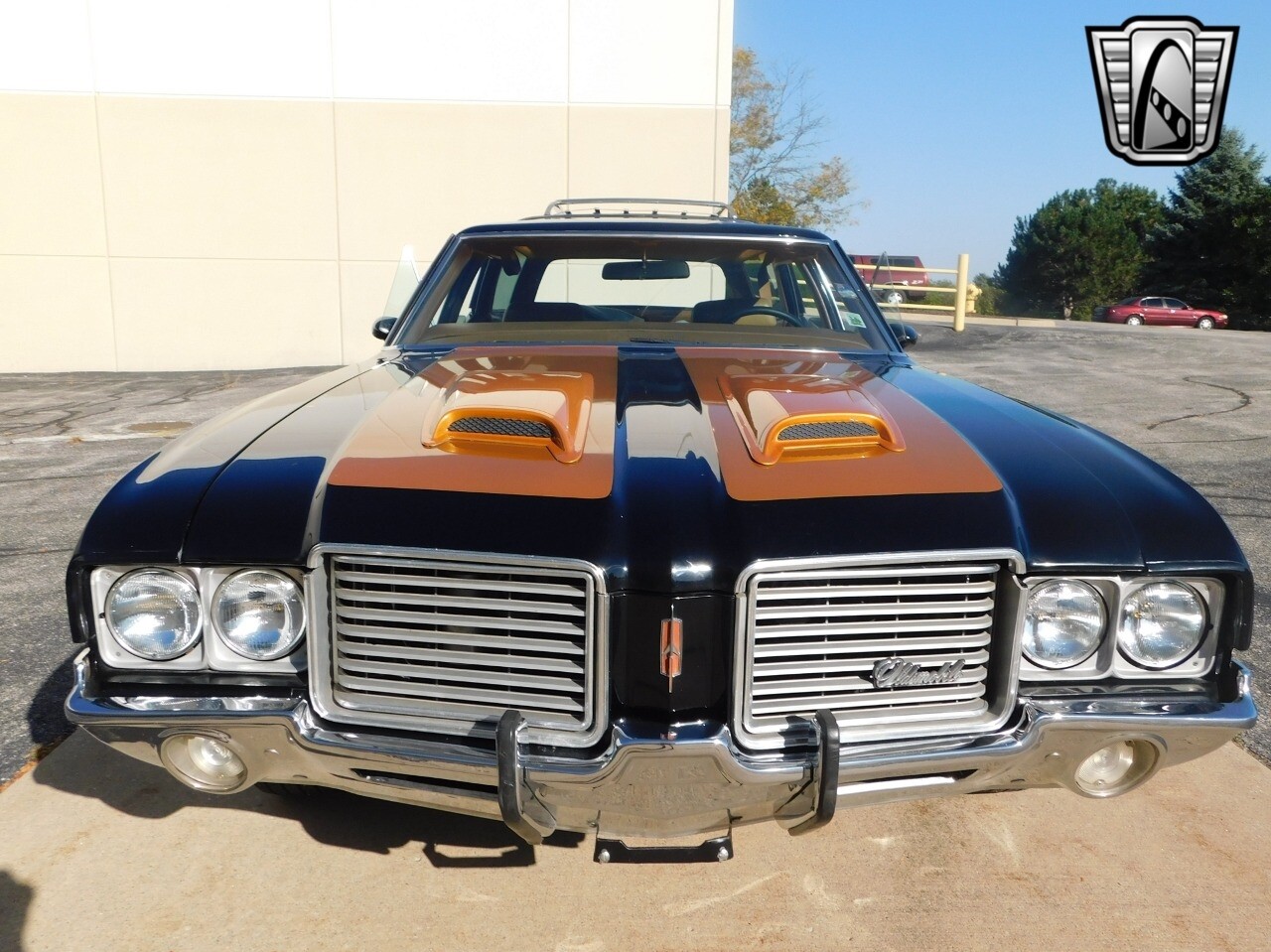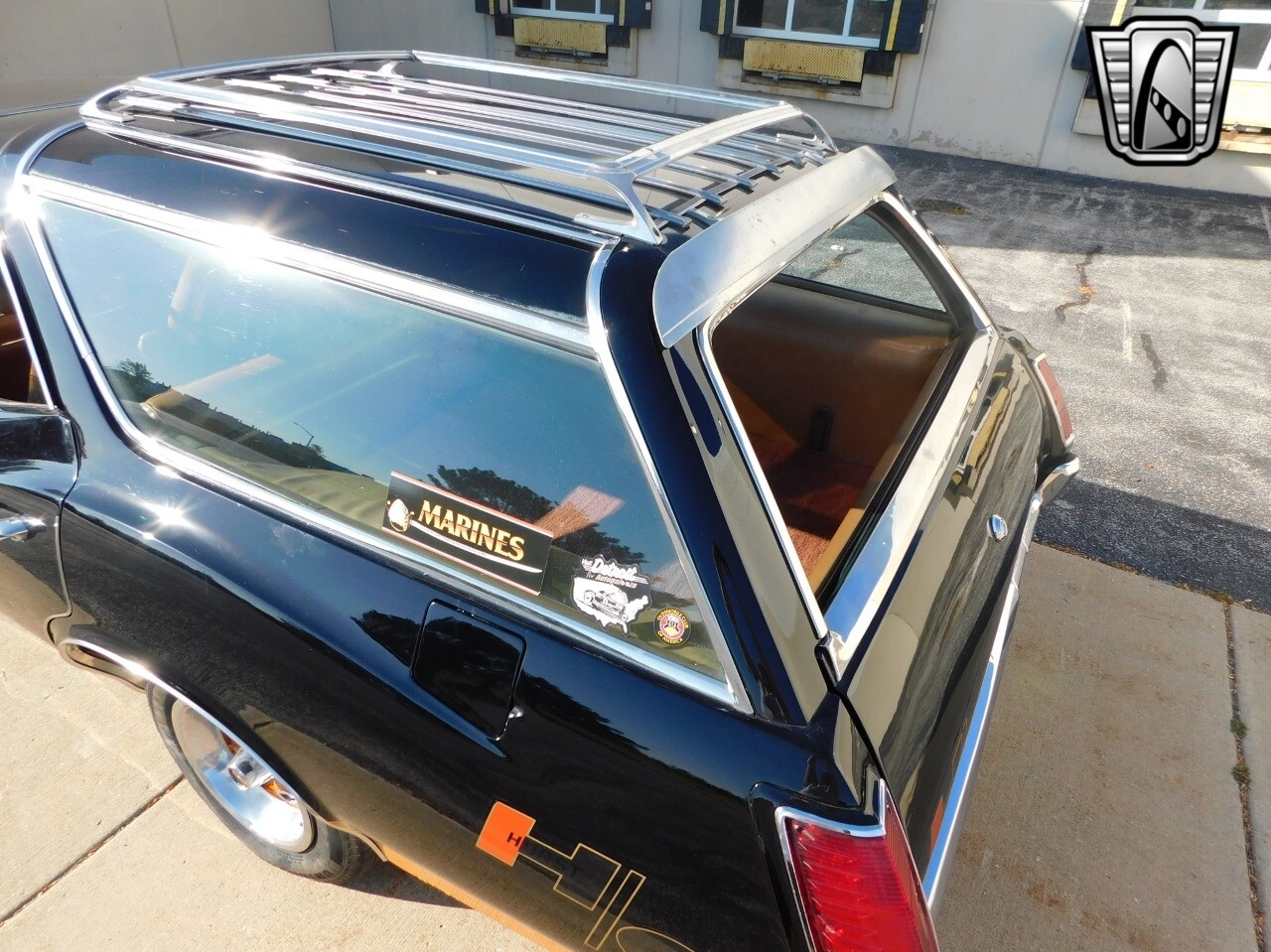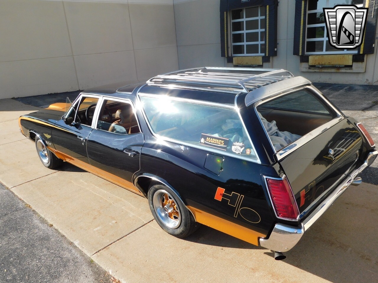 Discover the thrill of vintage charm with our 1972 Oldsmobile Vista Cruiser. This classic automobile comes in a dazzling black hue adorned with bold orange racing stripes - guaranteed to make a striking impression on the streets and at car gatherings.