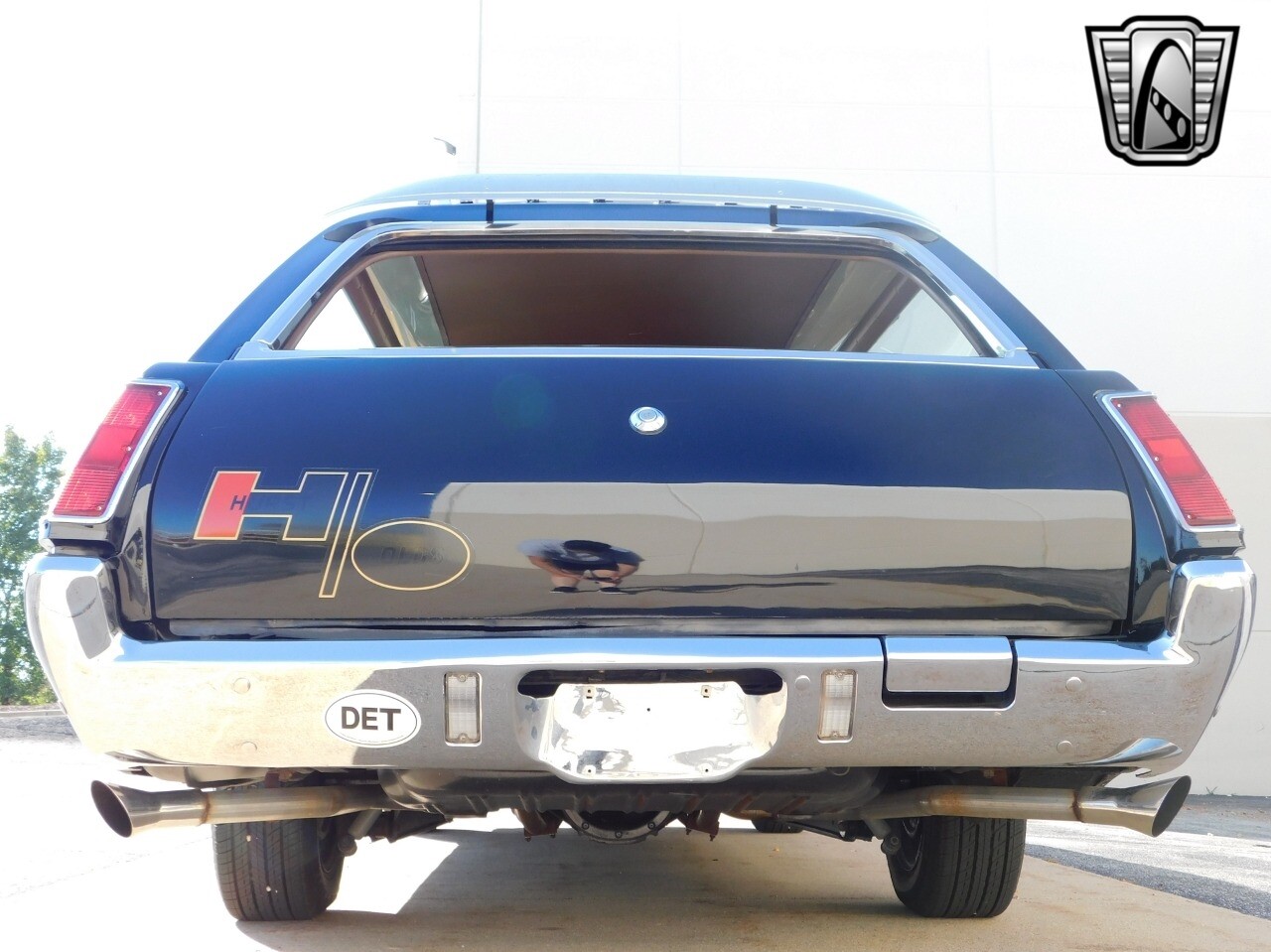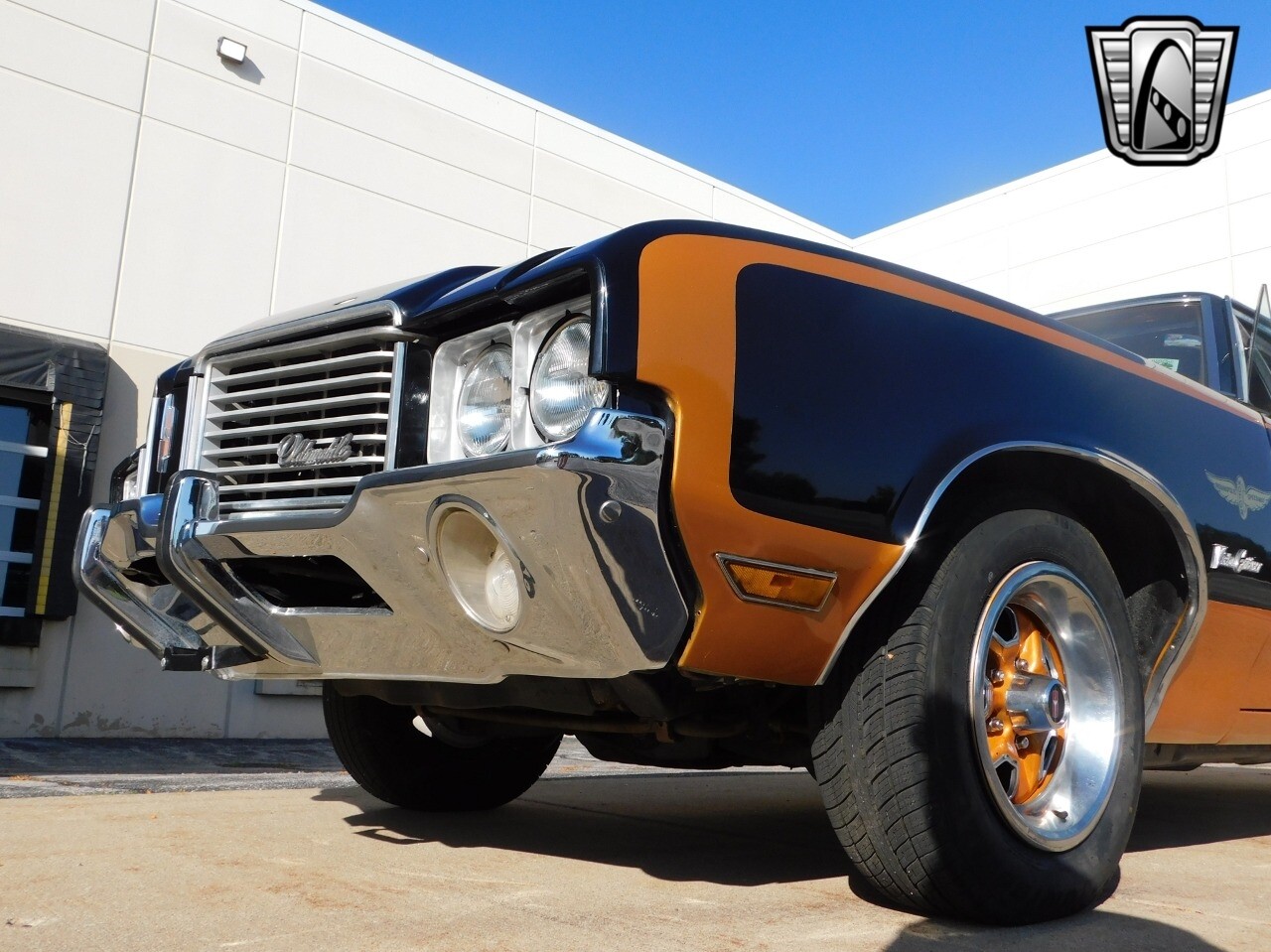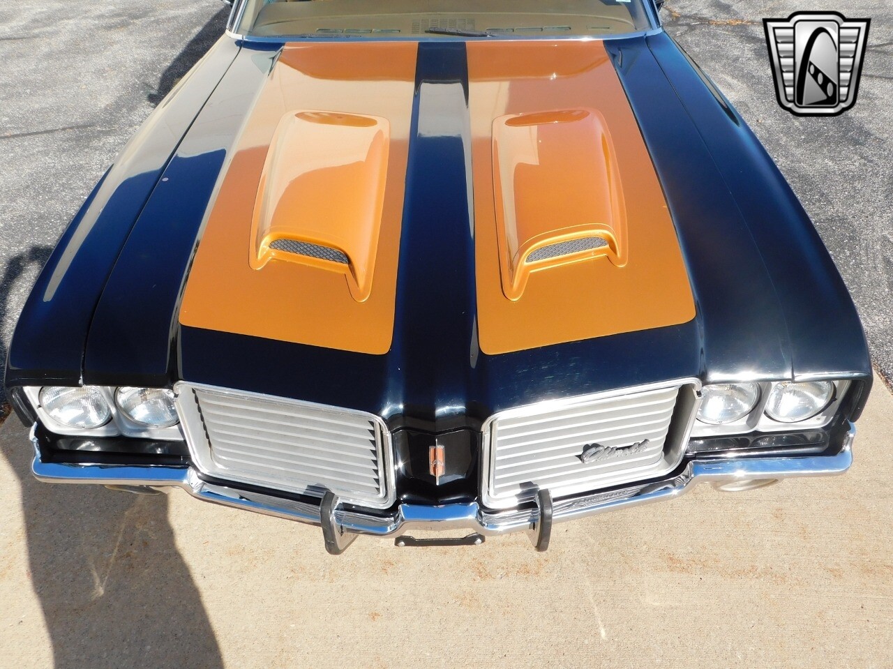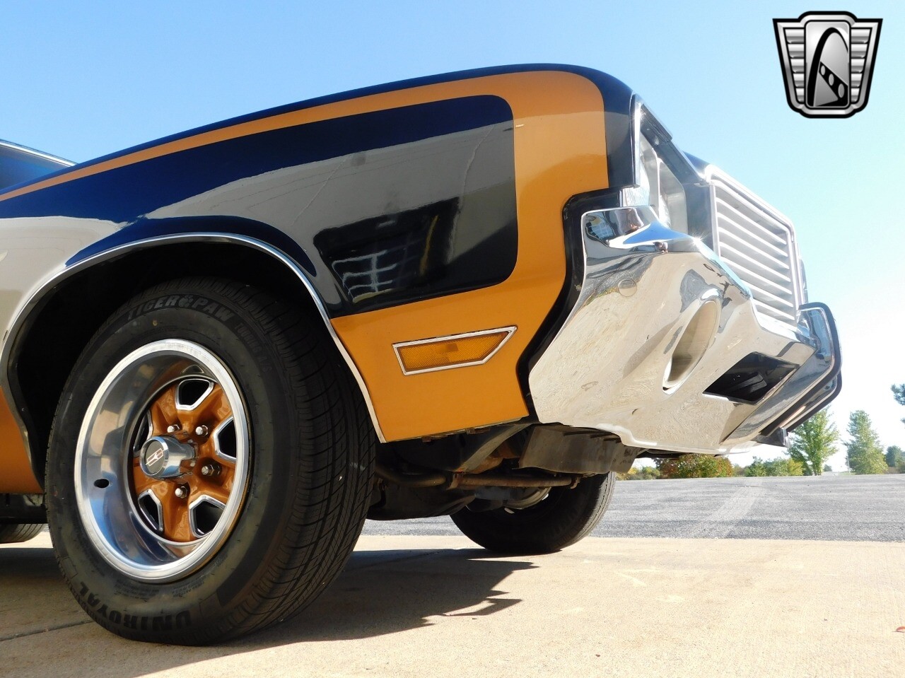 Discover the thrill of vintage charm with our 1972 Oldsmobile Vista Cruiser. This classic automobile comes in a dazzling black hue adorned with bold orange racing stripes - guaranteed to make a striking impression on the streets and at car gatherings.