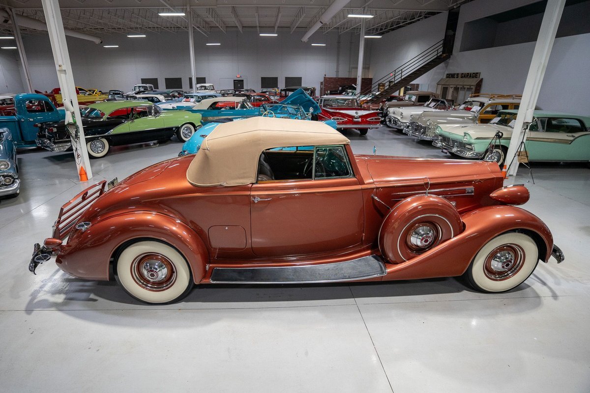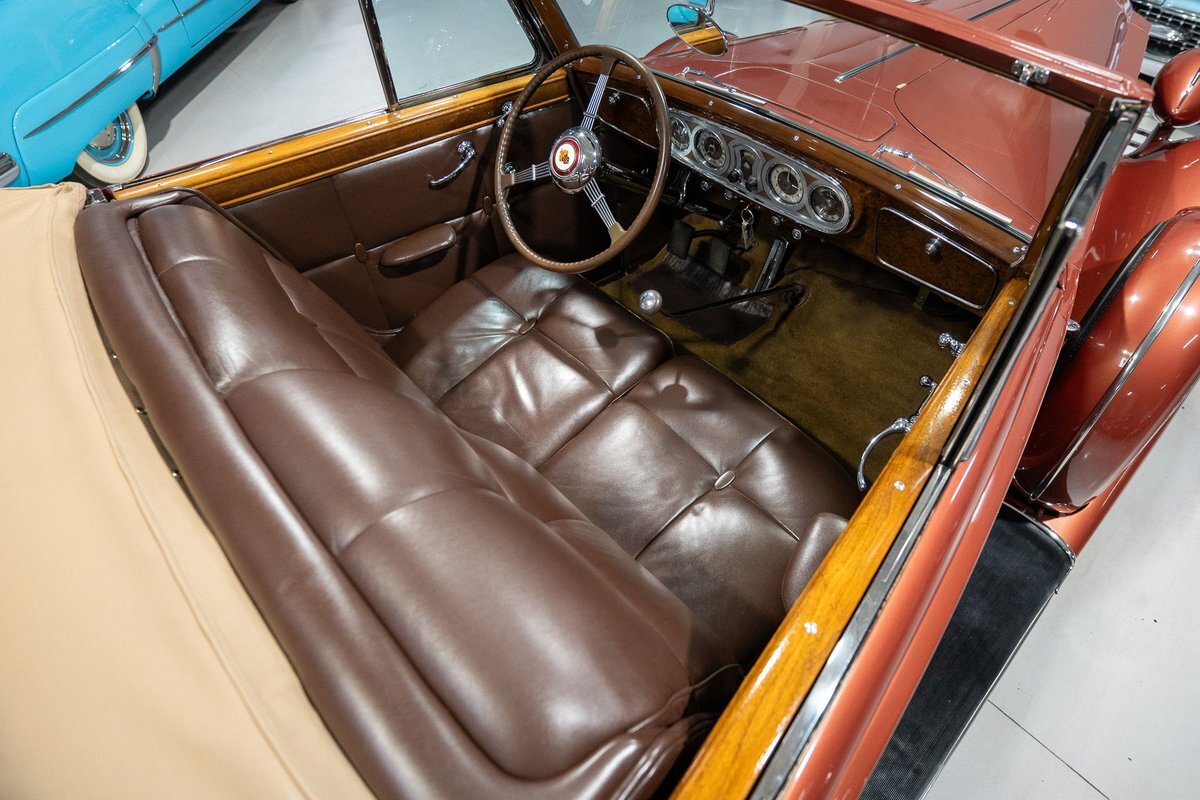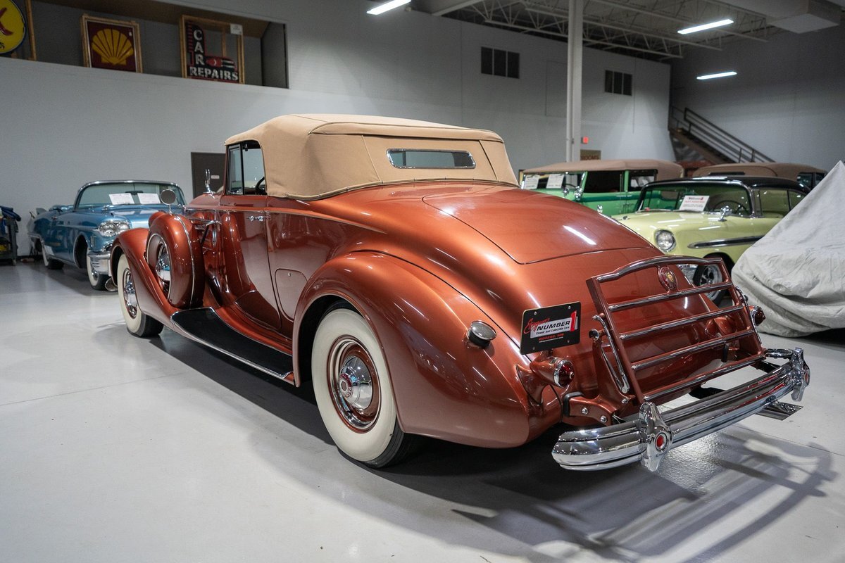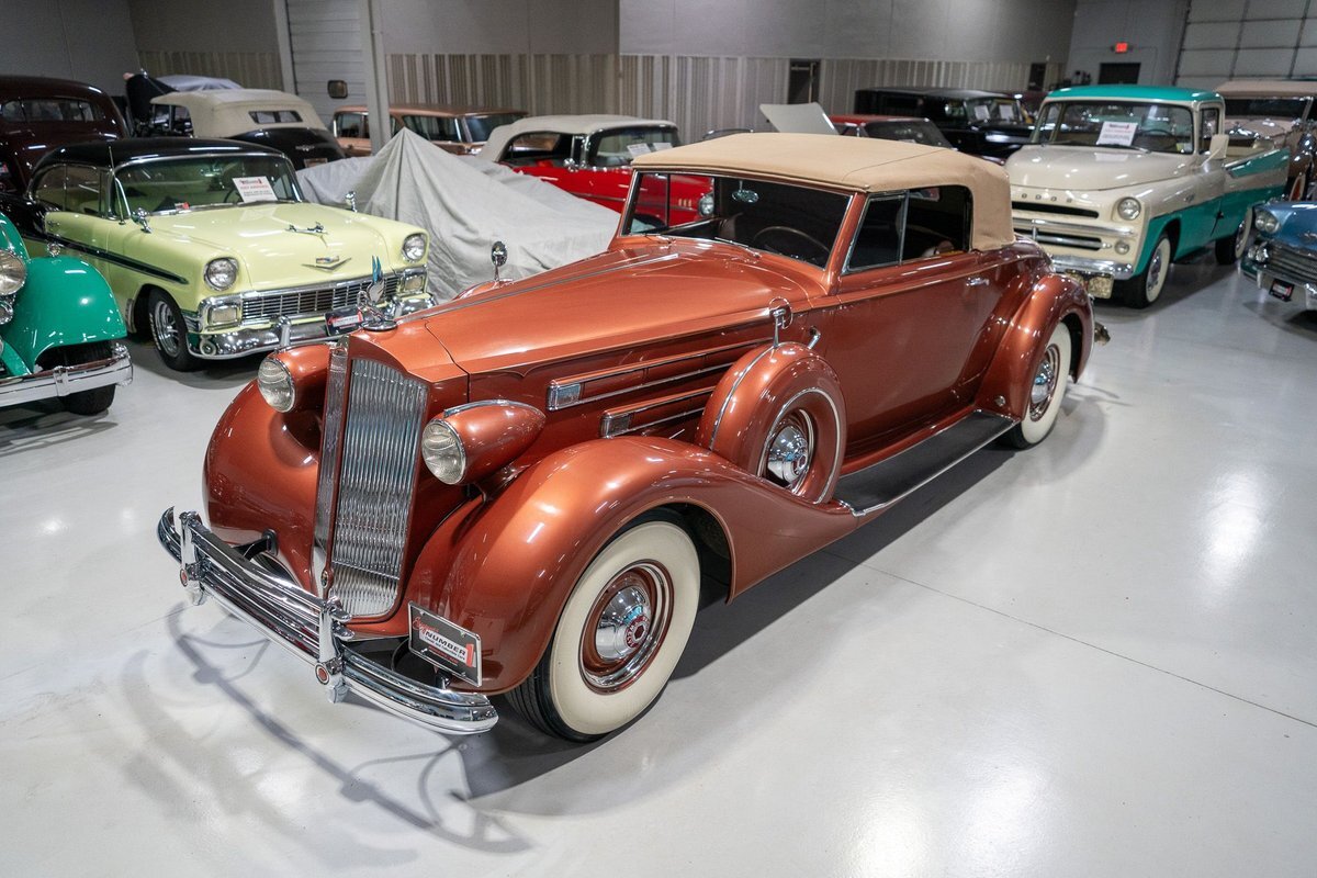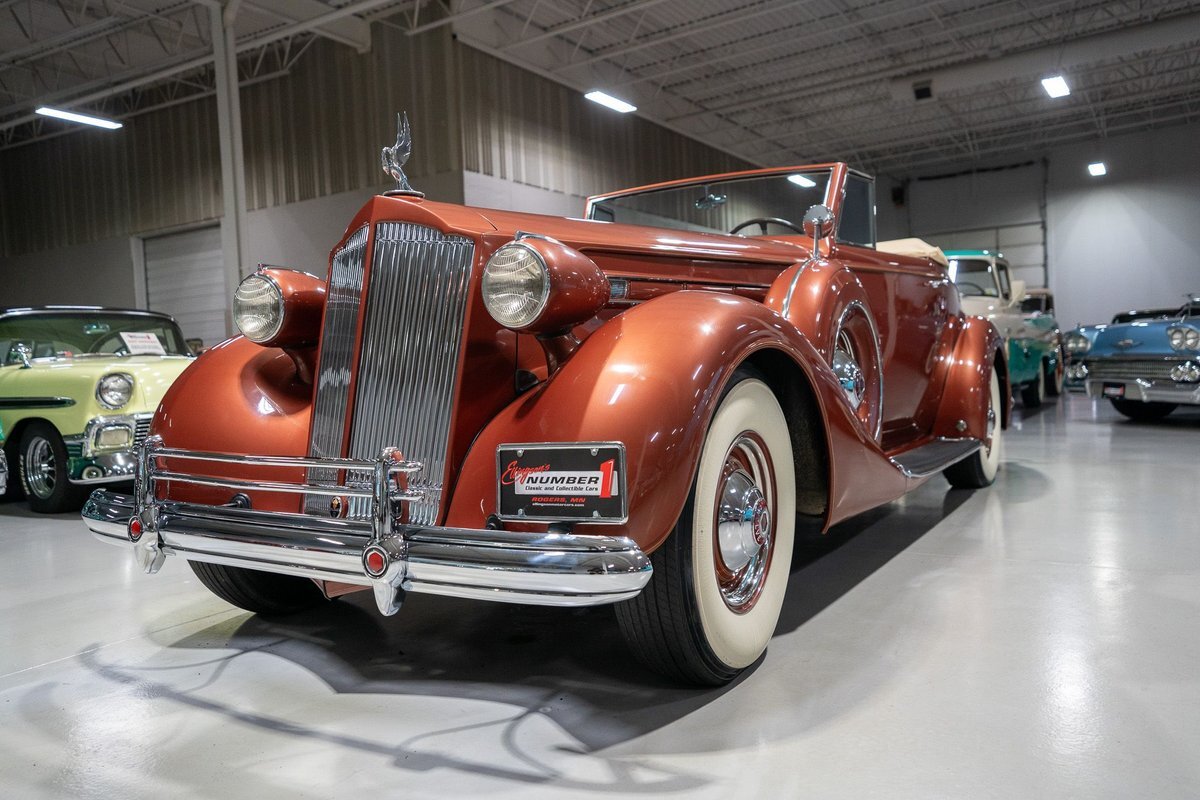 This 1937 Packard Twelve Model 1507-1039 Coupe-Roadster is an absolutely gorgeous V-12 Packard with impressive CCCA touring history. 1937 was an important year for Packard, the American luxury automaker who rose to prominence building some of the finest automobiles on US roads for decades. Like all American automobile manufacturers in the early 30s, Packard suffered significantly from the poor economic conditions and effects of the Great Depression. However, unlike virtually all of its luxury car manufacturer contemporaries, such as Marmon, Stutz, Auburn-Cord-Duesenberg, Peerless, and Pierce-Arrow, all of whom went bankrupt, Packard was able to survive and by 1937 Packard was thriving. Packard's ability to persevere through the Great Depression was due in large part to Packard's entry into the intermediate-priced car market. While Packard experienced impressive success selling its more affordably-priced Packard 120, the luxury automaker never completely abandoned its "Senior Packard" lines. In September 1936, the Fifteenth Series Packard Twelve models were introduced alongside the lower-level Super Eight models, however, the Packard Eight was gone. The 1937 Packards' most important and notable improvements were the mechanical upgrades. Up front, Packard swapped its single front axle for its new "Safe-T-Flex" independent front suspension that delivered a much smoother ride cruising down the road. In addition, Packard upgraded the braking system to a 4-wheel hydraulic setup, replacing the antiquated mechanical brakes that adorned Packard's previous generations. In addition, Packard modernized the doors on its Twelve models now outfitted with front hinges which was not only forward-looking but also much safer, compared to the suicide-style doors found on the earlier Packards. With the introduction of the 6 cylinder Packard 115 and the sales success of the more established 120, Packard sold the most cars in its history. Nonetheless, Packard produced a mere 1,300 Twelves, of which, included a believed 69 Model 1039 Coupe-Roadsters, which makes this particular vehicle a particularly rare automobile. The 1937 Packard Twelve's beauty and rarity means that it's recognized by the Classic Car Club of America (CCCA) as a Full Classic meaning that it qualifies to participate in CCCA events and CARavans. In addition, this particular Coupe Roadster comes to us from a prominent collector of Full Classics who is believed to have been the steward of this car for 40 years and won the CCCA William F. Crossett Award in this car on its debut CARavan. Powering this '37 Packard Twelve is a 473.3 Cubic Inch V-12 engine fed by a Stromberg single 2 barrel carburetor that was said to have created 175 horsepower when new. The 473 V12 is mated to a 3 speed manual transmission that is shifted using a floor mounted shifter. Braking is supplied to all four wheels via vacuum-assisted hydraulic brakes which makes bringing this 5,000+ pound Coupe Roadster to a complete stop much easier. This Fifteenth Series Packard is well appointed with options further elevating this particular roadster above many others. With dual side-mounted spare tires and matching side-mount covers, this 1937 Packard 12 has truly luxurious curb appeal. Moreover, each side-mount cover is topped by a chrome mirror which makes squeezing into a tight spot at the local car show or drive in much easier. The rear mounted luggage rack is another welcome addition so that you can easily carry all of your belongings with you on an overnight trip or cruise. The front bumper is also appointed with the optional bumper guards further elevating the exterior appearance of this impressive automobile. Golf club access doors are also incorporated into both sides of the Coupe Roadster which was a neat novelty of many Pre-War classics and makes this Senior Packard a car that you could take to the country club for a round on the links. Riding on a set of wide whitewall bias-ply tires mounted on wheel discs accented by Packard Twelve wheelcovers, this Full Classic has a stunning look whether parked at the car show or cruising down the road. The exterior has been refinished in a beautiful Copper Mist hue and was a tasteful update to this nearly 90 year old convertible. The beige cloth convertible top is manual operated and is in fantastic condition as well. The chrome and brightwork around the exterior of this 1937 Packard Twelve is in wonderful condition and complete the exceptional exterior look of this car. The interior of this 1937 Packard Model 1039 Roadster is absolutely stunning! The front bench seat and rear rumble seat have been reupholstered in elegant Walnut Brown leather. The matching upholstered door panels with armrests and burl woodgrain accents, burl woodgrain dash, and full-size banjo-style steering wheel are in outstanding condition as well and appear to be in their stock coniguration. This '37 Packard Twelve Roadster is outfitted with full instrumentation including a 120 MPH speedometer, temperature gauge, oil pressure gauge, amp gauge, and fuel gauge. Also incorporated into the instrument cluster is a clock and optional AM radio. Likewise, an optional heater is mounted neatly under the dash as well. The dash is completed with a pair of locking gloveboxes, starter button, headlight controls, throttle controls, and a cigar lighter. Whether you're adding to an existing collection of CCCA Full Classic or you are buying your first classic car, this 1937 Packard Twelve Model 1507-1039 Coupe-Roadster would make an excellent choice. Give Ellingson's a call today at763-428-7337!