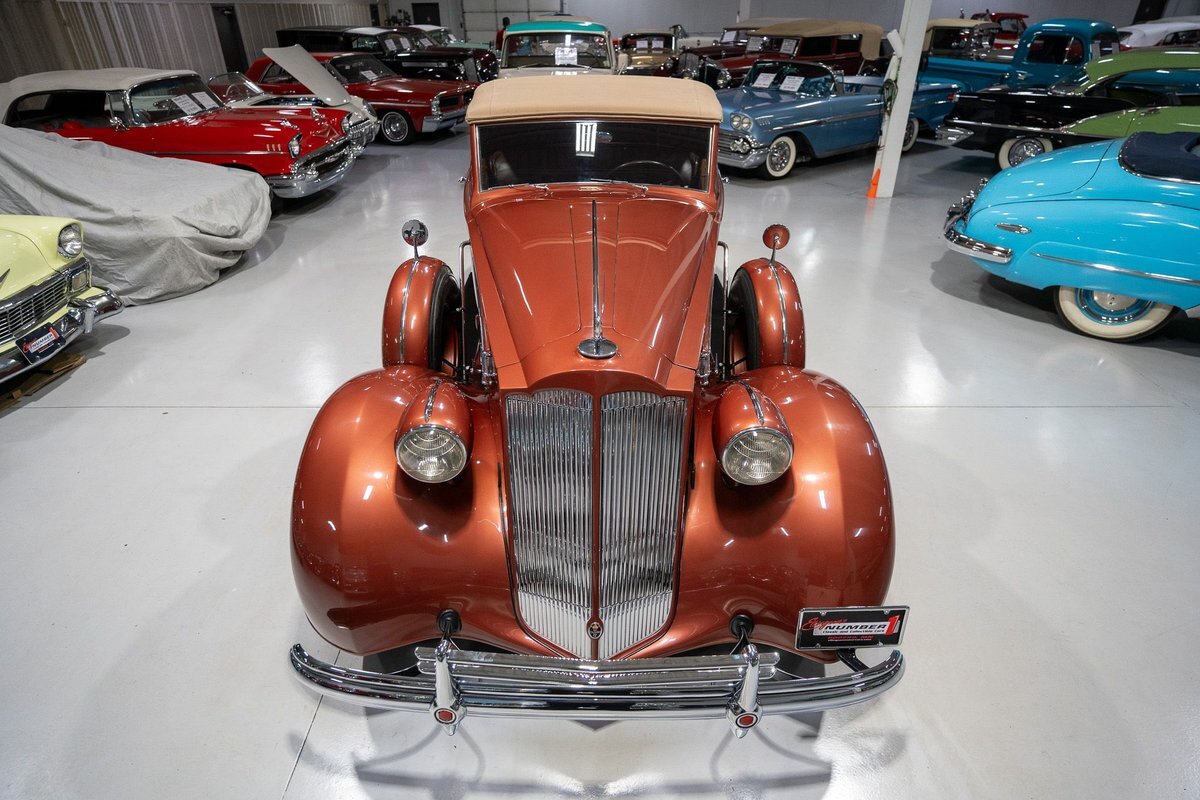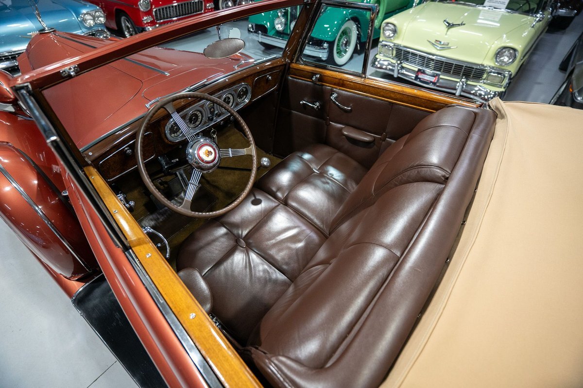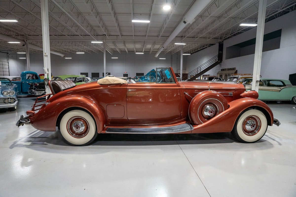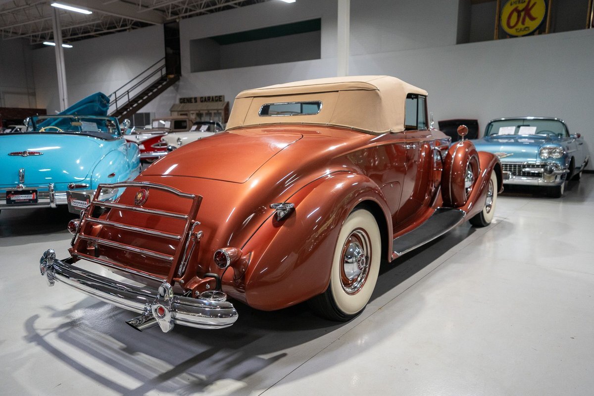 This 1937 Packard Twelve Model 1507-1039 Coupe-Roadster is an absolutely gorgeous V-12 Packard with impressive CCCA touring history. 1937 was an important year for Packard, the American luxury automaker who rose to prominence building some of the finest automobiles on US roads for decades. Like all American automobile manufacturers in the early 30s, Packard suffered significantly from the poor economic conditions and effects of the Great Depression. However, unlike virtually all of its luxury car manufacturer contemporaries, such as Marmon, Stutz, Auburn-Cord-Duesenberg, Peerless, and Pierce-Arrow, all of whom went bankrupt, Packard was able to survive and by 1937 Packard was thriving. Packard's ability to persevere through the Great Depression was due in large part to Packard's entry into the intermediate-priced car market. While Packard experienced impressive success selling its more affordably-priced Packard 120, the luxury automaker never completely abandoned its "Senior Packard" lines. In September 1936, the Fifteenth Series Packard Twelve models were introduced alongside the lower-level Super Eight models, however, the Packard Eight was gone. The 1937 Packards' most important and notable improvements were the mechanical upgrades. Up front, Packard swapped its single front axle for its new "Safe-T-Flex" independent front suspension that delivered a much smoother ride cruising down the road. In addition, Packard upgraded the braking system to a 4-wheel hydraulic setup, replacing the antiquated mechanical brakes that adorned Packard's previous generations. In addition, Packard modernized the doors on its Twelve models now outfitted with front hinges which was not only forward-looking but also much safer, compared to the suicide-style doors found on the earlier Packards. With the introduction of the 6 cylinder Packard 115 and the sales success of the more established 120, Packard sold the most cars in its history. Nonetheless, Packard produced a mere 1,300 Twelves, of which, included a believed 69 Model 1039 Coupe-Roadsters, which makes this particular vehicle a particularly rare automobile. The 1937 Packard Twelve's beauty and rarity means that it's recognized by the Classic Car Club of America (CCCA) as a Full Classic meaning that it qualifies to participate in CCCA events and CARavans. In addition, this particular Coupe Roadster comes to us from a prominent collector of Full Classics who is believed to have been the steward of this car for 40 years and won the CCCA William F. Crossett Award in this car on its debut CARavan. Powering this '37 Packard Twelve is a 473.3 Cubic Inch V-12 engine fed by a Stromberg single 2 barrel carburetor that was said to have created 175 horsepower when new. The 473 V12 is mated to a 3 speed manual transmission that is shifted using a floor mounted shifter. Braking is supplied to all four wheels via vacuum-assisted hydraulic brakes which makes bringing this 5,000+ pound Coupe Roadster to a complete stop much easier. This Fifteenth Series Packard is well appointed with options further elevating this particular roadster above many others. With dual side-mounted spare tires and matching side-mount covers, this 1937 Packard 12 has truly luxurious curb appeal. Moreover, each side-mount cover is topped by a chrome mirror which makes squeezing into a tight spot at the local car show or drive in much easier. The rear mounted luggage rack is another welcome addition so that you can easily carry all of your belongings with you on an overnight trip or cruise. The front bumper is also appointed with the optional bumper guards further elevating the exterior appearance of this impressive automobile. Golf club access doors are also incorporated into both sides of the Coupe Roadster which was a neat novelty of many Pre-War classics and makes this Senior Packard a car that you could take to the country club for a round on the links. Riding on a set of wide whitewall bias-ply tires mounted on wheel discs accented by Packard Twelve wheelcovers, this Full Classic has a stunning look whether parked at the car show or cruising down the road. The exterior has been refinished in a beautiful Copper Mist hue and was a tasteful update to this nearly 90 year old convertible. The beige cloth convertible top is manual operated and is in fantastic condition as well. The chrome and brightwork around the exterior of this 1937 Packard Twelve is in wonderful condition and complete the exceptional exterior look of this car. The interior of this 1937 Packard Model 1039 Roadster is absolutely stunning! The front bench seat and rear rumble seat have been reupholstered in elegant Walnut Brown leather. The matching upholstered door panels with armrests and burl woodgrain accents, burl woodgrain dash, and full-size banjo-style steering wheel are in outstanding condition as well and appear to be in their stock coniguration. This '37 Packard Twelve Roadster is outfitted with full instrumentation including a 120 MPH speedometer, temperature gauge, oil pressure gauge, amp gauge, and fuel gauge. Also incorporated into the instrument cluster is a clock and optional AM radio. Likewise, an optional heater is mounted neatly under the dash as well. The dash is completed with a pair of locking gloveboxes, starter button, headlight controls, throttle controls, and a cigar lighter. Whether you're adding to an existing collection of CCCA Full Classic or you are buying your first classic car, this 1937 Packard Twelve Model 1507-1039 Coupe-Roadster would make an excellent choice. Give Ellingson's a call today at763-428-7337!