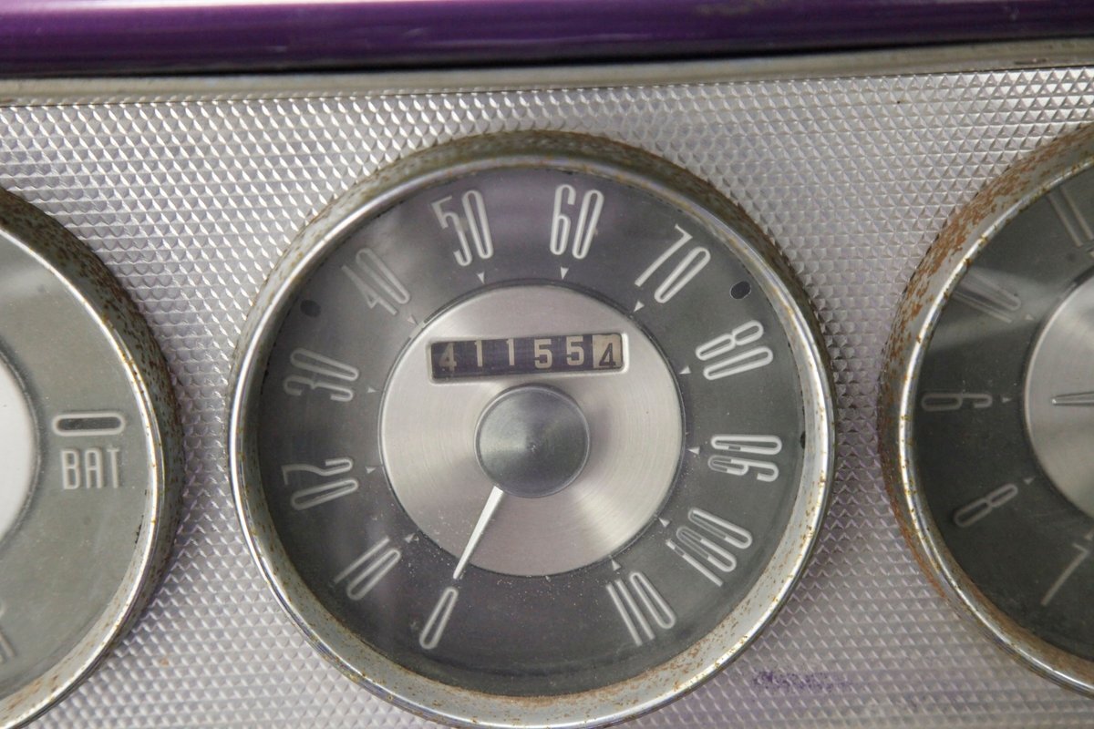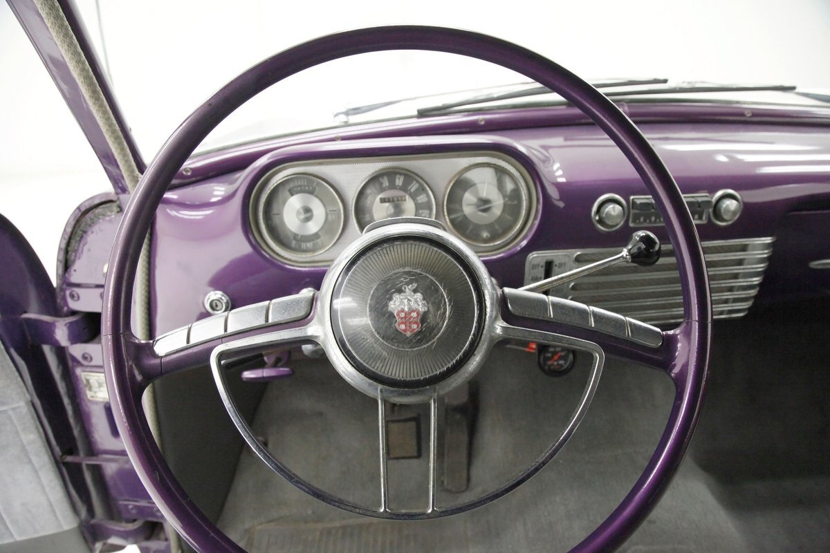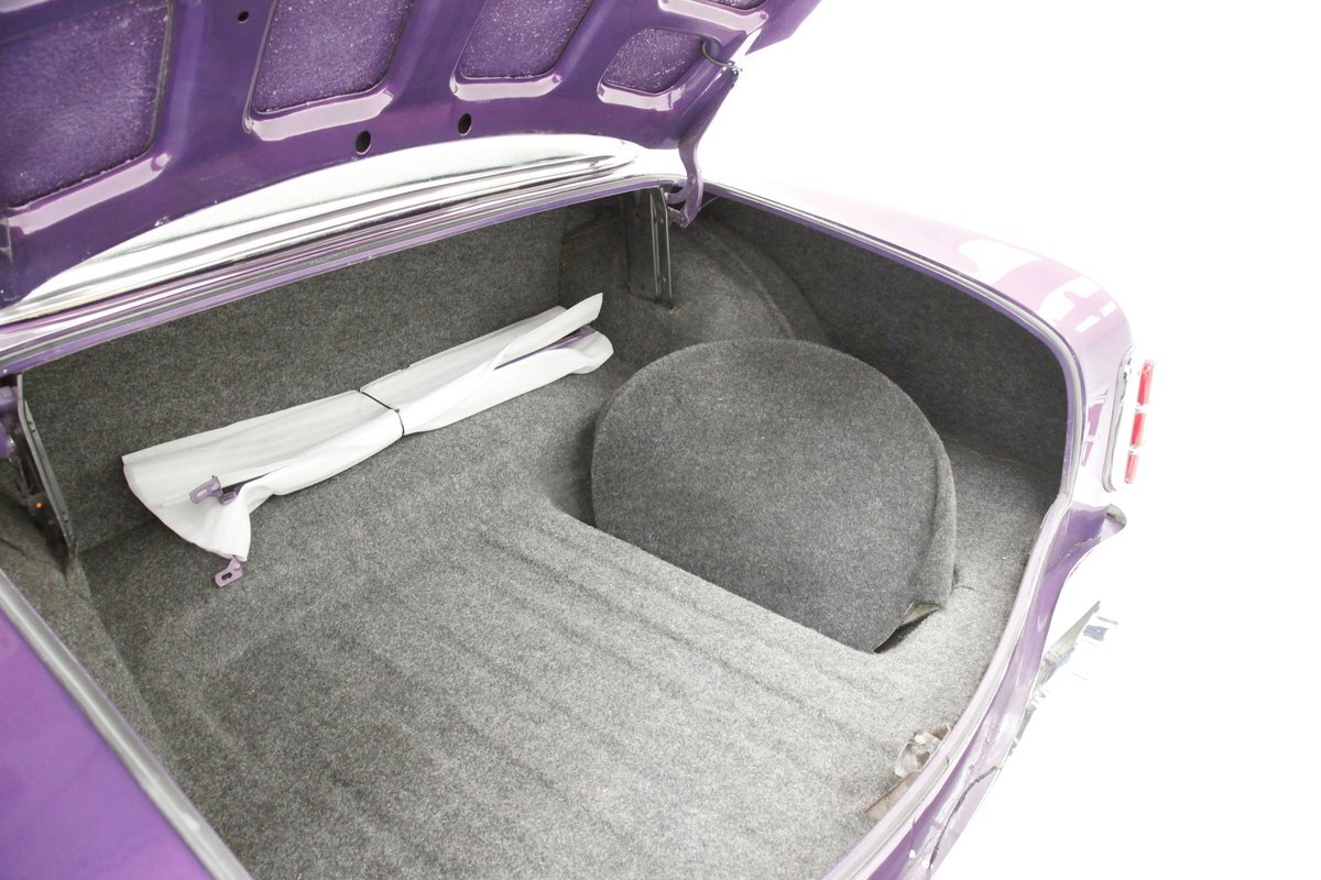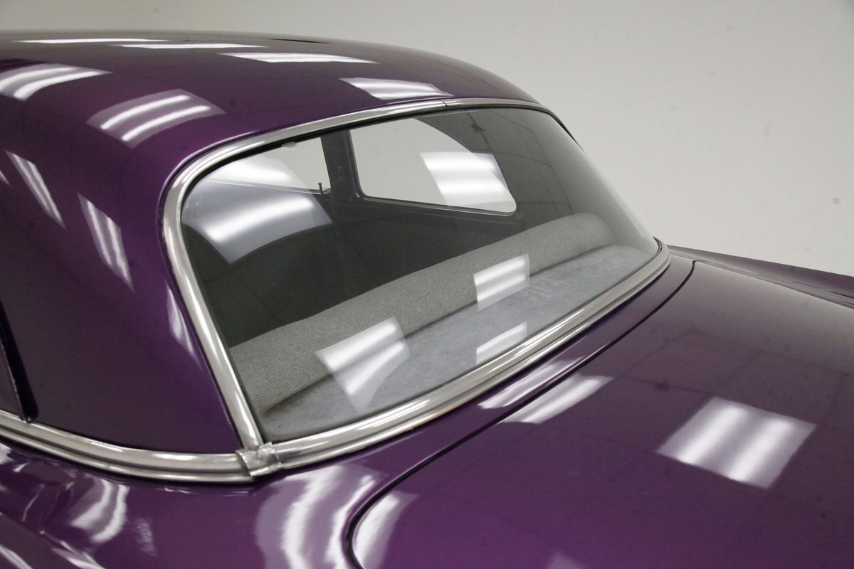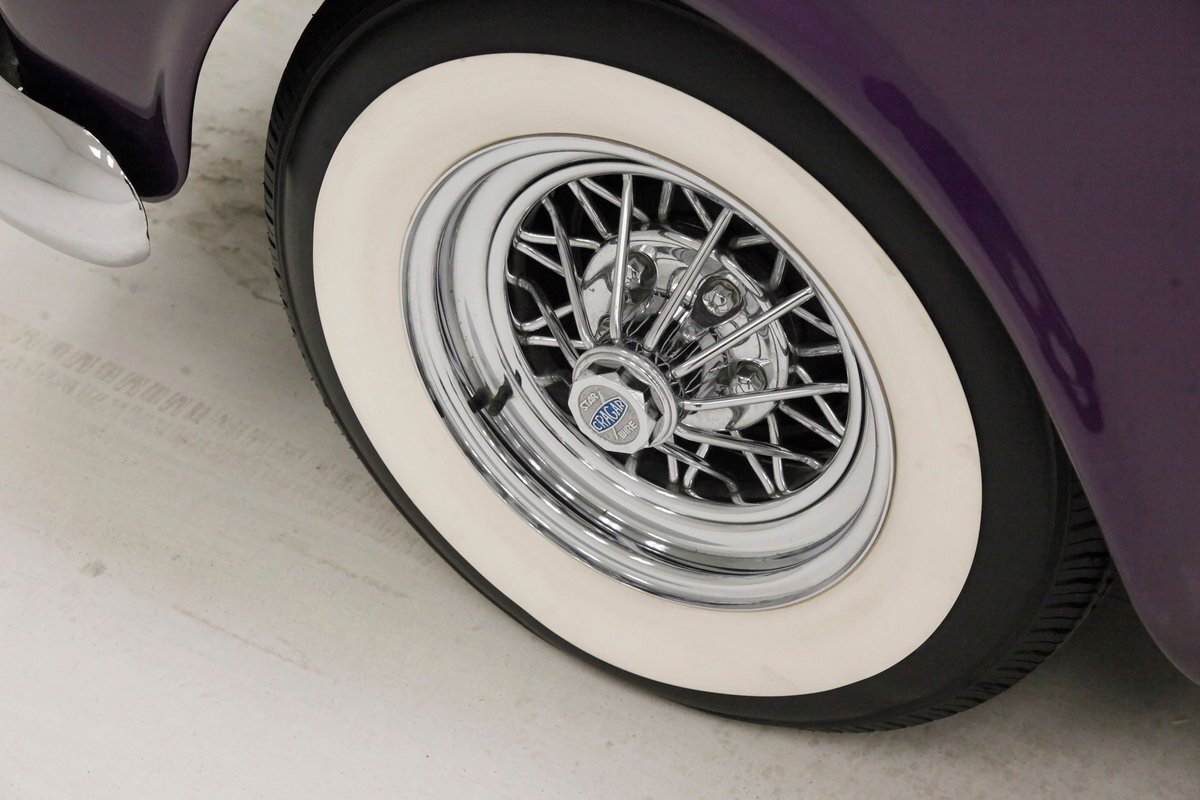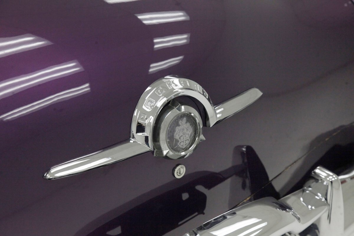 With its flying plane/bird hood ornament, large chromed open mouth design front grille, and 4 count 'em 4 lights adorning the front, this car screams you have arrived in more ways than one. 2 of said lights are the chrome bezel dressed headlights and 2 more are mounted within the shiny chrome grille as the marker/signal lights. Bathed in a splendid purple metallic, the amazingly straight and near perfectly aligned panels adorn this car. A few faults are noted in the paint in the form of some bubbling at a few seams, a few scuffs and dings, and areas where it appears something was set on the paint and over time it dulled, but these are only noticeable upon close inspection. Sparse trimmings accent the purple, including aforementioned headlight bezels and the front grille which is to die for, the hood ornament, and wrap-around passenger compartment trimmings. Wide whites are worn by polished to the nines 15-inch Cragar Star Wire wheels and with 2 doors it's all in excellent condition. Looking from the side view you can see the artistic lines used for the rear wrap around glass, bump out fenders for the rear, tastefully rounded finned rear quarters with tall ovoid tail lights, and even the gently wrapping chrome rear bumper with its small bed rail center guard. A small cloisonne badge is in the grille and trunk just to remind you of the brand you are driving.