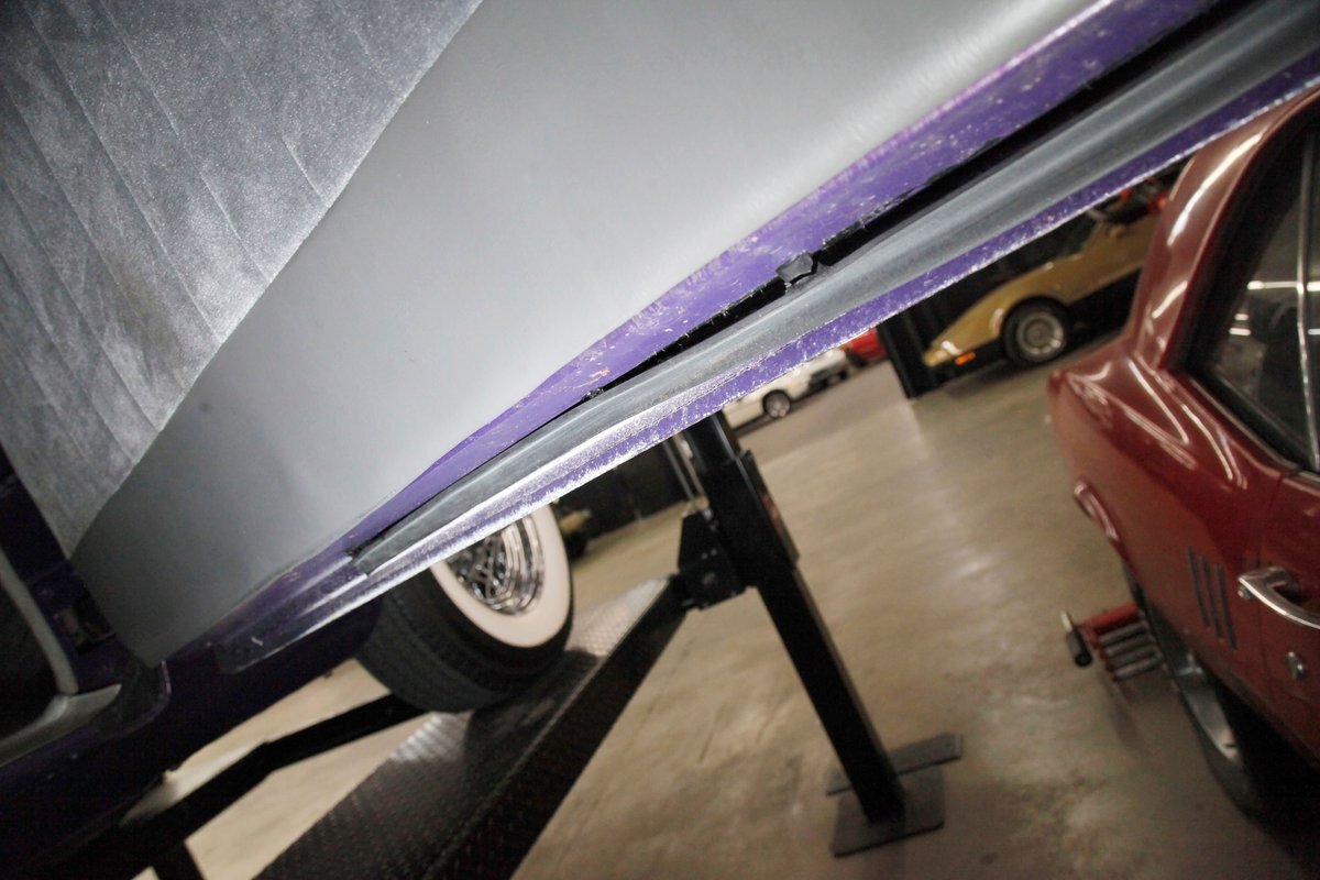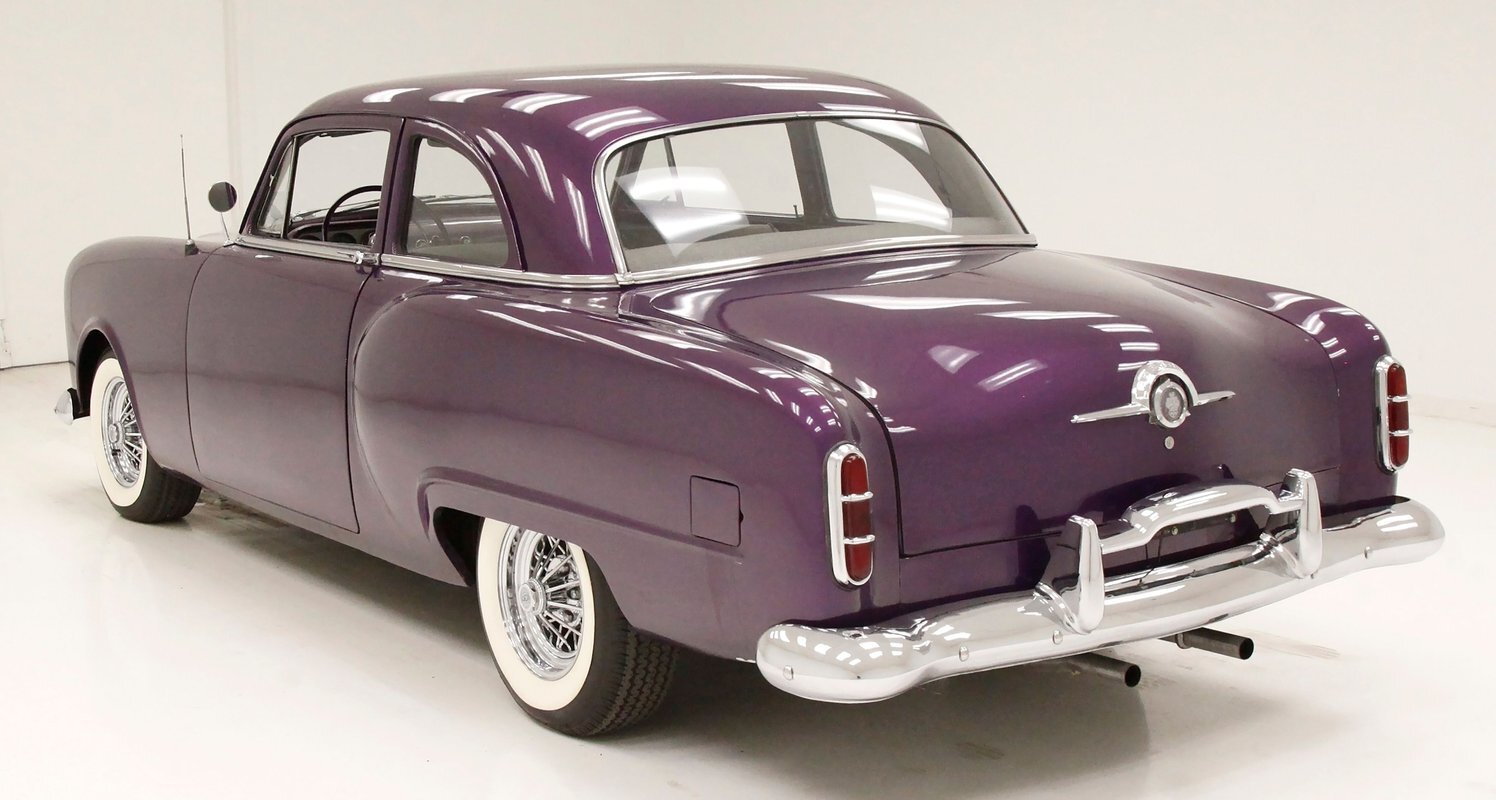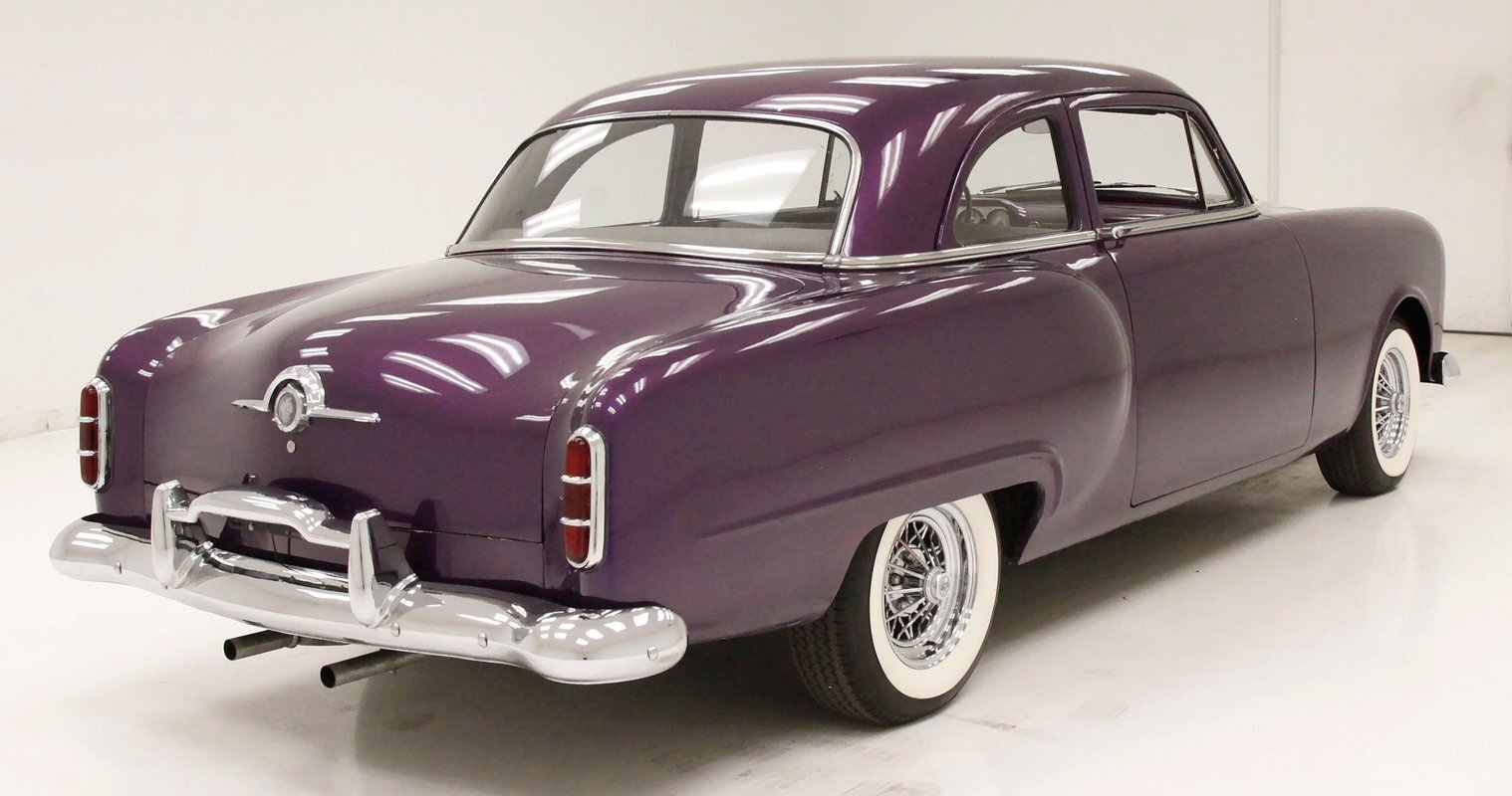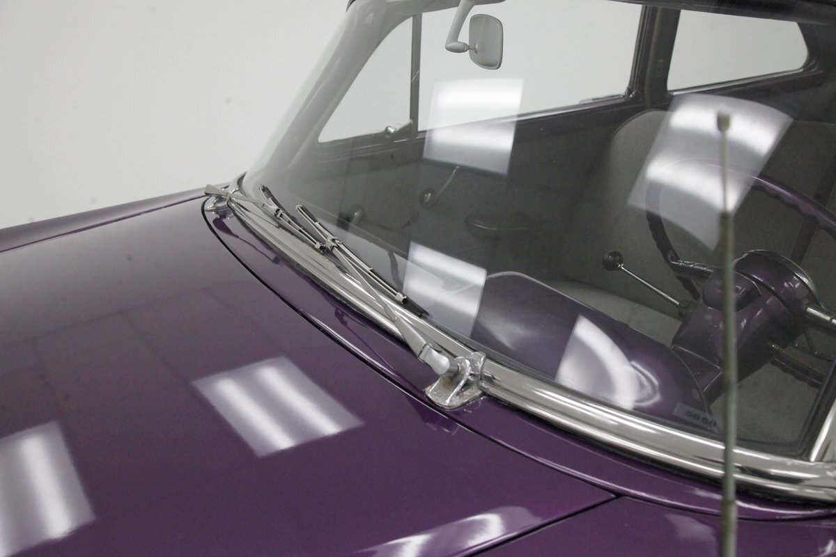 With its flying plane/bird hood ornament, large chromed open mouth design front grille, and 4 count 'em 4 lights adorning the front, this car screams you have arrived in more ways than one. 2 of said lights are the chrome bezel dressed headlights and 2 more are mounted within the shiny chrome grille as the marker/signal lights. Bathed in a splendid purple metallic, the amazingly straight and near perfectly aligned panels adorn this car. A few faults are noted in the paint in the form of some bubbling at a few seams, a few scuffs and dings, and areas where it appears something was set on the paint and over time it dulled, but these are only noticeable upon close inspection. Sparse trimmings accent the purple, including aforementioned headlight bezels and the front grille which is to die for, the hood ornament, and wrap-around passenger compartment trimmings. Wide whites are worn by polished to the nines 15-inch Cragar Star Wire wheels and with 2 doors it's all in excellent condition. Looking from the side view you can see the artistic lines used for the rear wrap around glass, bump out fenders for the rear, tastefully rounded finned rear quarters with tall ovoid tail lights, and even the gently wrapping chrome rear bumper with its small bed rail center guard. A small cloisonne badge is in the grille and trunk just to remind you of the brand you are driving.