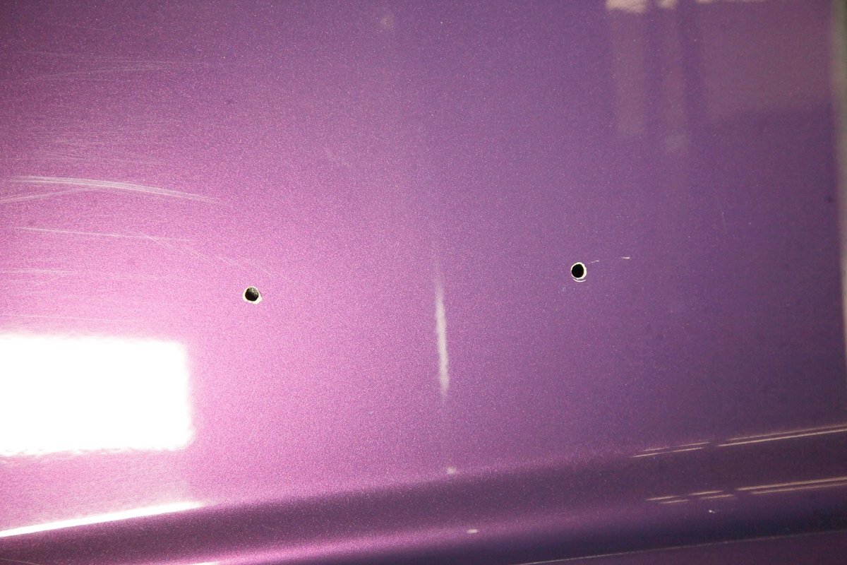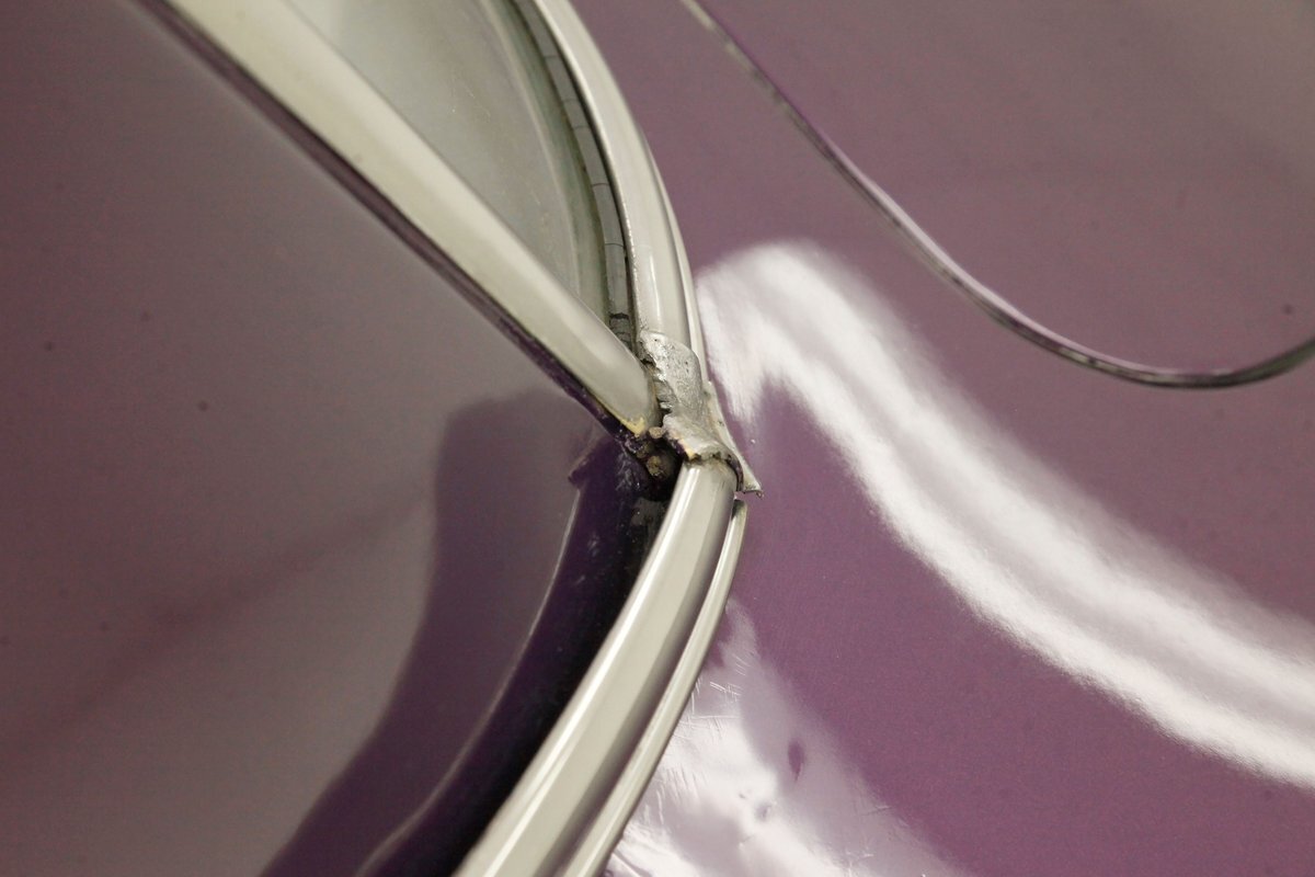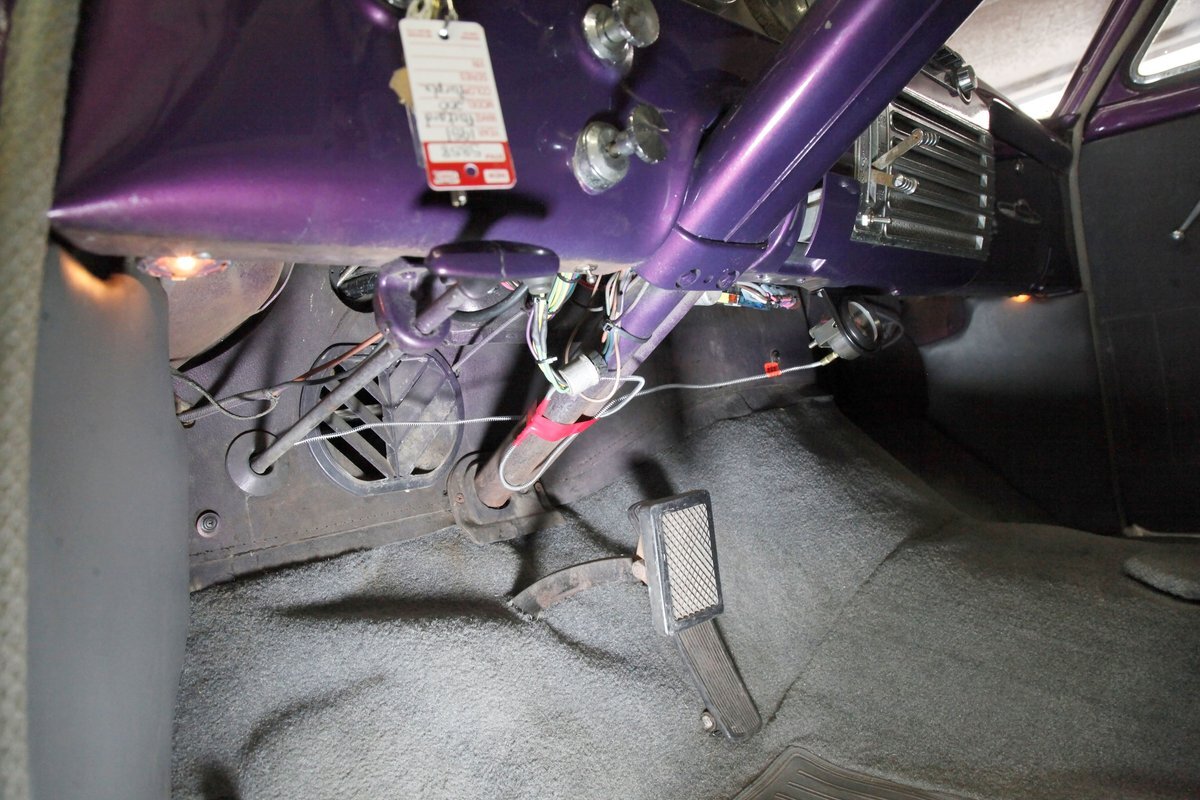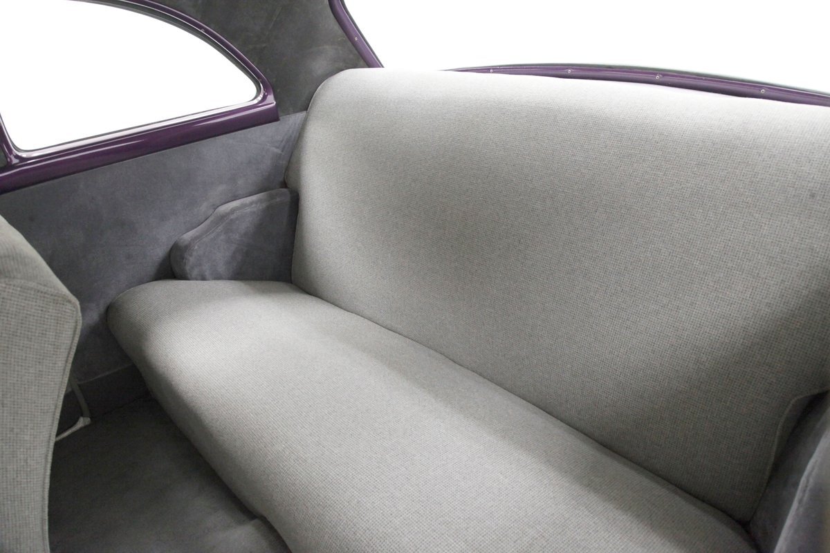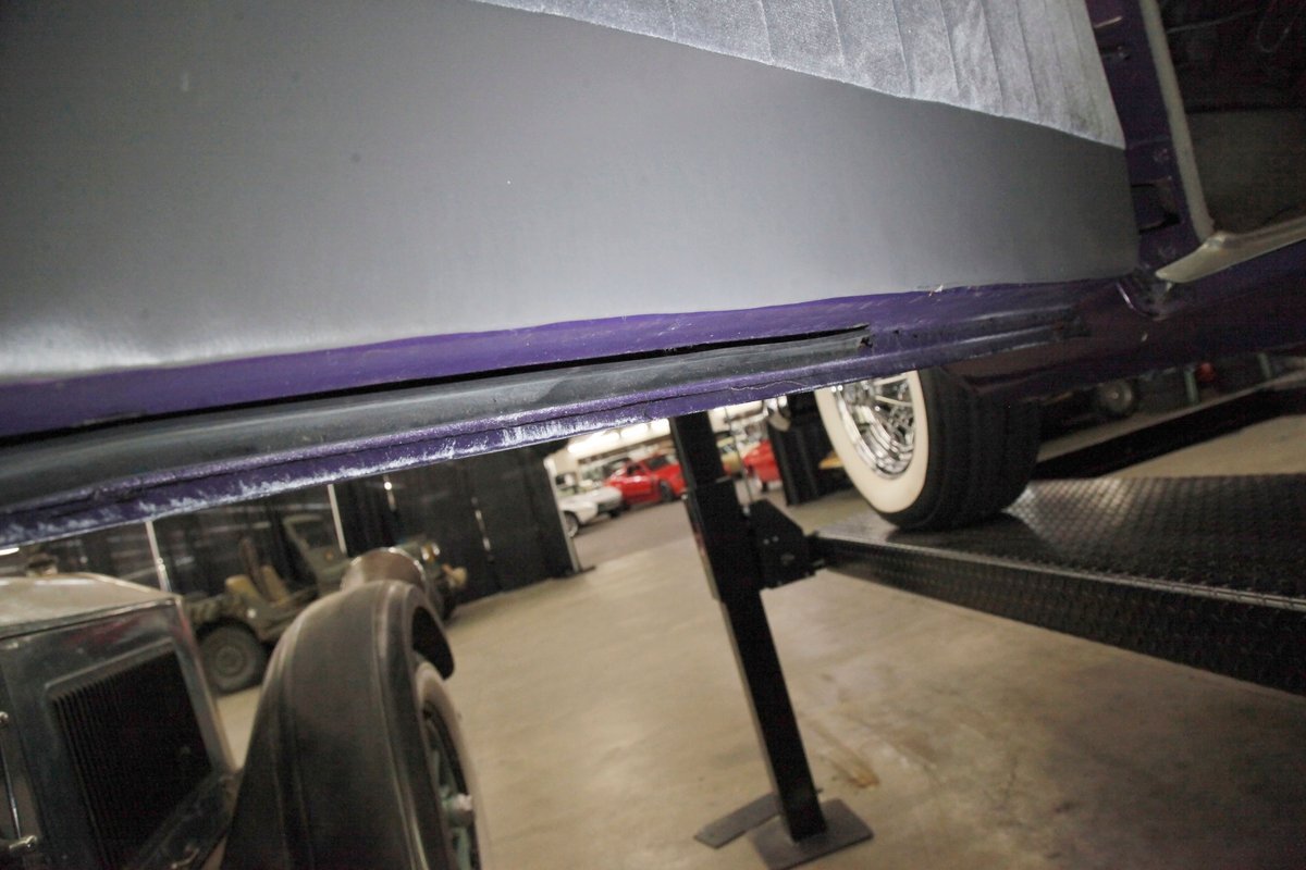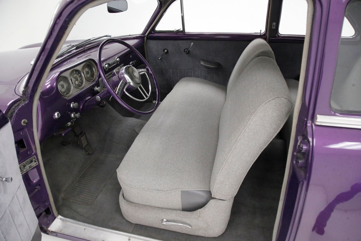 With its flying plane/bird hood ornament, large chromed open mouth design front grille, and 4 count 'em 4 lights adorning the front, this car screams you have arrived in more ways than one. 2 of said lights are the chrome bezel dressed headlights and 2 more are mounted within the shiny chrome grille as the marker/signal lights. Bathed in a splendid purple metallic, the amazingly straight and near perfectly aligned panels adorn this car. A few faults are noted in the paint in the form of some bubbling at a few seams, a few scuffs and dings, and areas where it appears something was set on the paint and over time it dulled, but these are only noticeable upon close inspection. Sparse trimmings accent the purple, including aforementioned headlight bezels and the front grille which is to die for, the hood ornament, and wrap-around passenger compartment trimmings. Wide whites are worn by polished to the nines 15-inch Cragar Star Wire wheels and with 2 doors it's all in excellent condition. Looking from the side view you can see the artistic lines used for the rear wrap around glass, bump out fenders for the rear, tastefully rounded finned rear quarters with tall ovoid tail lights, and even the gently wrapping chrome rear bumper with its small bed rail center guard. A small cloisonne badge is in the grille and trunk just to remind you of the brand you are driving.