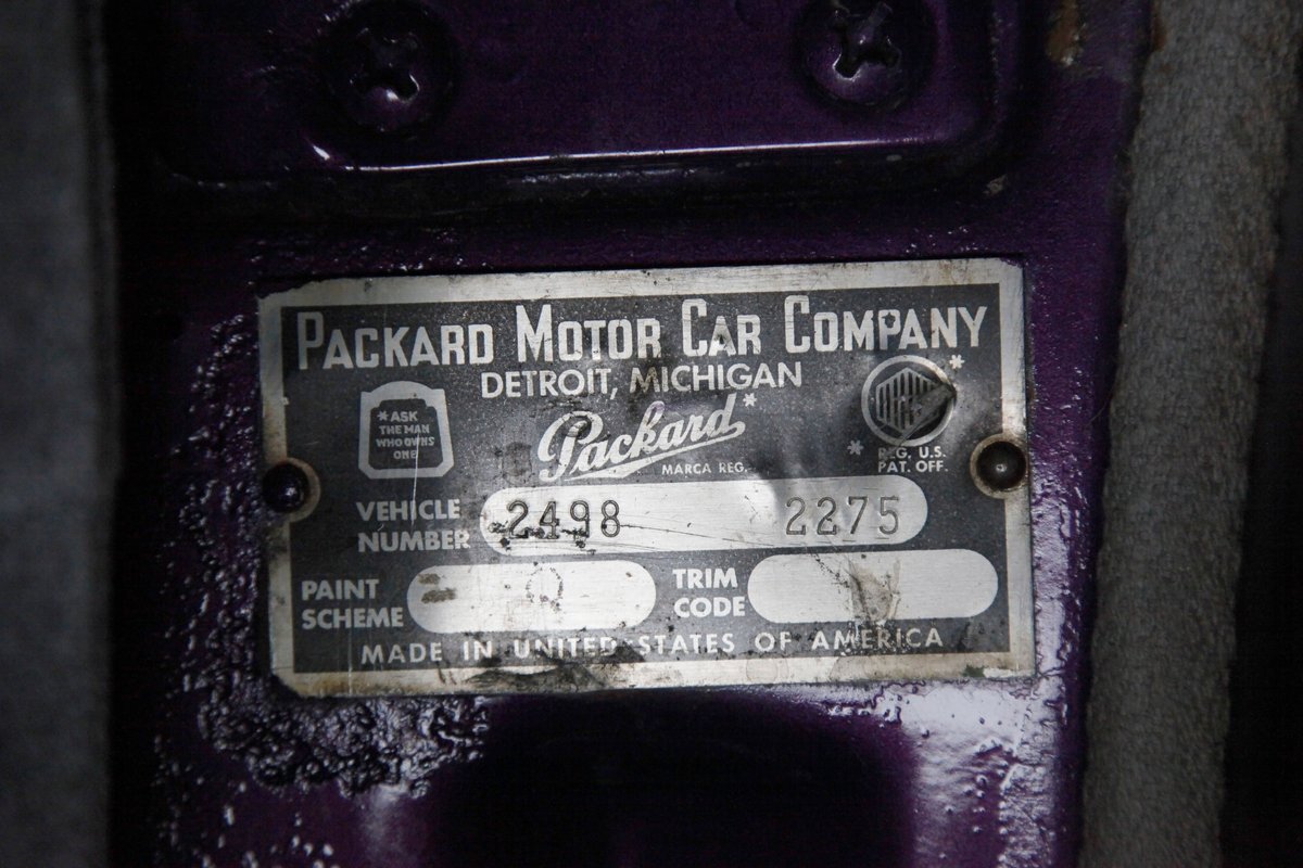 With a swing of the doors you know you are going to be in for a treat just with the intricate stitched tuck and roll pattern for the door panels. Light gray tweed makes these up and they are nicely preserved, with darker gray vinyl arm rests, shiny actuators and cranks. Dual benches, (split in the front), stretch from door to door, and sport smooth gray tweed for the cushions as well as the seat tubs. A near perfect purple metal dash fronts the seating and uses a small oval for the gauge cluster with a trio of round gauges within is fronted by the large round purple colored bakelite steering wheel with a half chromed horn rig attaching the 2 arched bakelite spokes. In the center is a rectangle bezel surrounded radio and just below a chrome ribbed speaker cover with some levers on the left side. On the passenger side is a Packard badged glove box and an aftermarket water temperature gauge hangs under dash central. Gray carpet floods the floors and is showing light staining and wear and a fuzzy gray mohair headliner is above and showing nicely, also the trunk has also been restored with gray fuzzy carpeting.