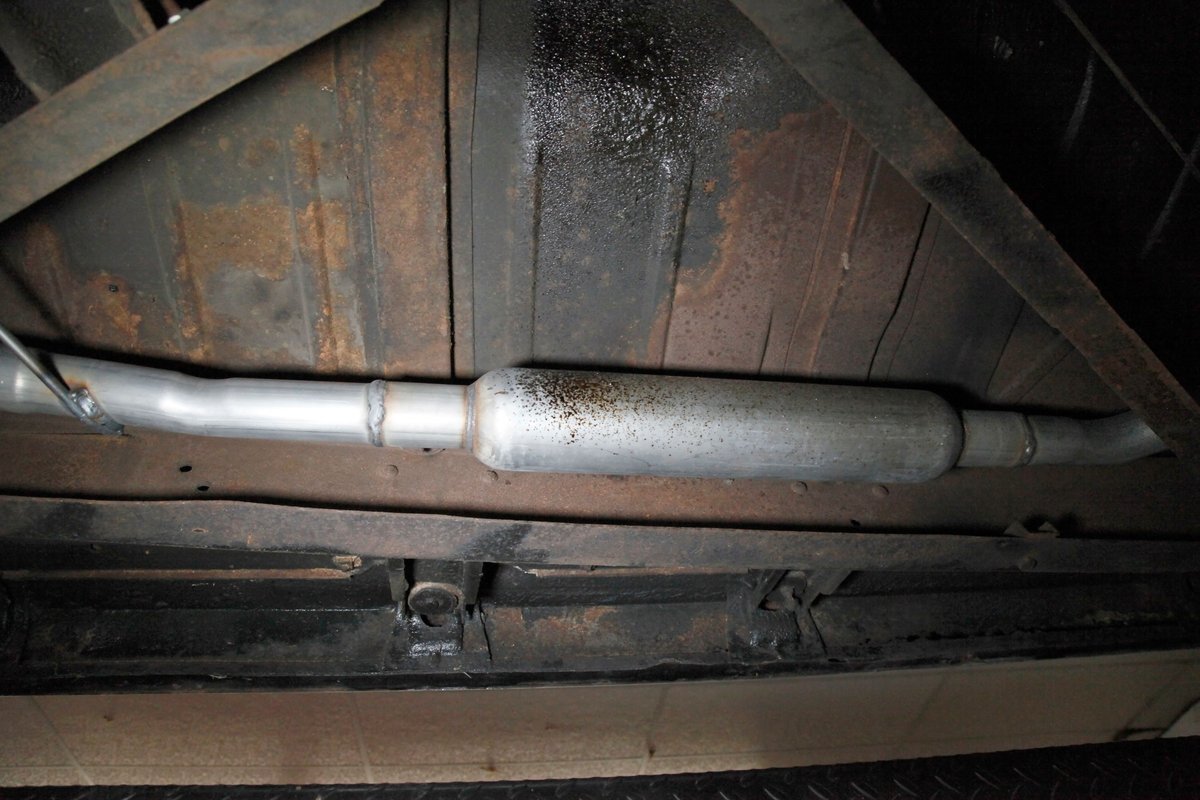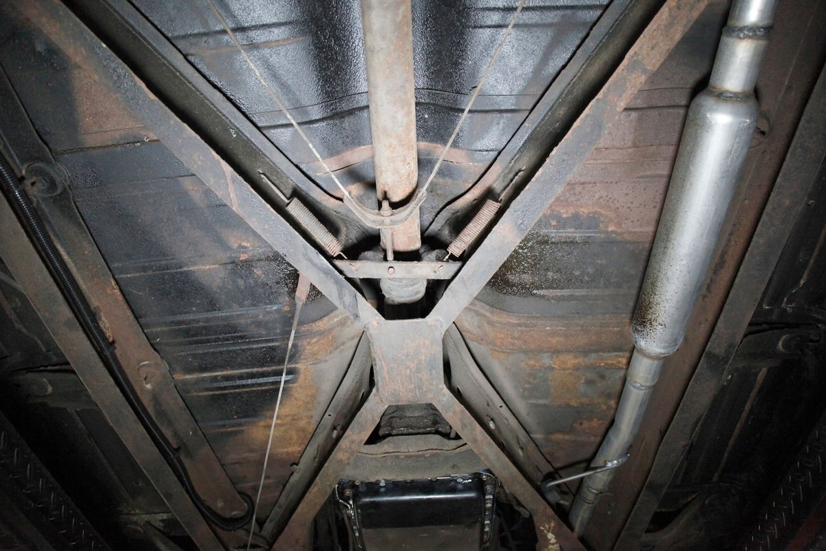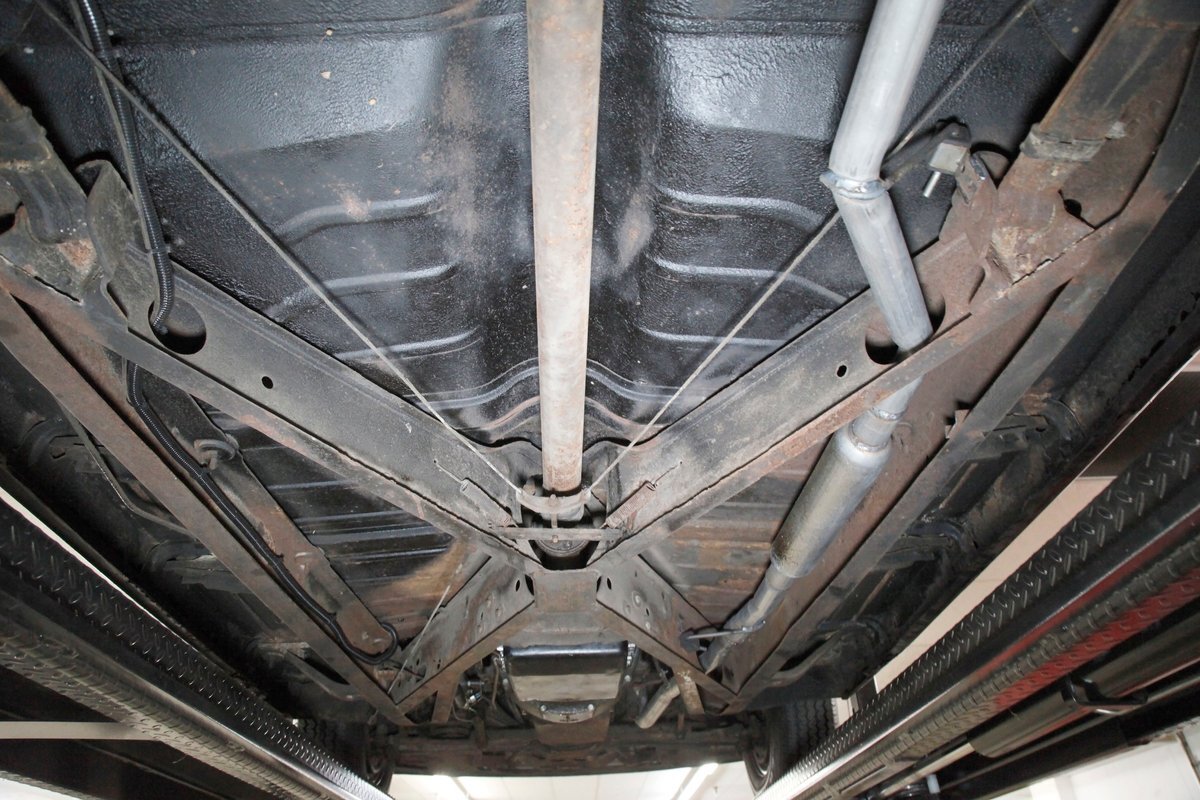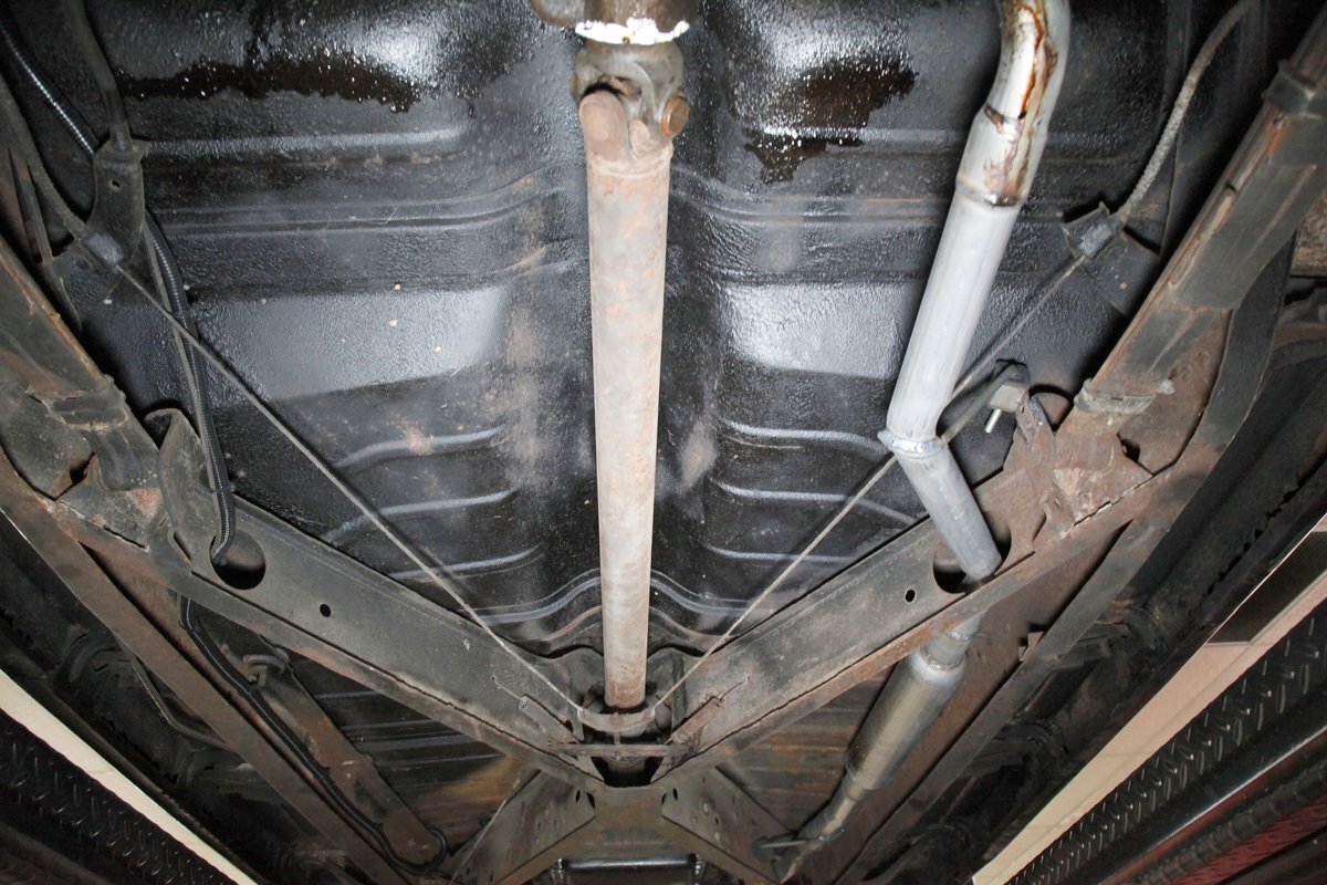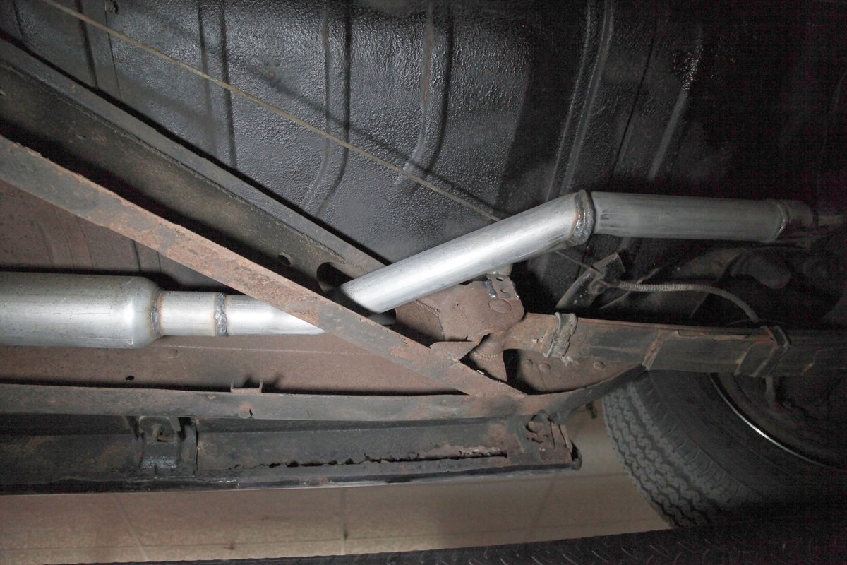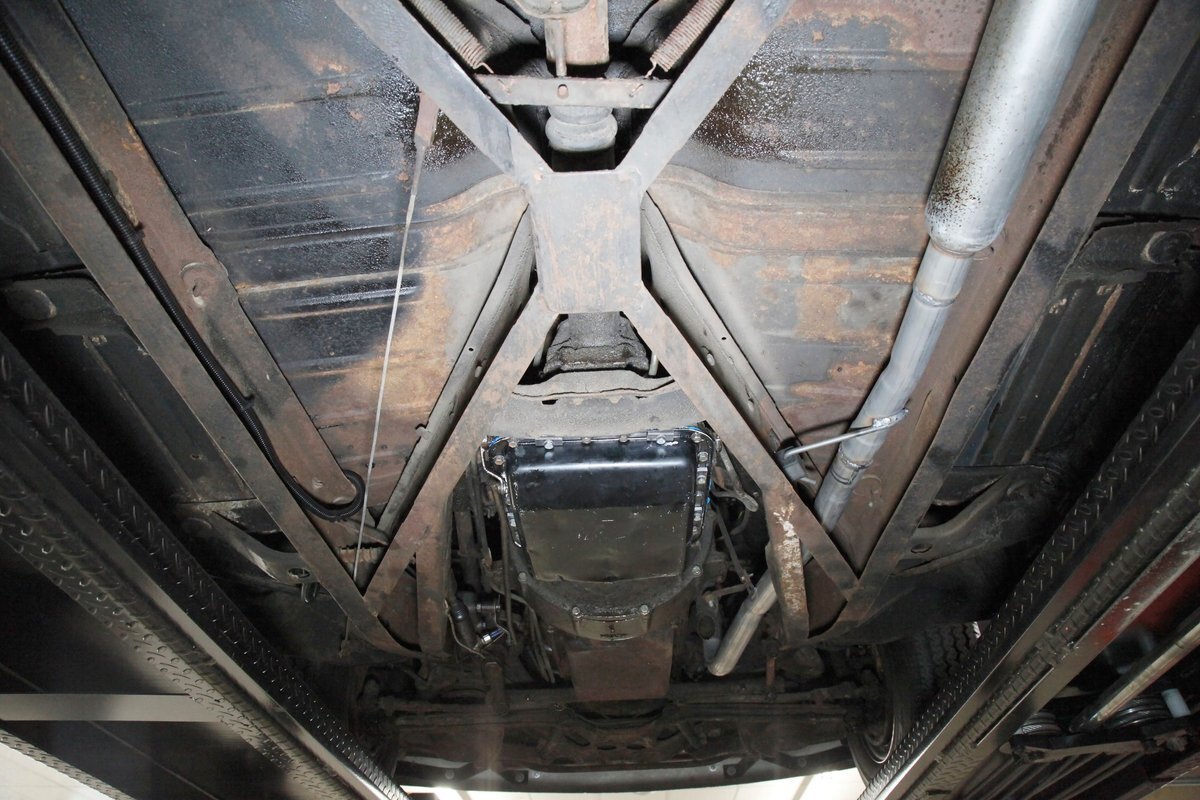 With some faded black but totally rust free surfaces the X frame undercarriage is looking just great and solid save for invasive rust appearing on the inner rockers and trunk drop offs. Independent coil springs for the front and leaf springs for the rear suspension and drum brakes all around are seen. Single exhaust with a glasspack muffler is in charge of the exhale.