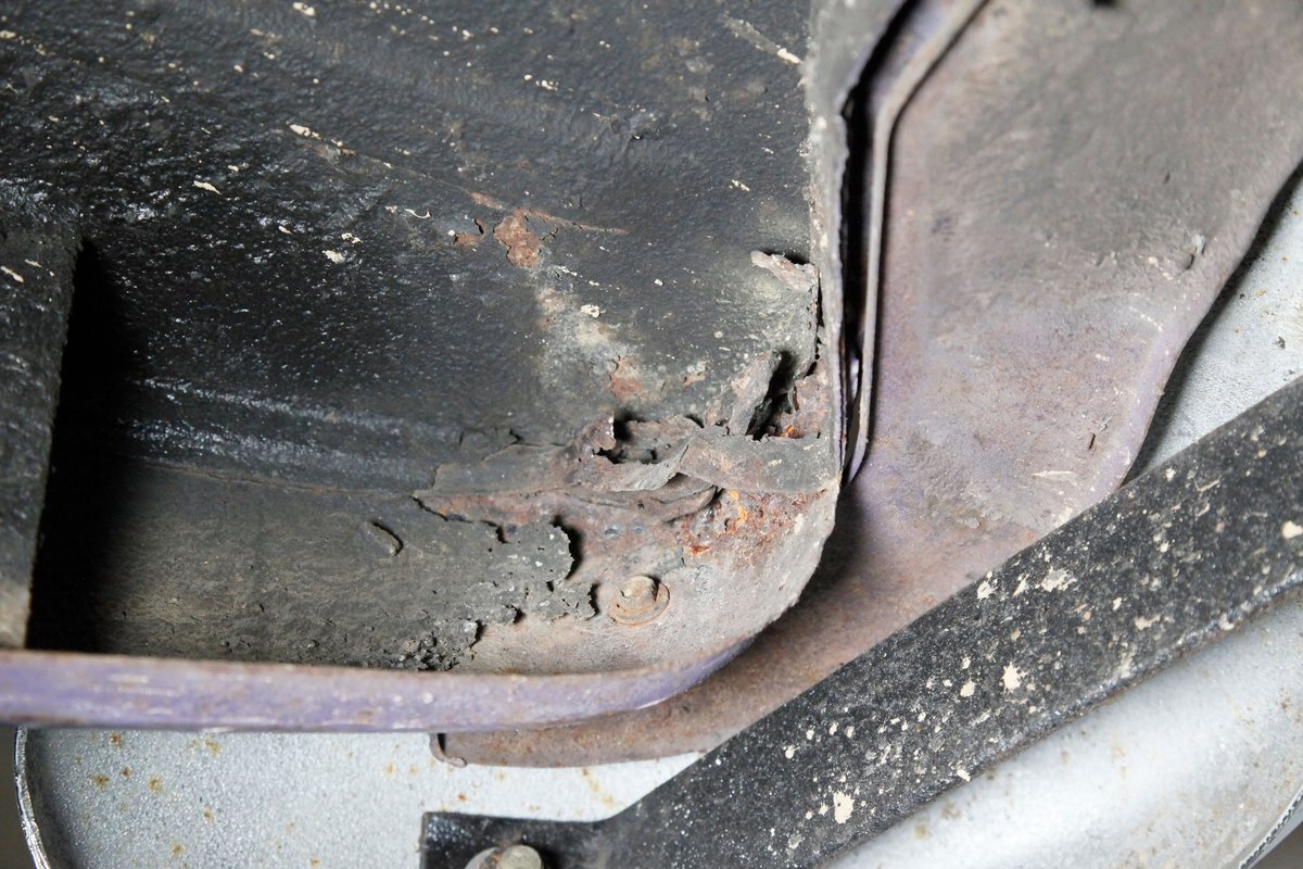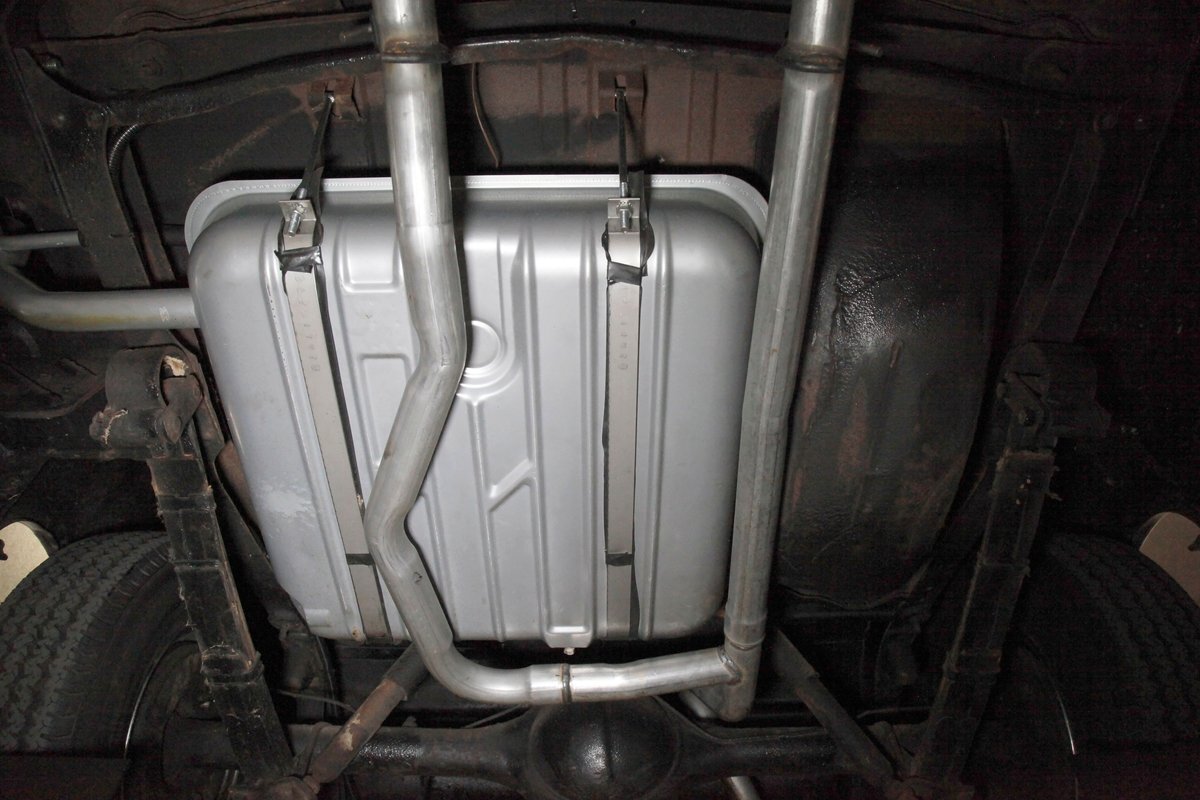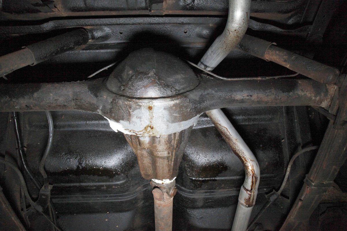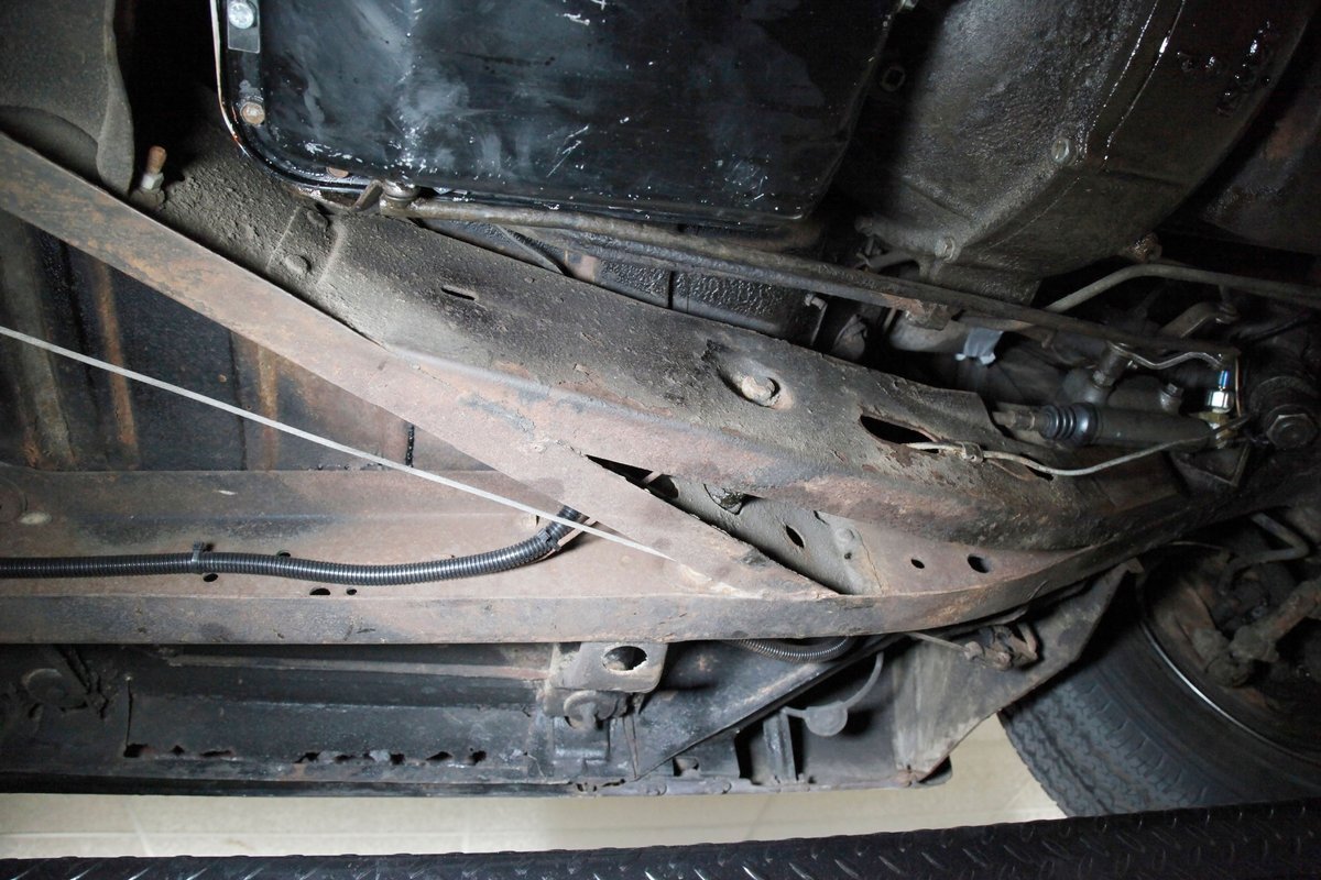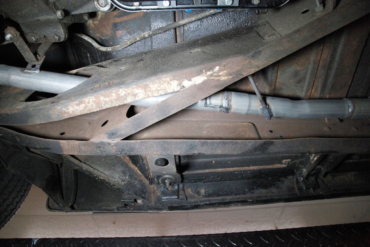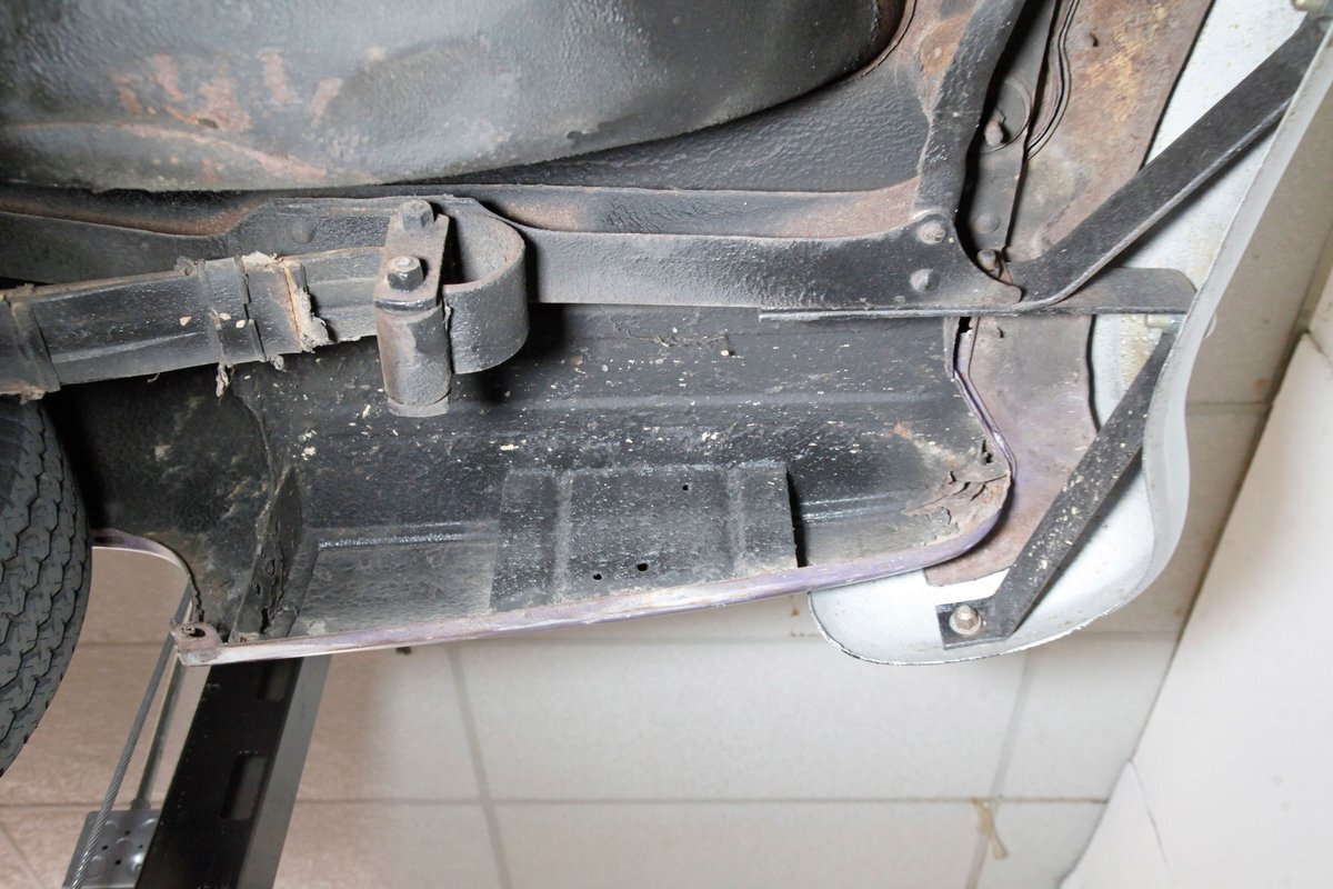 With some faded black but totally rust free surfaces the X frame undercarriage is looking just great and solid save for invasive rust appearing on the inner rockers and trunk drop offs. Independent coil springs for the front and leaf springs for the rear suspension and drum brakes all around are seen. Single exhaust with a glasspack muffler is in charge of the exhale.