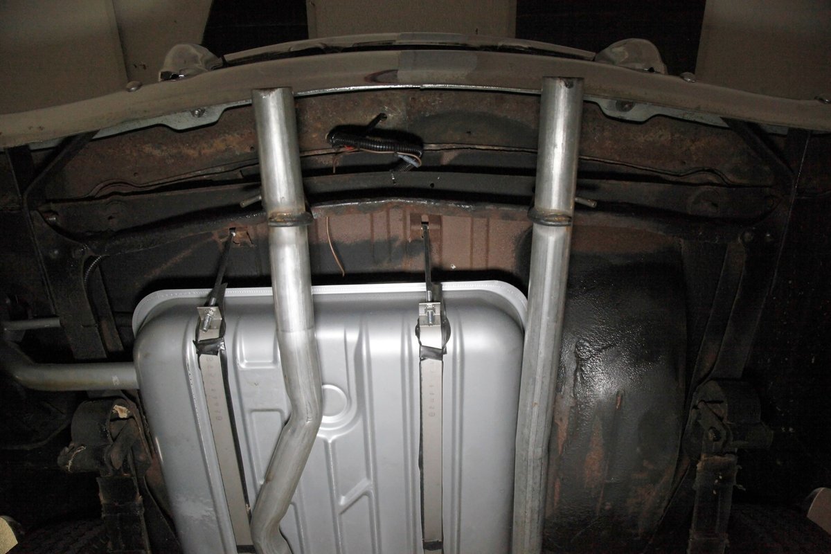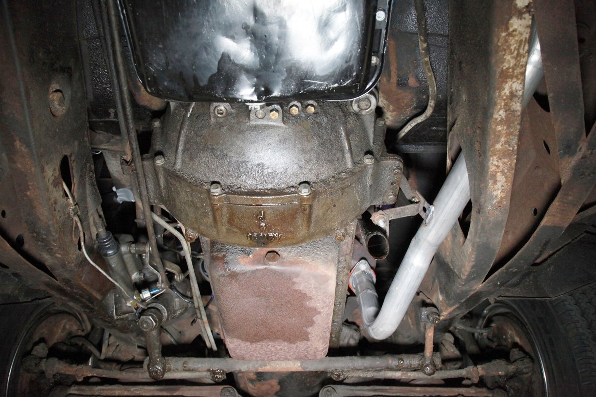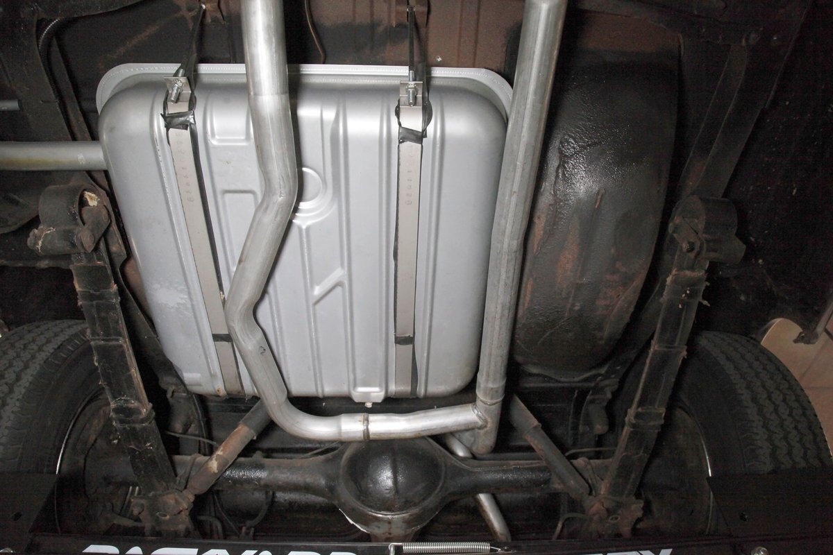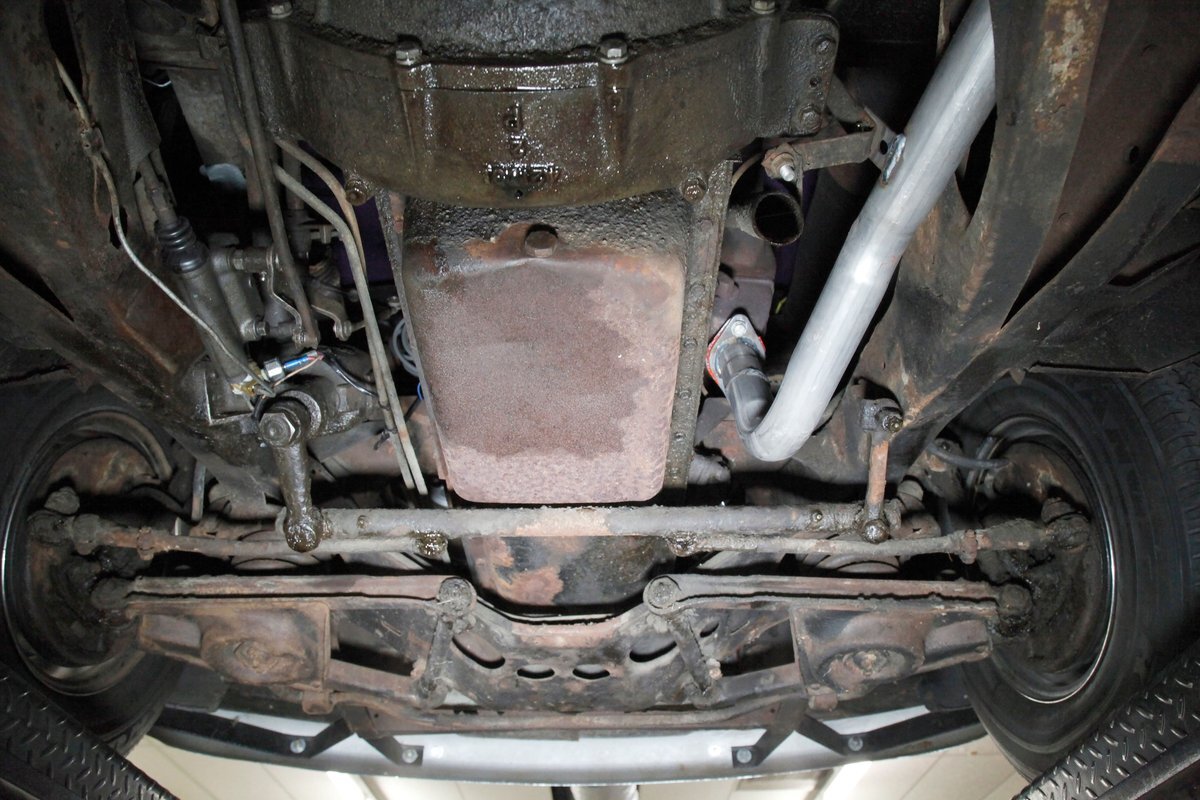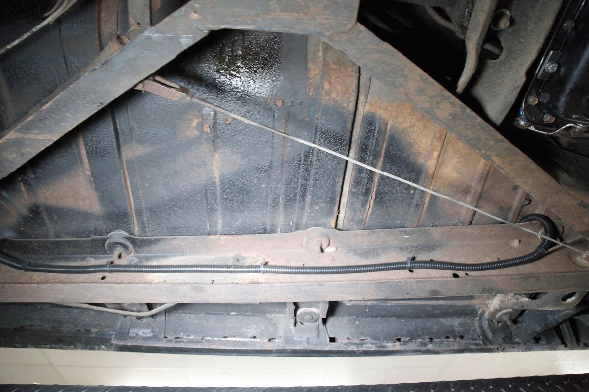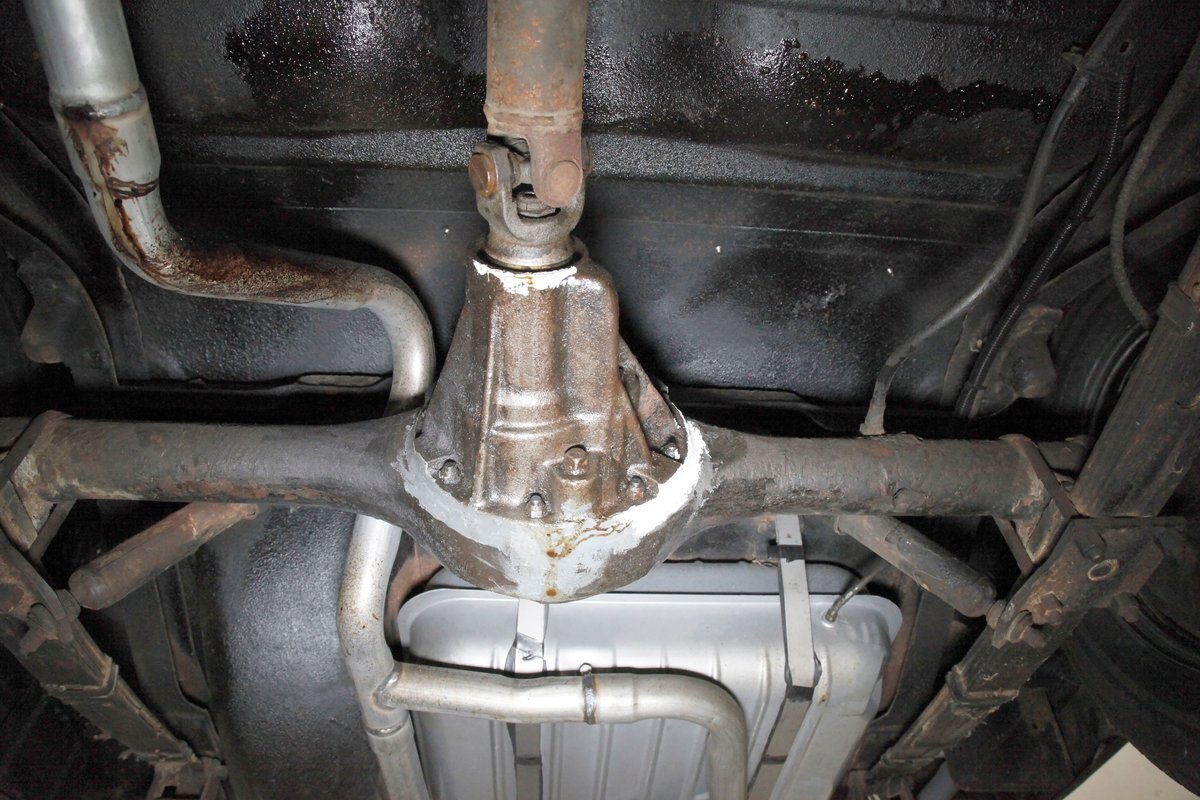With some faded black but totally rust free surfaces the X frame undercarriage is looking just great and solid save for invasive rust appearing on the inner rockers and trunk drop offs. Independent coil springs for the front and leaf springs for the rear suspension and drum brakes all around are seen. Single exhaust with a glasspack muffler is in charge of the exhale.