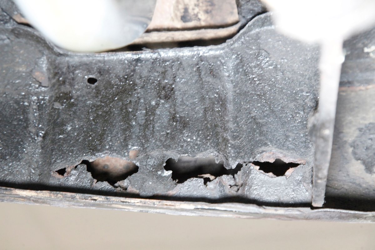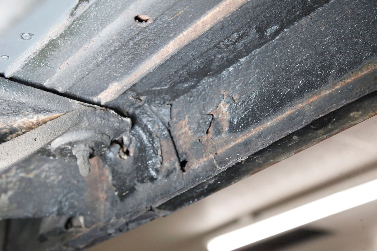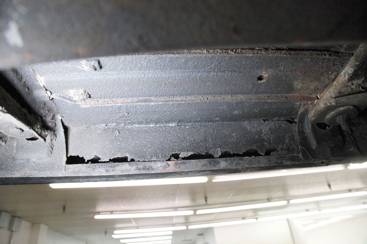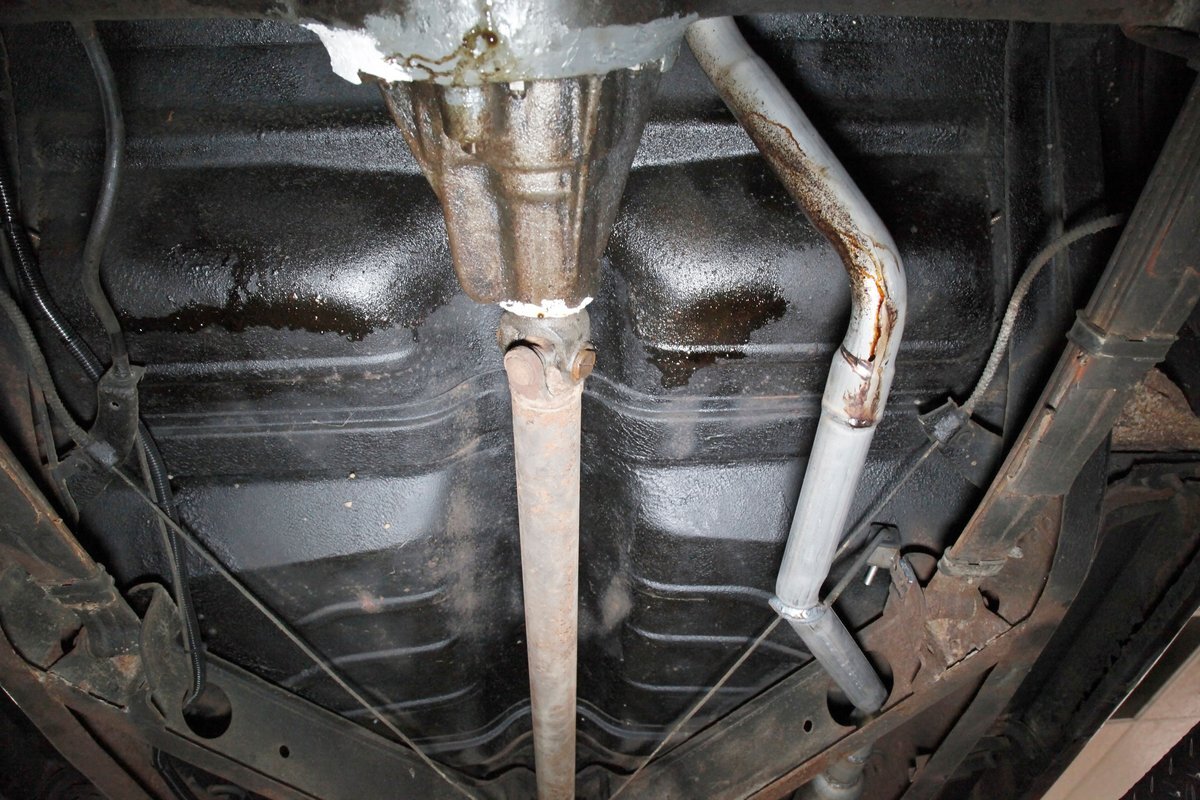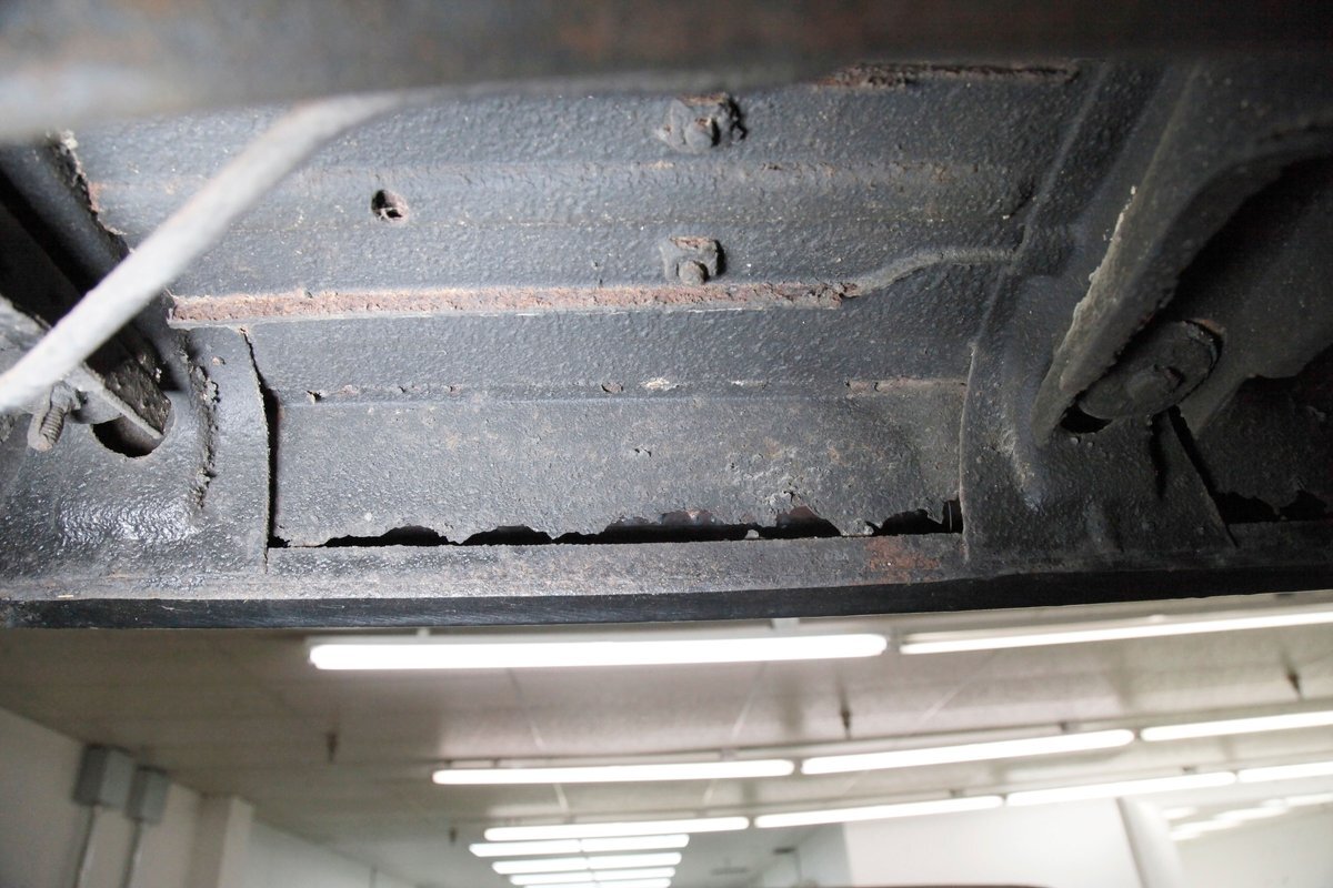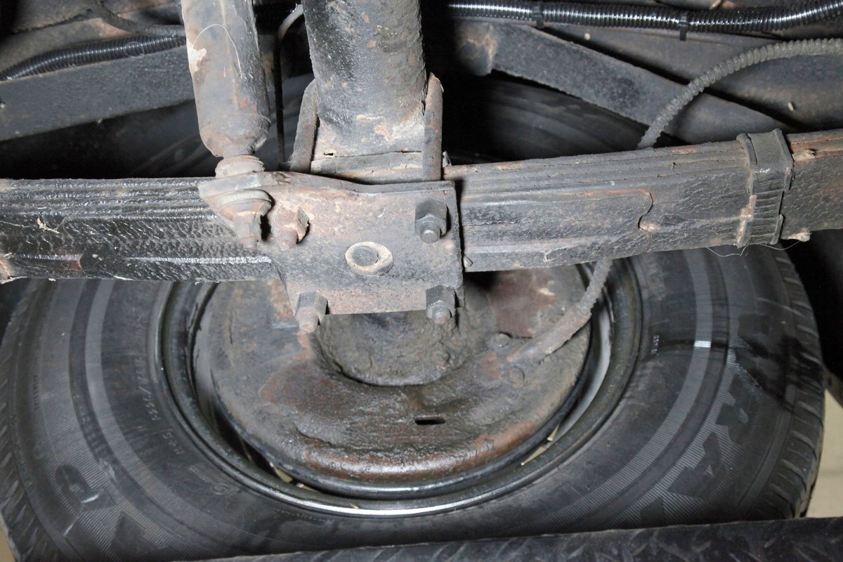 With some faded black but totally rust free surfaces the X frame undercarriage is looking just great and solid save for invasive rust appearing on the inner rockers and trunk drop offs. Independent coil springs for the front and leaf springs for the rear suspension and drum brakes all around are seen. Single exhaust with a glasspack muffler is in charge of the exhale.