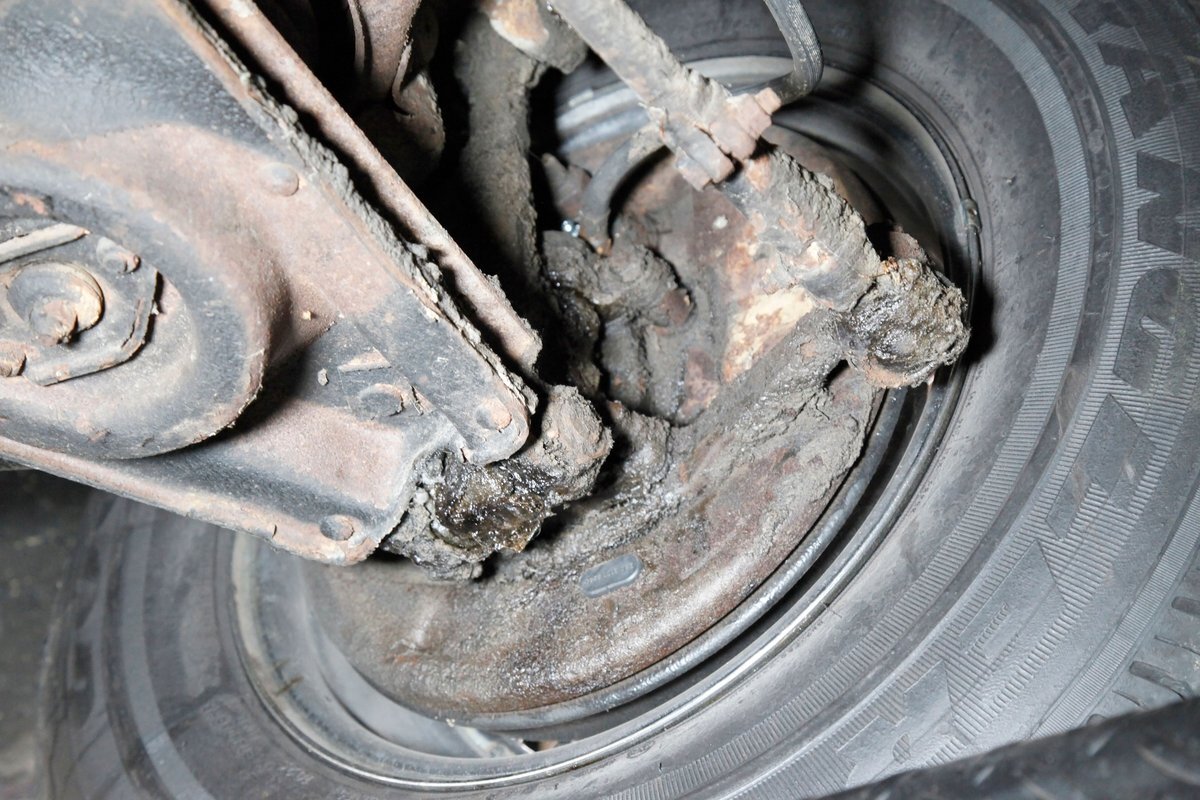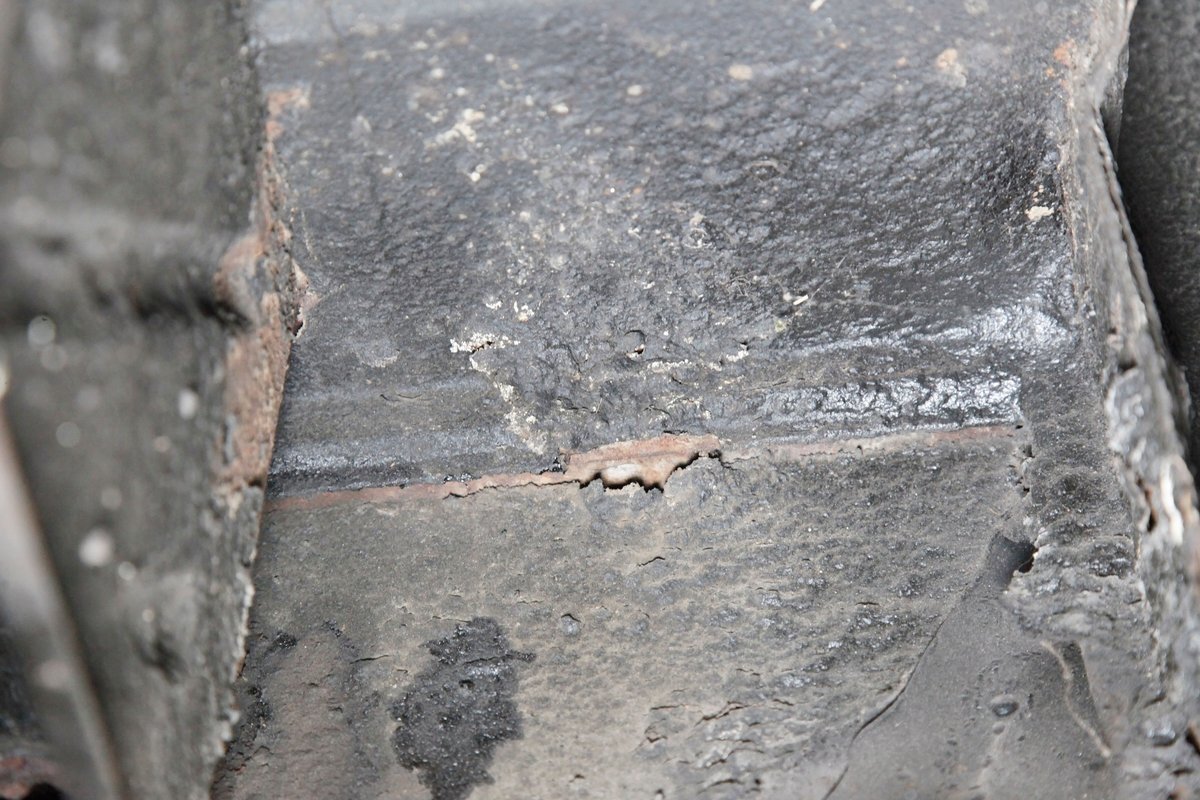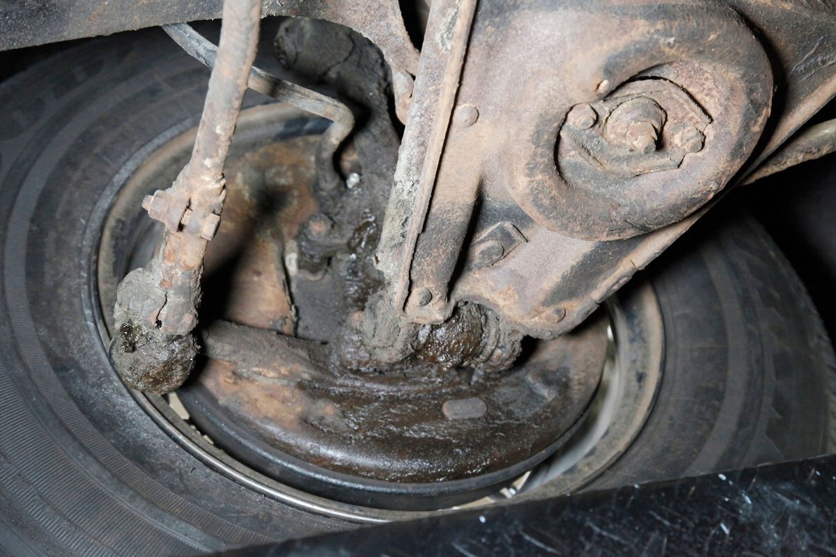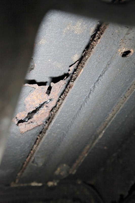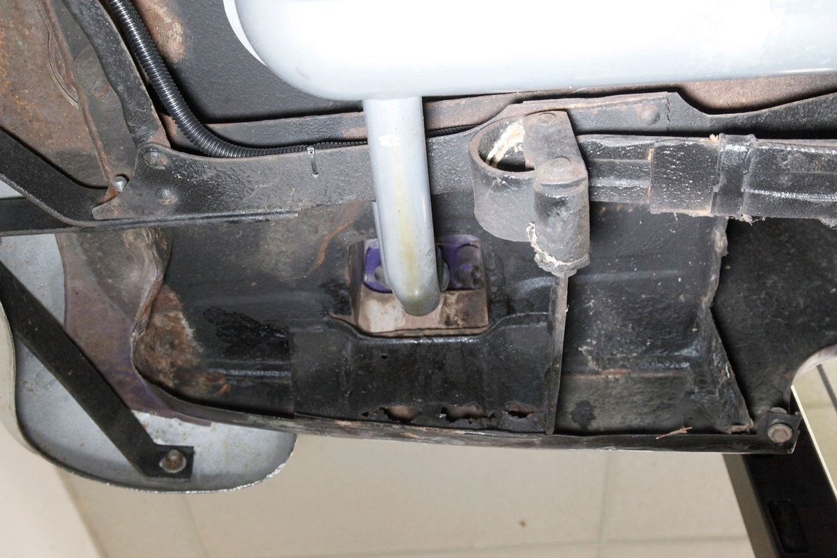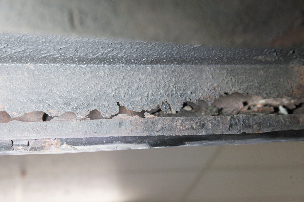 With some faded black but totally rust free surfaces the X frame undercarriage is looking just great and solid save for invasive rust appearing on the inner rockers and trunk drop offs. Independent coil springs for the front and leaf springs for the rear suspension and drum brakes all around are seen. Single exhaust with a glasspack muffler is in charge of the exhale.