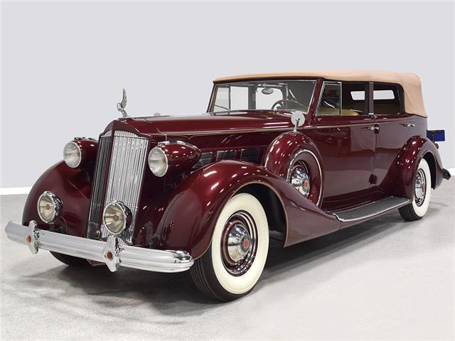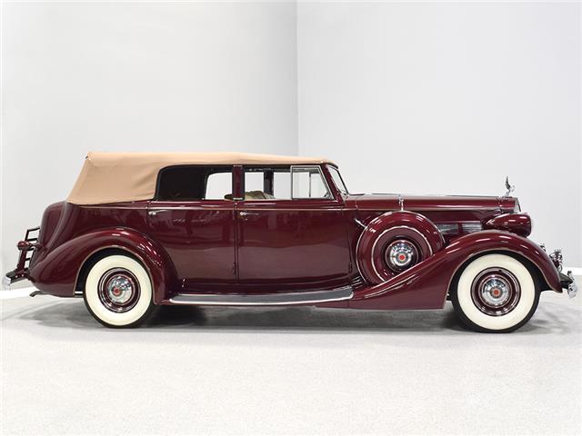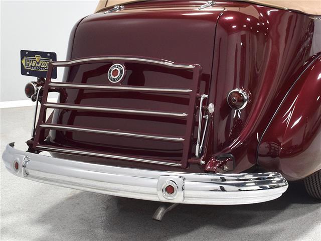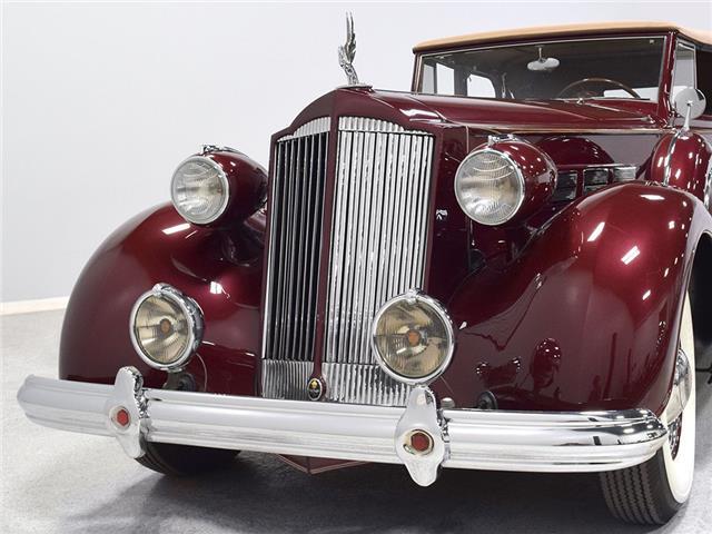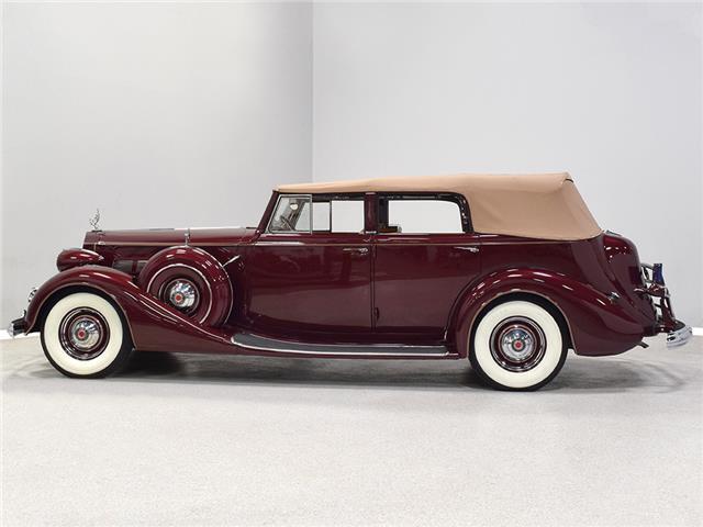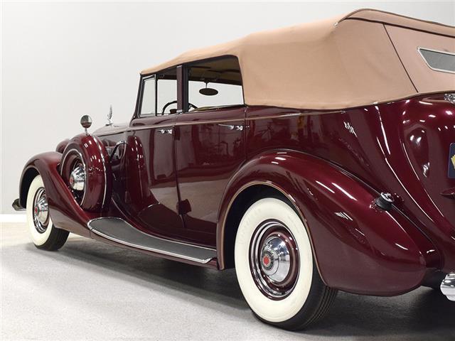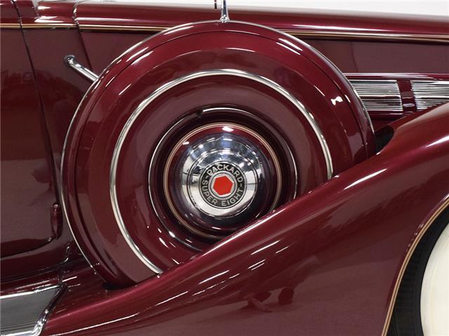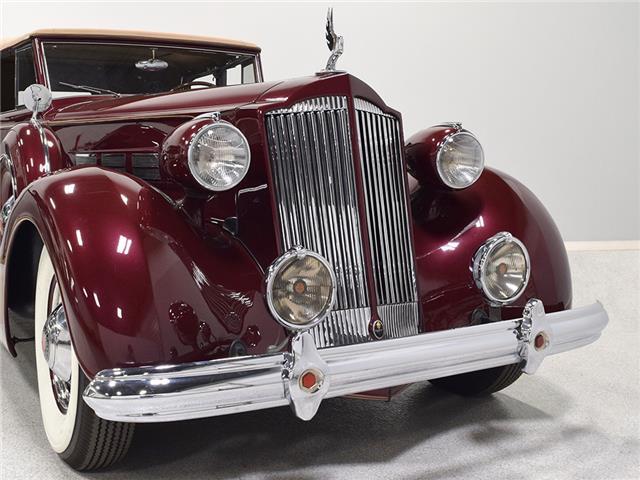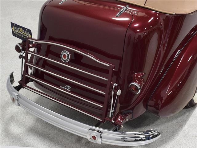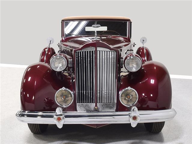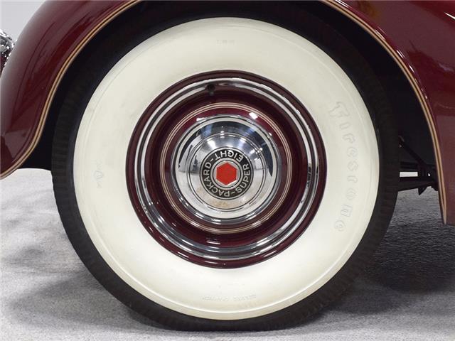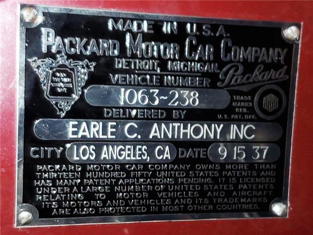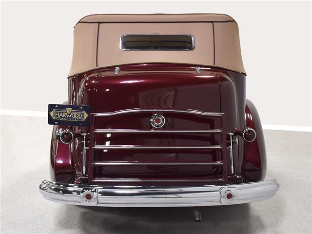 According to records that accompany the car, this beautiful 1937 Packard 1502 convertible sedan has a fascinating history behind it. Originally sold through the legendary Earle C. Anthony distributorship in Los Angeles (yes, the data plate is a reproduction, but this car also carries an original Earle C. Anthony maintenance tag on the firewall), it is rumored that this car has spent time in India and Italy before being repatriated in the early 2000s. In 2007 the car was stripped to bare metal with panel alignment by Clayton Restorations and fresh Pomeranian Red paint was applied by Cedar Hawks. A new leather interior and fresh top were installed by Duncan & Sons Upholstery with the top alone costing about $5000. In 2019, the car was delivered to D&D Classic Auto in Dayton, Ohio where another $132,000 in restoration work was performed, including repainting and striping all six wheels, installing six new Firestone whitewall tires, correctly fitting the metal sidemount covers, and detailing the engine with correct Packard olive green paint. Additional work included refinishing much of the chrome, rebuilding the clock, rebuilding the carburetor, re-coring the radiator, re-casting the steering wheel, rebuilding the power brake booster, and much more. The goal was a roadworthy tour car that could show well in club events and in that regard, they succeeded. The car is just gorgeous in person!