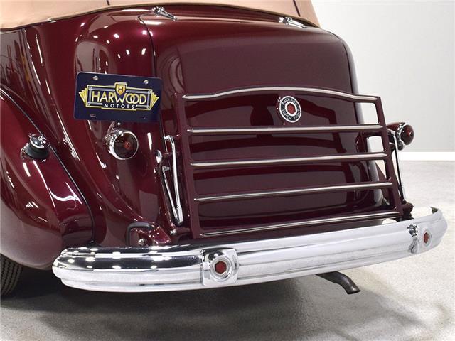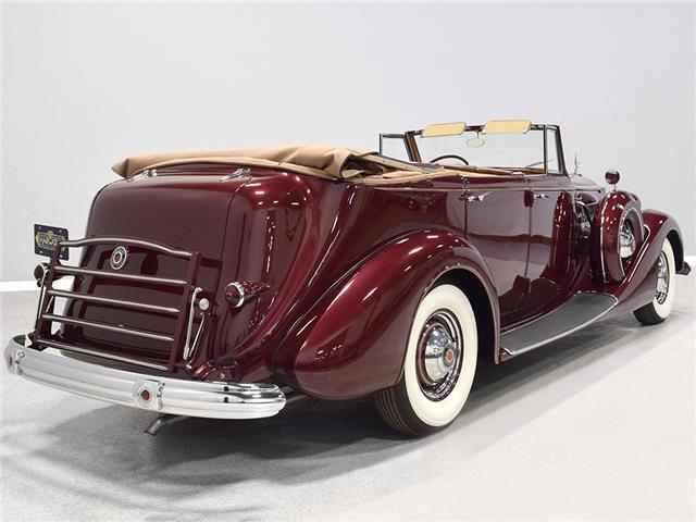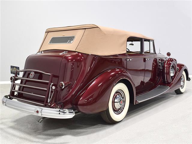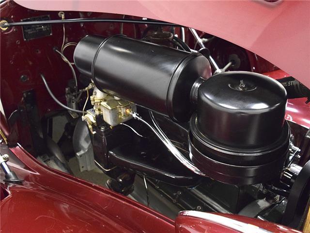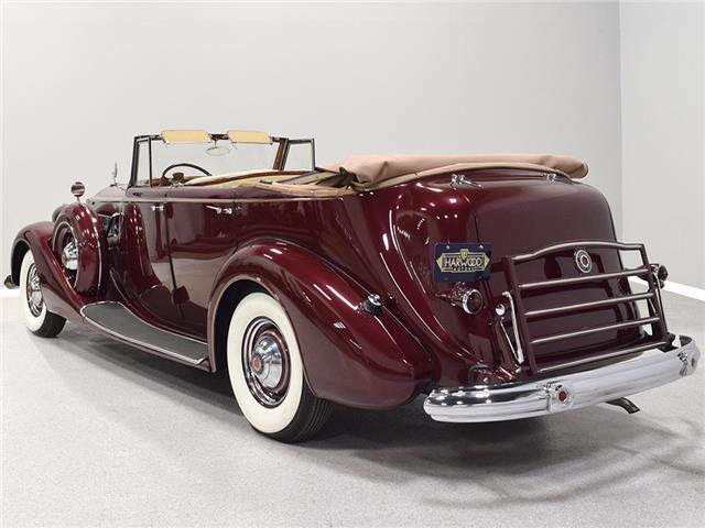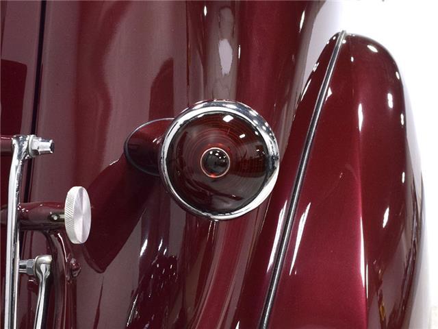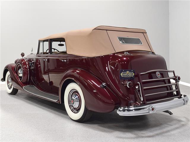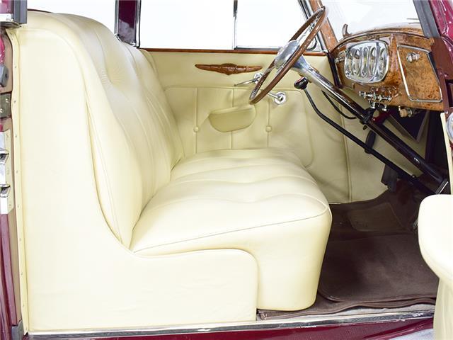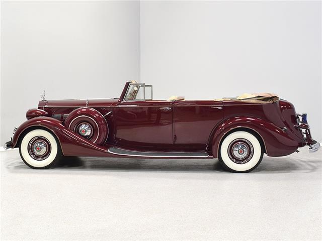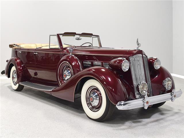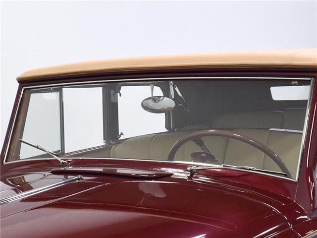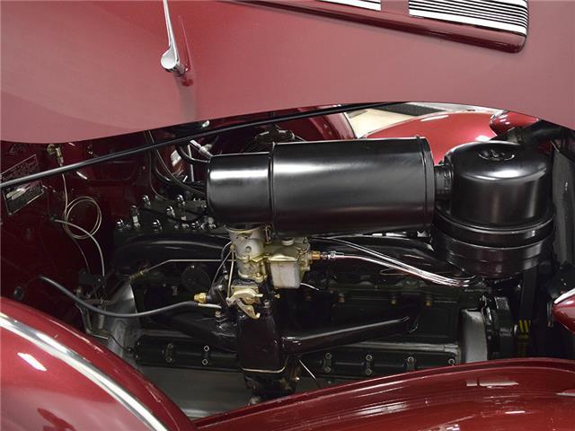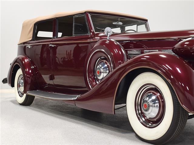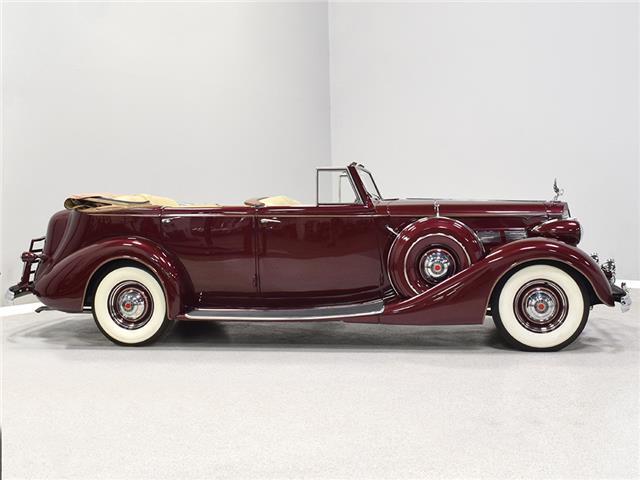 According to records that accompany the car, this beautiful 1937 Packard 1502 convertible sedan has a fascinating history behind it. Originally sold through the legendary Earle C. Anthony distributorship in Los Angeles (yes, the data plate is a reproduction, but this car also carries an original Earle C. Anthony maintenance tag on the firewall), it is rumored that this car has spent time in India and Italy before being repatriated in the early 2000s. In 2007 the car was stripped to bare metal with panel alignment by Clayton Restorations and fresh Pomeranian Red paint was applied by Cedar Hawks. A new leather interior and fresh top were installed by Duncan & Sons Upholstery with the top alone costing about $5000. In 2019, the car was delivered to D&D Classic Auto in Dayton, Ohio where another $132,000 in restoration work was performed, including repainting and striping all six wheels, installing six new Firestone whitewall tires, correctly fitting the metal sidemount covers, and detailing the engine with correct Packard olive green paint. Additional work included refinishing much of the chrome, rebuilding the clock, rebuilding the carburetor, re-coring the radiator, re-casting the steering wheel, rebuilding the power brake booster, and much more. The goal was a roadworthy tour car that could show well in club events and in that regard, they succeeded. The car is just gorgeous in person!