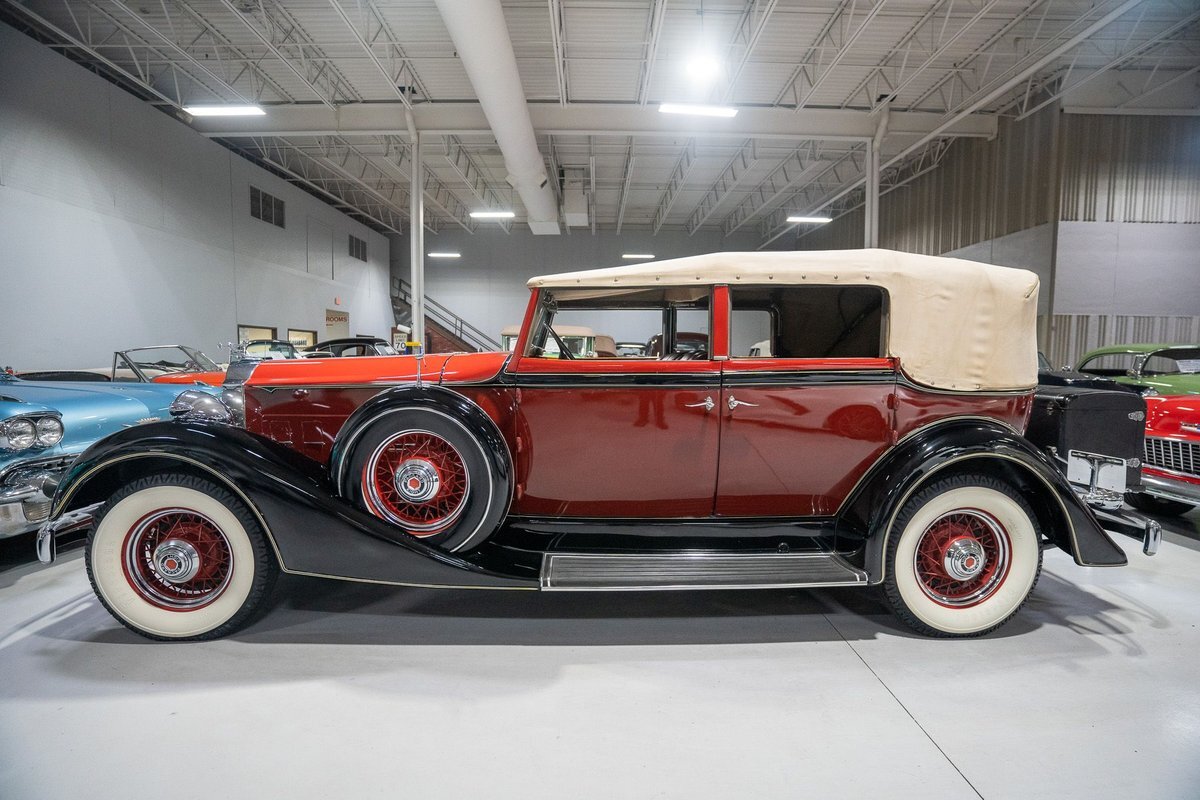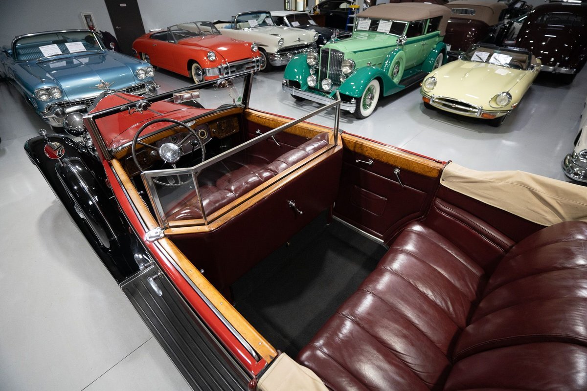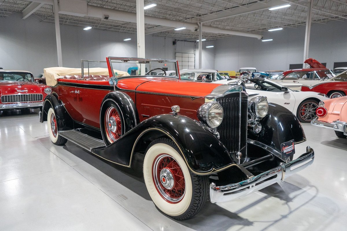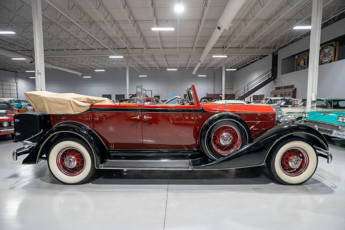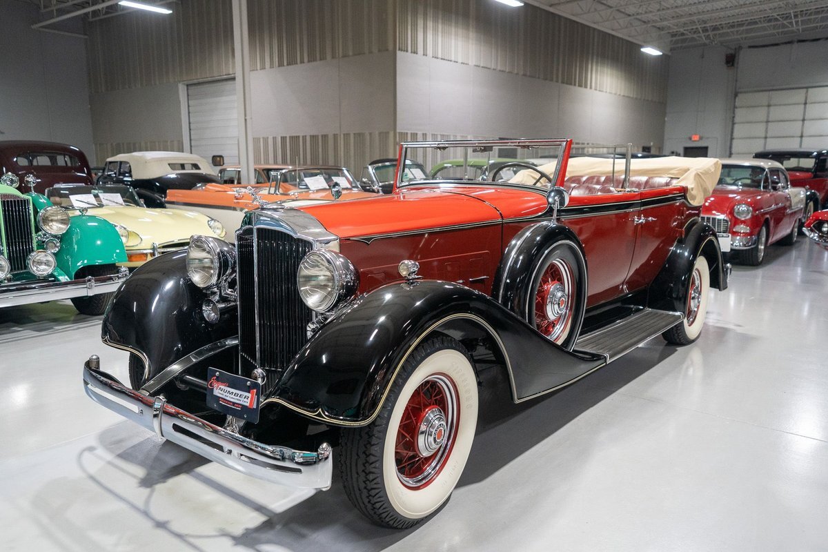This 1934 Packard Eight Convertible Sedan is the beneficiary of an older restoration and is ready to be driven all summer long! When the first Packard was completed on November 6, 1899, the goal was to create a better automobile than a Winton motor carriage. Just a few short years later, the Packard Motor Company's slogan became "Ask the man who owns one" which would become the company famous tagline in the decades that followed. As the years went on, Packard became synonymous with luxury and quality, and the company cemented itself atop America's automotive hierarchy, alongside the likes of Cadillac, Marmon, Stutz, Auburn-Cord-Duesenberg, Peerless, and Pierce-Arrow. When the stock market crashed in the fall of 1929, the demand for luxury cars crashed too putting Peerless and Marmon out of business, Stutz, Pierce-Arrow, and Auburn-Cord-Duesenberg on the brink of failure, and immense financial pressure on those who survived, including Packard. By 1933, the market began to recover and Packard turned its first profit since the start of the Great Depression. Due to its success in '33, Packard's leadership predicted, albeit incorrectly, that the worst was behind them and the company released 55 different body styles in its 11th Series cars for the 1934 model year. Ultimately, the Packard Motor Company's sales and production figures fell in 1934 to lows not seen since the early Twenties. Nonetheless, the 1934 Packards are widely considered some of the most elegantly designed cars ever produced by the independent American automaker and therefore have been highly collectible for decades. In fact, the Classic Car Club of America considers the 1934 Packard Eight as a "True Classic" and they can participate in CCCA events. Design changes in 1934 included longer fenders, redesigned slotted bumpers, and a relocated gas filler cap located behind left rear taillight assembly. Additionally, the tilt windshield from 1933 was replaced with a fixed windshield with an angled vent wing in 1934. In total, only 5,120 Packard Eights were produced in 1934 which makes this Convertible Sedan an especially rare automobile. This particular 1934 Packard Eight comes to us from a prominent Texas collector who owned this car and oversaw its restoration a number of years ago. Under the hood on this '34 Packard Convertible is the famous Packard 320 Cubic Inch L-Head Inline 8 cylinder engine paired with a Stromberg single 2 barrel carburetor that was said to have created 145 horsepower when new. The 320 Straight 8 is backed by a 3 speed manual transmission that is shifted using a floor mounted shifter. This 1934 Packard Convertible rides on a set of wide whitewall bias-ply tires on wire wheels with Packard Eight cloisonne hubcaps that give this True Classic a truly iconic look. Braking is provided by vacuum-assisted mechanical brakes in all four corners which was quite the novelty back in 1934. A pair of side-mounted spare tires are tucked beneath decorative sidemount covers with side-view mirrors which was one of the few options available on the 11th Series Packards. Sitting atop the rear mounted luggage rack is a period-correct trunk so that you can travel with all of your belongings in style. The manually operated beige cloth convertible top is in wonderful condition and is tucked under a matching boot cover when down. All four crank up windows, and the crank up glass divider window, are in excellent condition and work great. The body on this 1934 Packard Convertible Sedan has been refinished in a beautiful period correct tri-tone paint scheme consisting of Ascot Maroon with a Black beltline with Tan accent striping and the fenders were refinished in Black with matching Tan striping. The interior on this 1934 Packard Eight Convertible is gorgeous! The front and rear bench seats have been reupholstered in Burgundy tufted leather that gives this Convertible Sedan a truly luxurious look and feel. The matching burgundy door panels with burl woodgrain accents, woodgrain dash, and steering wheel are all in wonderful shape as well and appear to be in their stock configuration. The dash is equipped with a 120 MPH speedometer, oil pressure gauge, temperature gauge, amperes gauge, gasoline gauge, clock, cigar lighter, and controls for the sensitivity control on the vacuum-assisted brake system. Whether you're buying your first CCCA True Classic or you're adding to your existing collection, this 1934 Packard Eight Convertible Sedan would make an excellent choice. Give us a call today at763-428-7337!