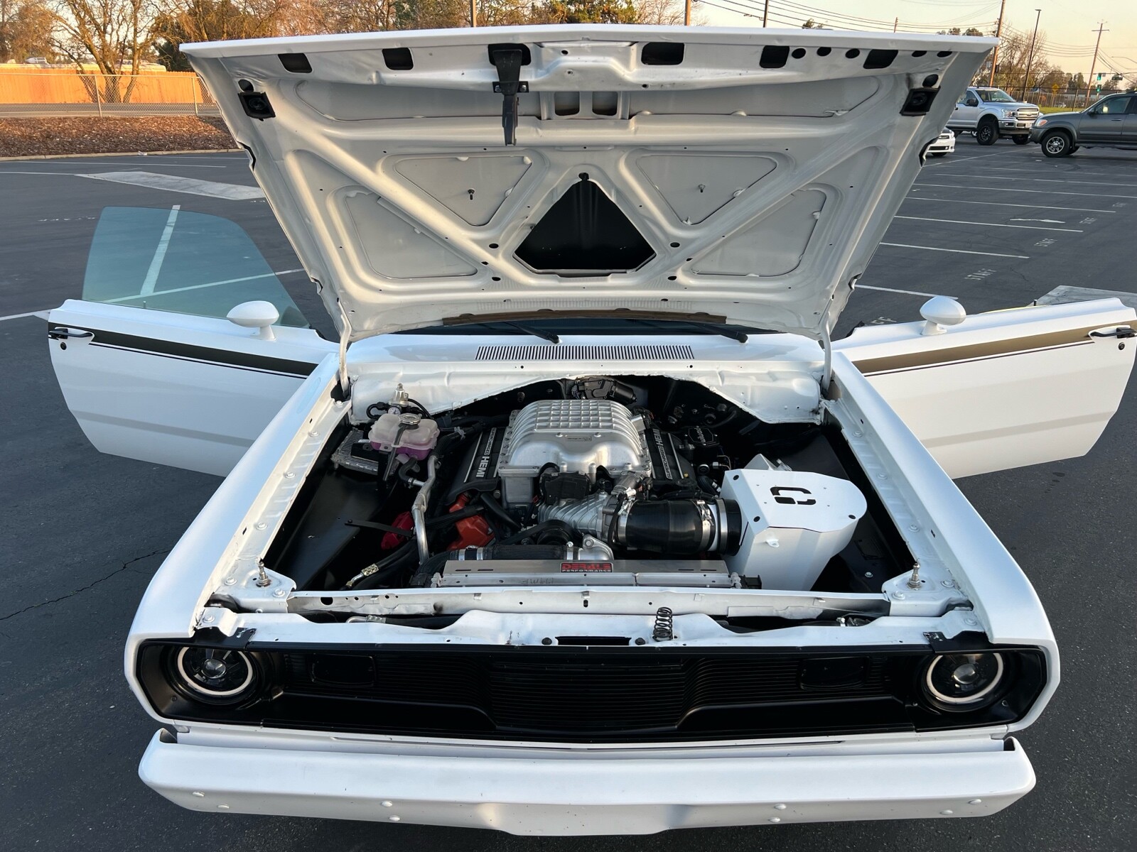 Hi I have a 1972 HellCat Supercharged Plymouth Duster with 717hp. It has a 8 speed automatic transmission. This thing drives awesome. It’s been fully restored and up graded in every way.
