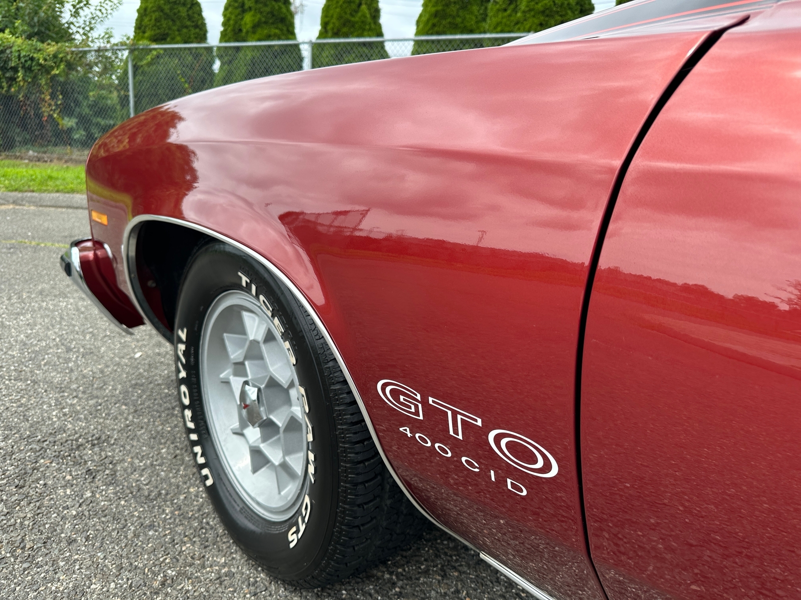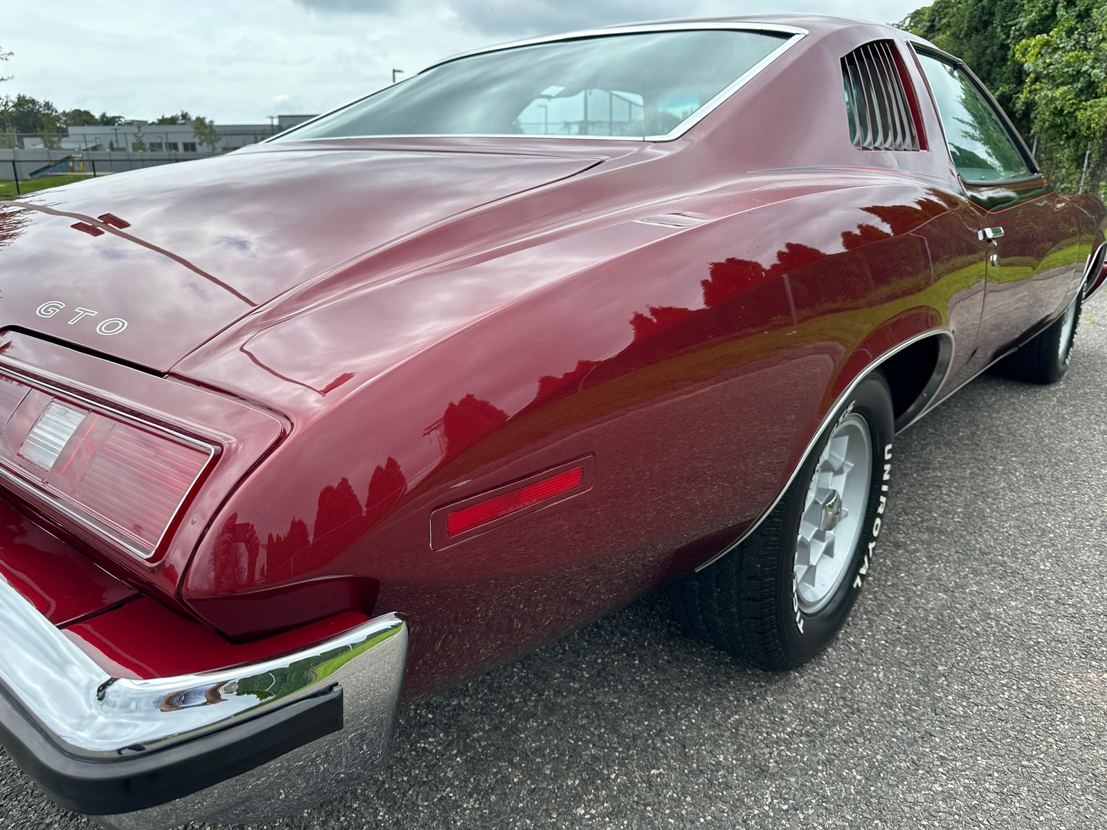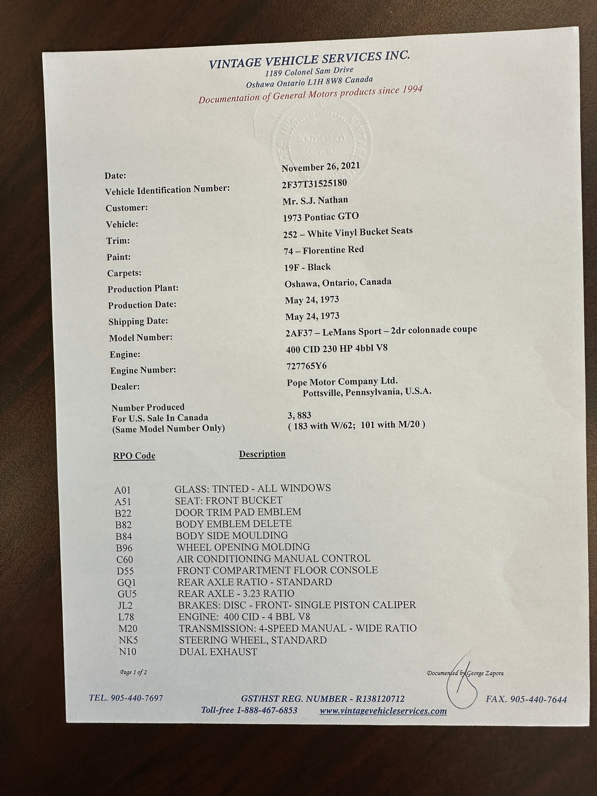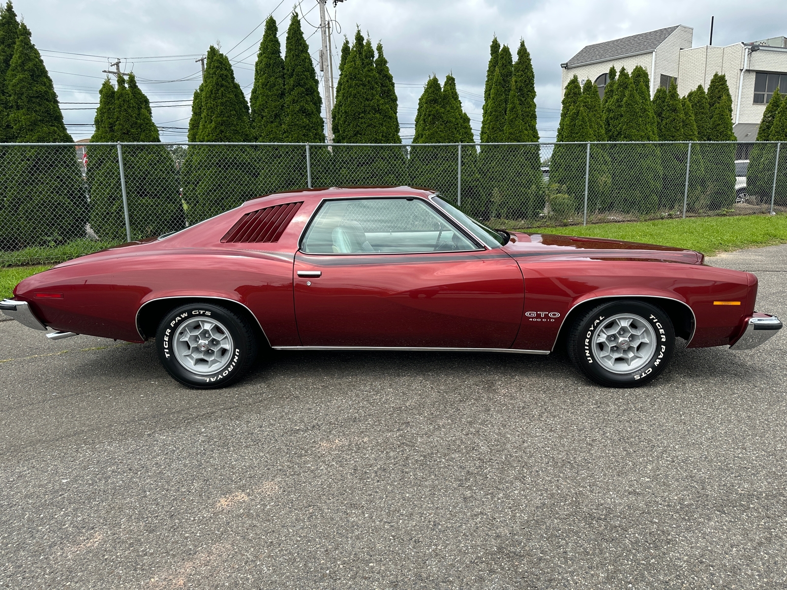1973 PONTIAC GTO SPORT COUPE 400CI 4BBL V8 4/SPEEDFACTORY A/C RARE ONLY 101 PRODUCED YEAR: 1973 MAKE: PONTIAC MODEL: GTO BODY: SPORT COUPE COLOR: FLORENTINE RED TRIM: WHITE ENGINE: 400 CI 4BBL V8 TRANS: 4/SPEED REAR: 10 BOLT   1 MILES: 44,055 (ACTUAL) EXEMPT ON TITLE SERIAL#: 2F37T31525180 FACTORY OPTIONS *TINTED GLASS *AIR CONDITIONING *FRONT CONSOLE *FRONT DISC BRAKES *400CID 4BBL V8 *WIDE RATIO 4/SPEED *POWER STEERING *AM-FM RADIO *GTO PERFORMANCE PACKAGE *LEMANS SPORT OPTION *BUCKET SEATS *ADDED 15'' HONEYCOMB WHEELS AND TIGER PAW GT W/L TIRES. SERIAL NUMBER BREAKDOWN 2-PONTIAC F37-LEMANS SPORT PKG T-4OO V8 3-1973 1-CANADA PLANT 525180- SEQ#-525180 COWL TAG 5D-BUILT 4TH WEEK OF MAY73-2AF37-73 LEMANS SPORT CPE OS323049-CANADA PLANT #TR-252- WHITE 74-74- FLORENTINE RED DOCUMENTATION *PHS DOCUMENTATION*DEALER INVOICE*OWNERS MANUAL*WARRANTY BOOK*ORIGINAL SALES BROCHURE*ORIGINAL BIAS PLY SPARE TIRE*CANADIAN HISTORY SOCIETY RARITY 3883 US SALE IN CANADA 183 WITH GTO OPTION 101 WITH 4/SPEED MATCHING DRIVELINE NUMBERS ENGINE Y6 SER # 25180 400 4BBL V8 TRANS M20 MUNCIE SER# 25180 REAR 10 BOLT 323 TO 1 DATE K114 HISTORY/COMMENTS This original 1973 Pontiac GTO was bought new at Pope Motor Company in Pottsville PA. This GTO is all original other than one quality paint job and new honey comb wheels and tires. The car was in a private collection and was always garaged. The interior is all original but shows yellowing of plastic parts on interior. Thecar runs and performs like new and all features work as they should. The undercarriage is solid with no signs of any rust. If you are a Pontiac collector this is the one. (VERY RARE)