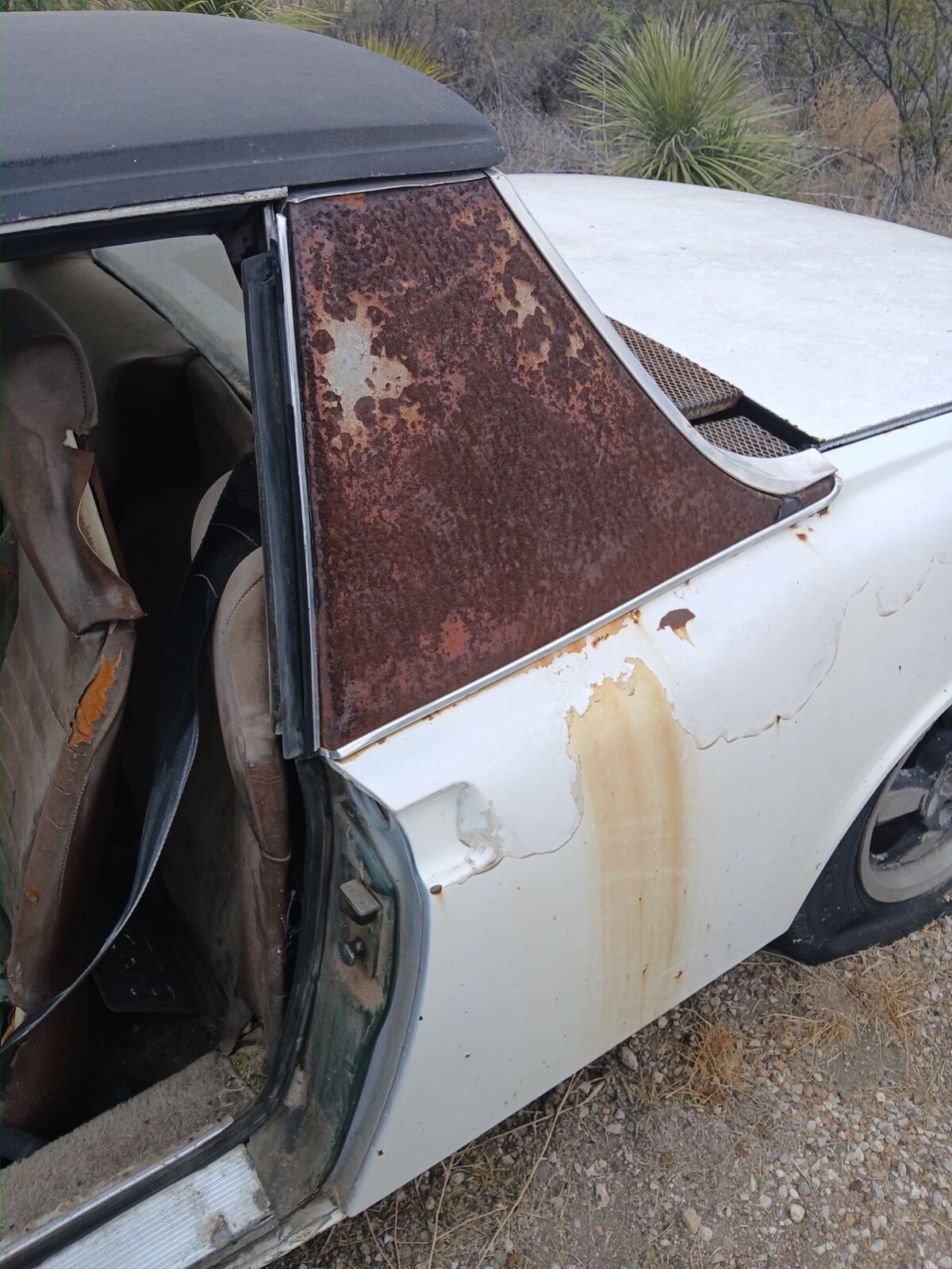 This vehicle is complete except for the removal of the fuel injection. Comes with German duel Weber 44's. Engine ran until parked with low compression. Bottom end of engine sounded solid. Battery box area (hell hole) and opposite side look in good shape. Rusted areas are - passenger side outer and inner rocker panel (main support tube in good shape).There are small holes at lower area of front windshield and small hole by passenger side door handle. The removable top has small hole (dime size). Photos show these areas.