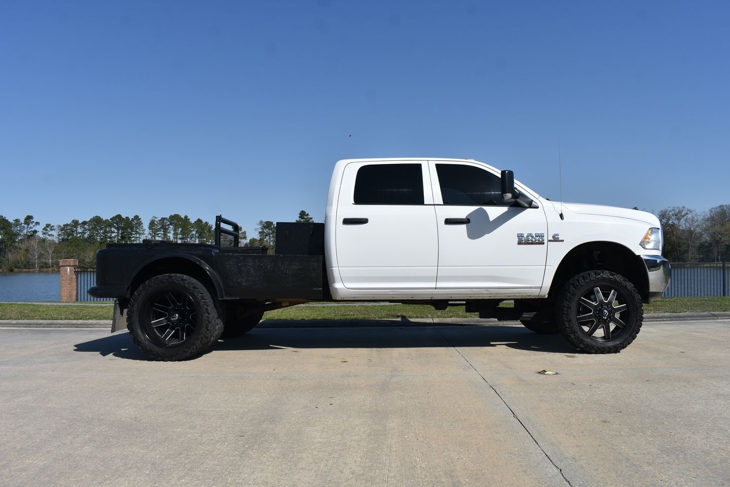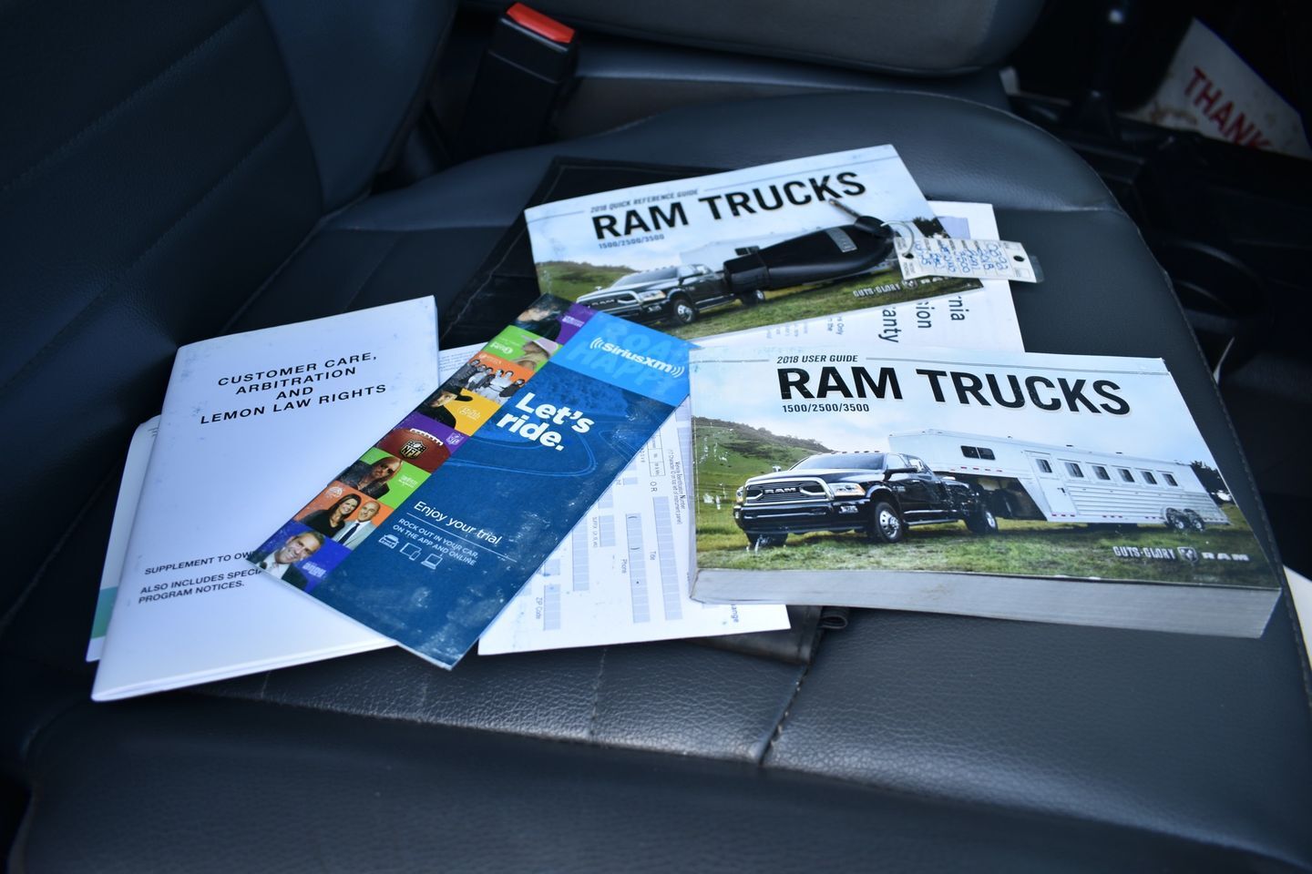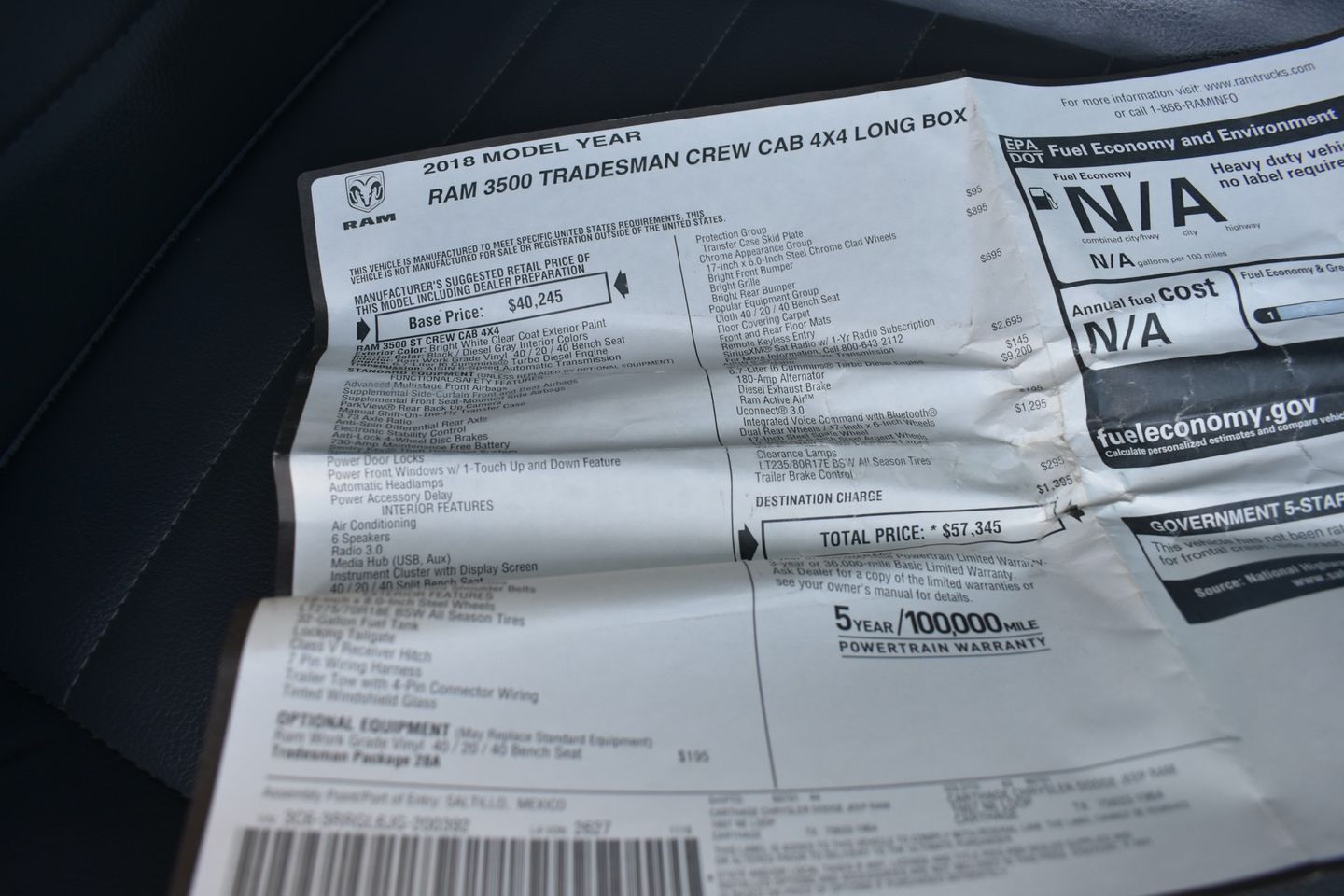You are looking at a 2018 Dodge Ram 3500 Crew Cab 4x4. It is powered with a 6.7L Cummins Diesel I-6 and Aisin automatic transmission. It is equipped with power trailer mirrors, power windows, power locks, tilt, cruise, am/fm radio, and receiver hitch. Also included are the owner's manuals and one keyless remote.
