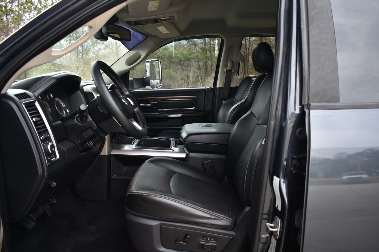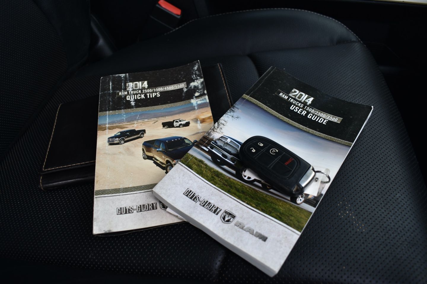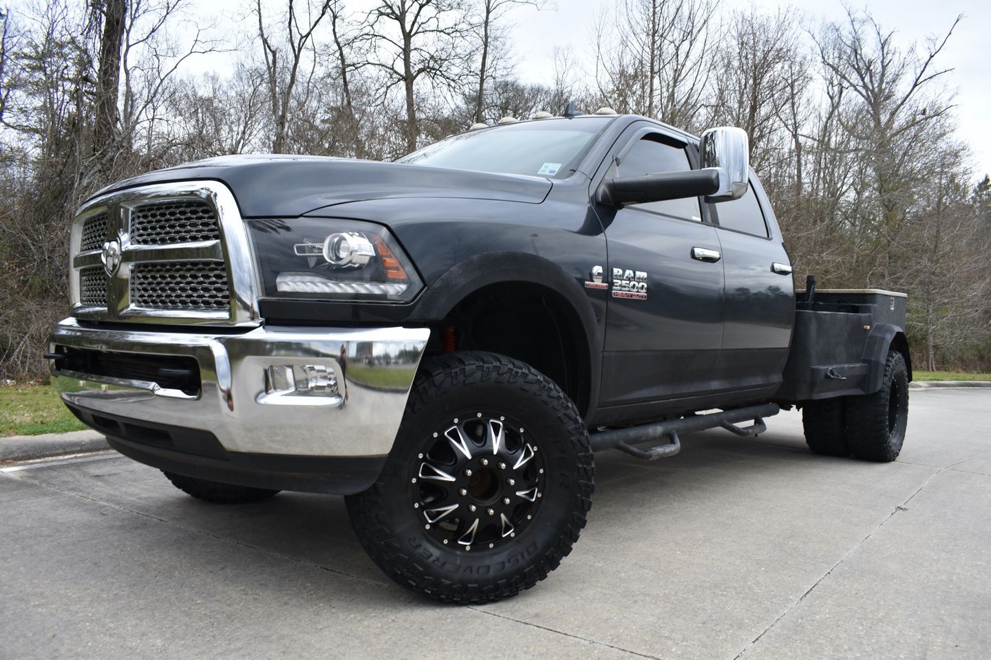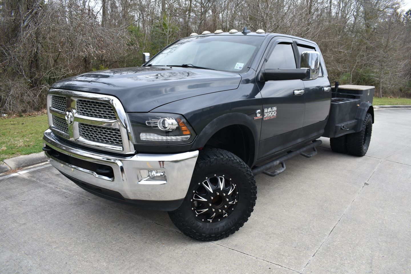 You are looking at a 2014 Dodge Ram 3500 Crew Cab Laramie 4X4. It is powered with a 6.7L Cummins Diesel I-6 and six speed automatic transmission. It is equipped with dual power leather heated/ cooled seats,power trailer mirrors, power windows, power locks, tilt, cruise, receiver hitch, and factory navigation. Also included are the owner's manuals and one keyless remote.