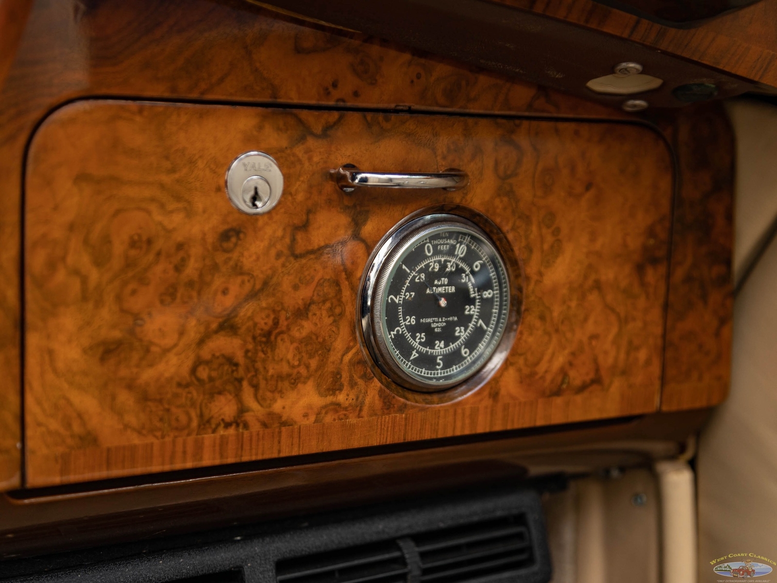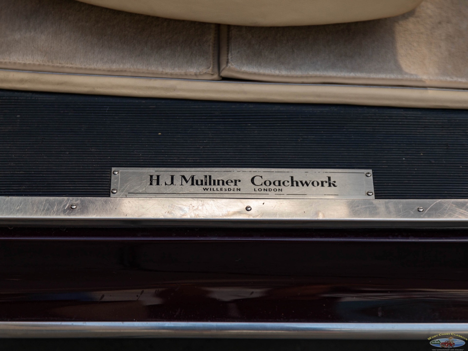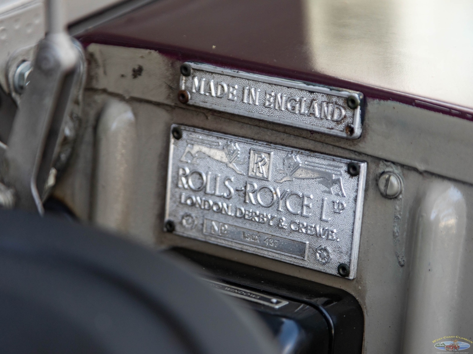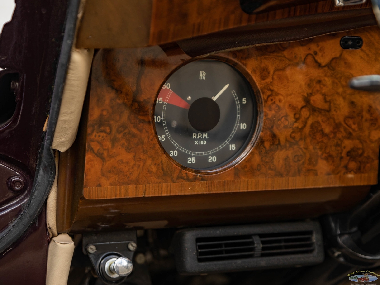 In a striking 'Regal Royal Burgundy' color with all new reupholstered leather interior - 32K original miles & equipped with factory power windows & original air conditioning equipment & rare altimeter & dashboard mounted tachometer by Mulliner to replace the left side cubby box, original AM radio, rear folding picnic tables, white wall tires and rare 'Kneeling Lady' mascot.