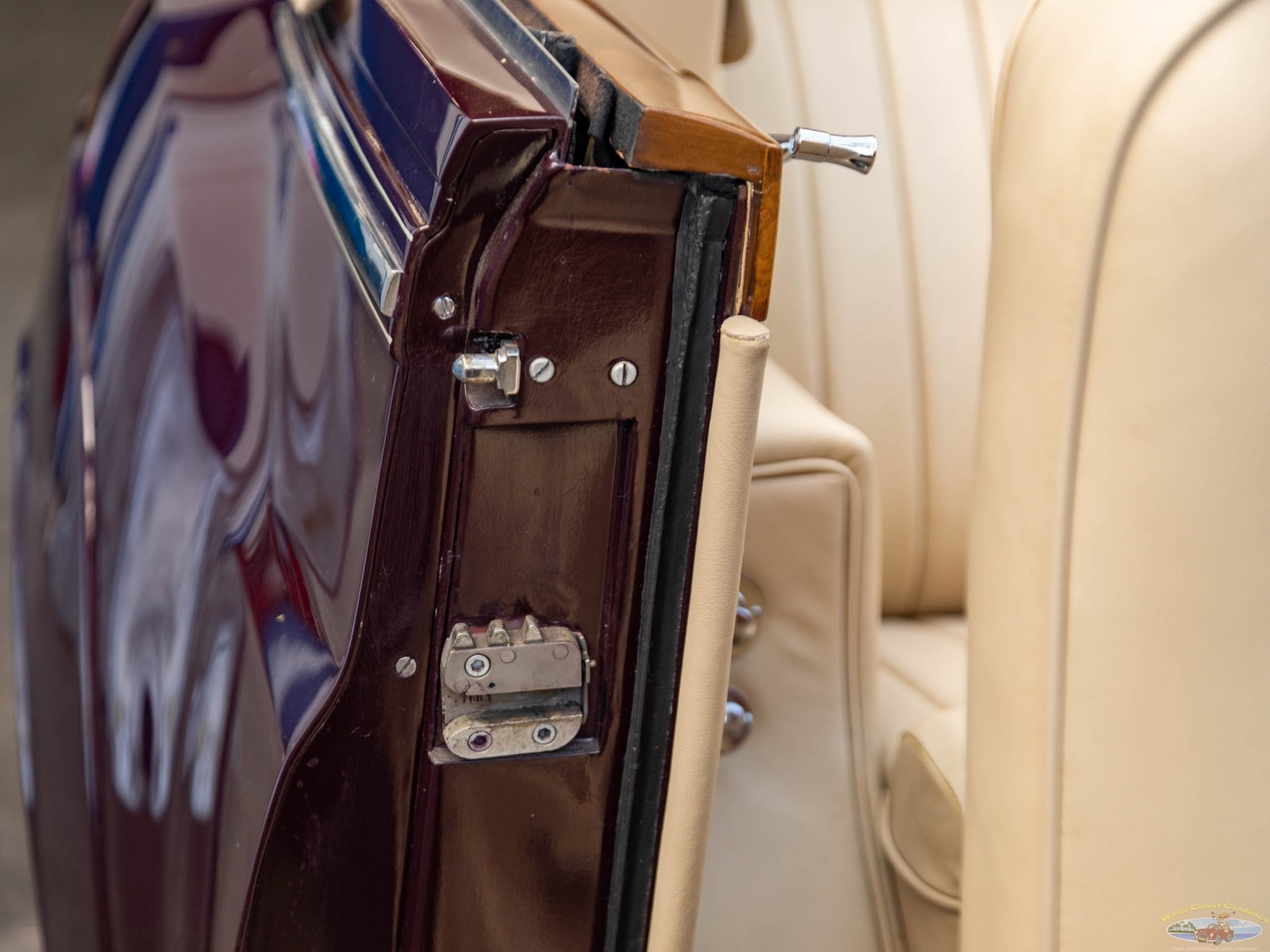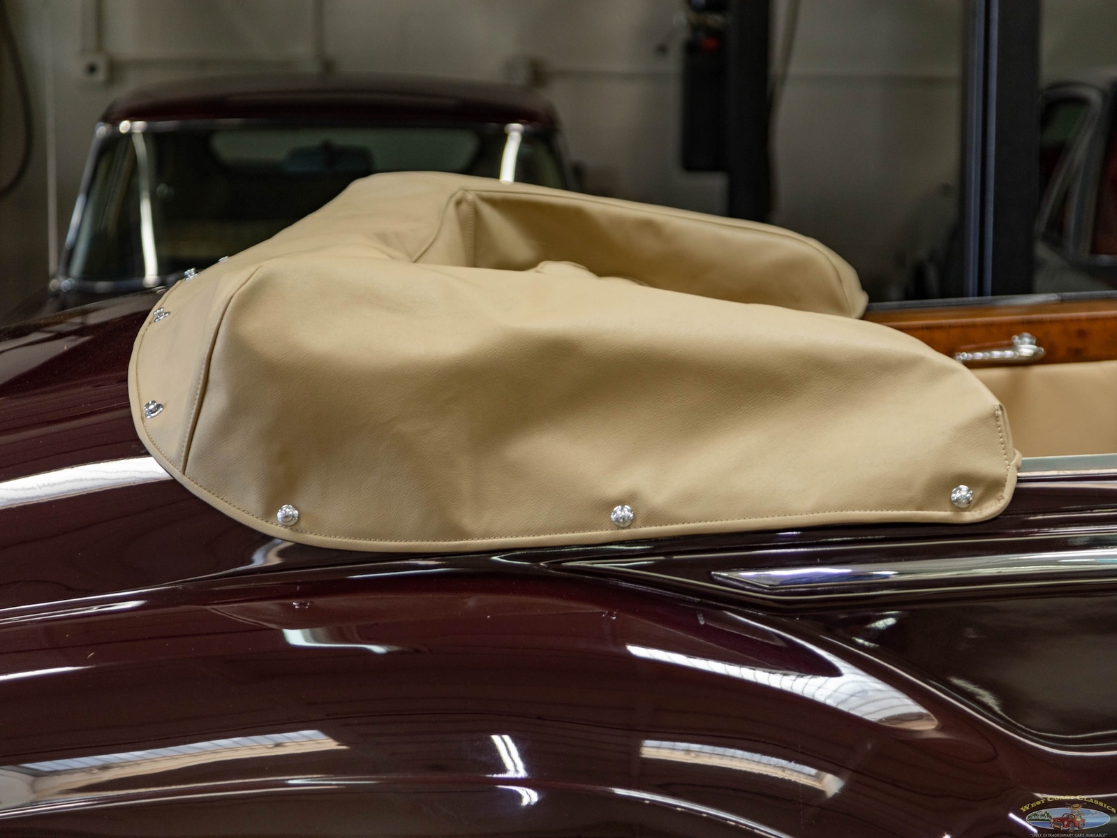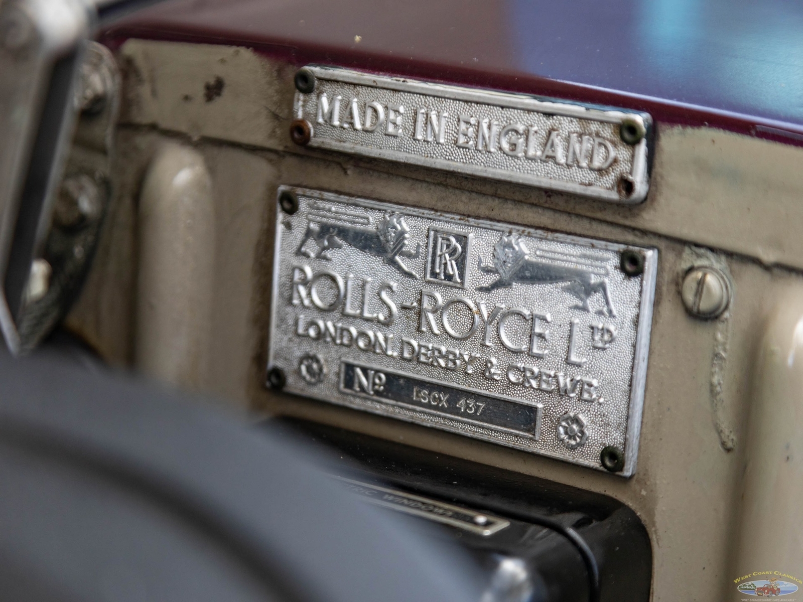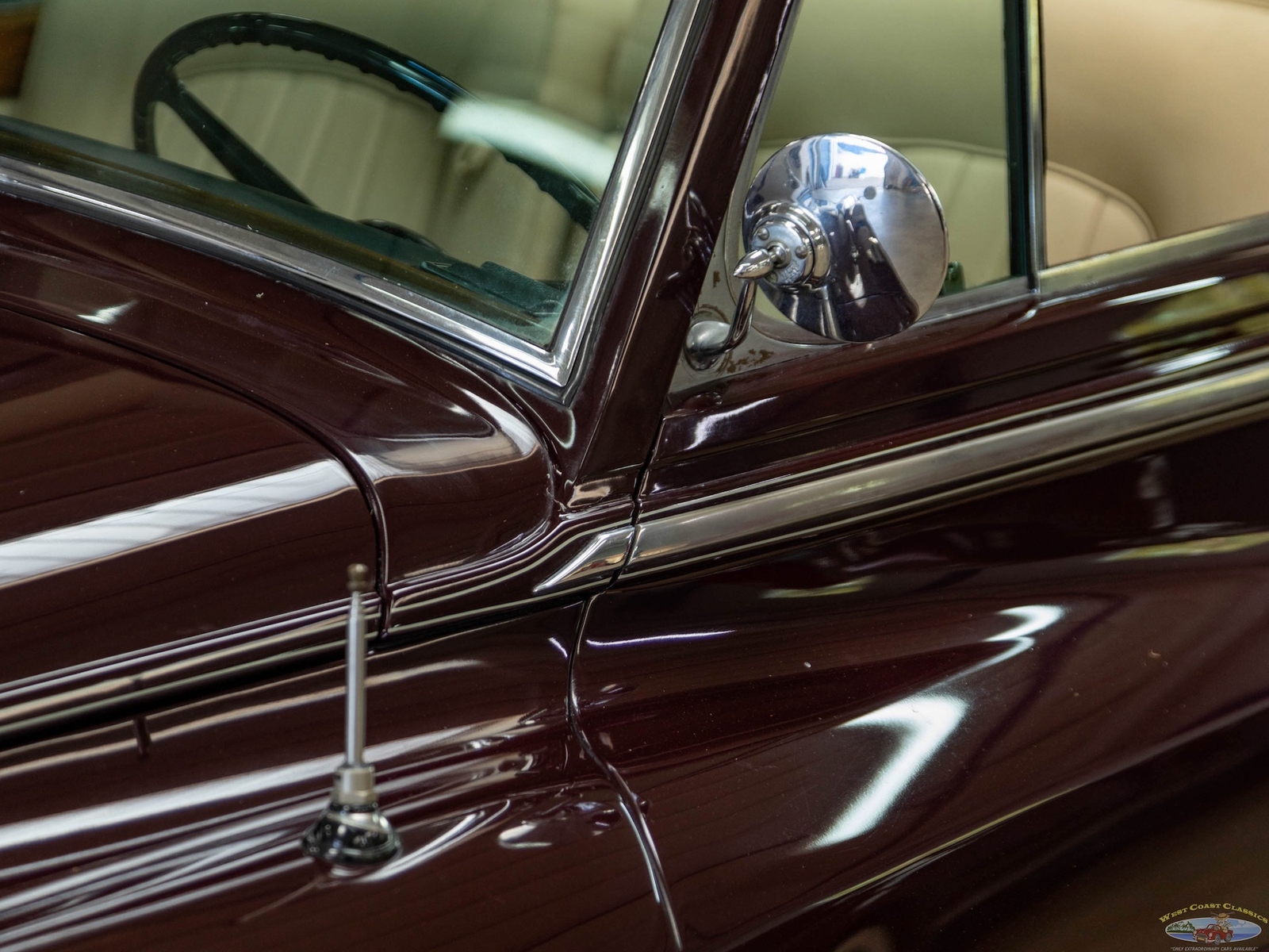 In a striking 'Regal Royal Burgundy' color with all new reupholstered leather interior - 32K original miles & equipped with factory power windows & original air conditioning equipment & rare altimeter & dashboard mounted tachometer by Mulliner to replace the left side cubby box, original AM radio, rear folding picnic tables, white wall tires and rare 'Kneeling Lady' mascot.
