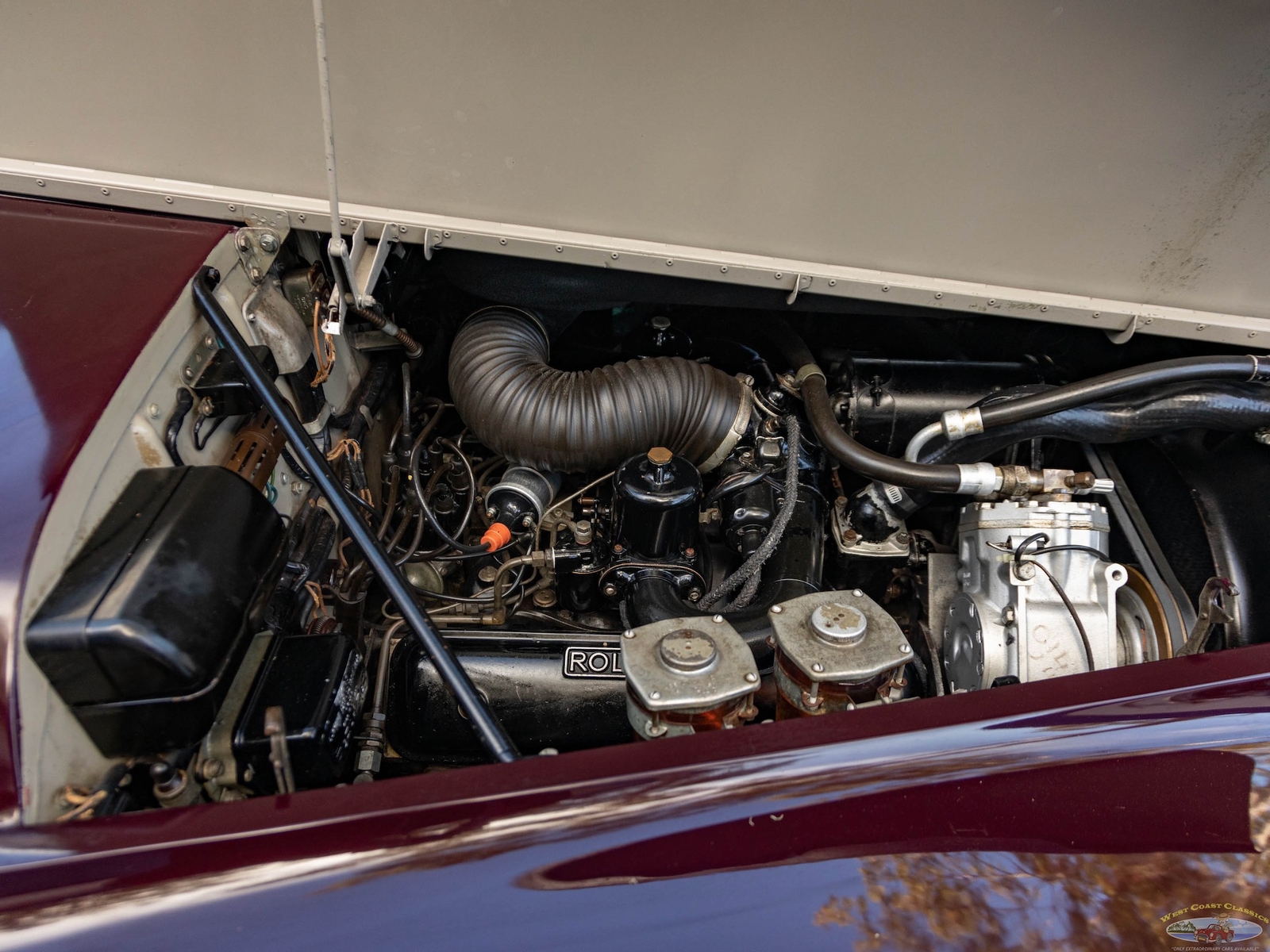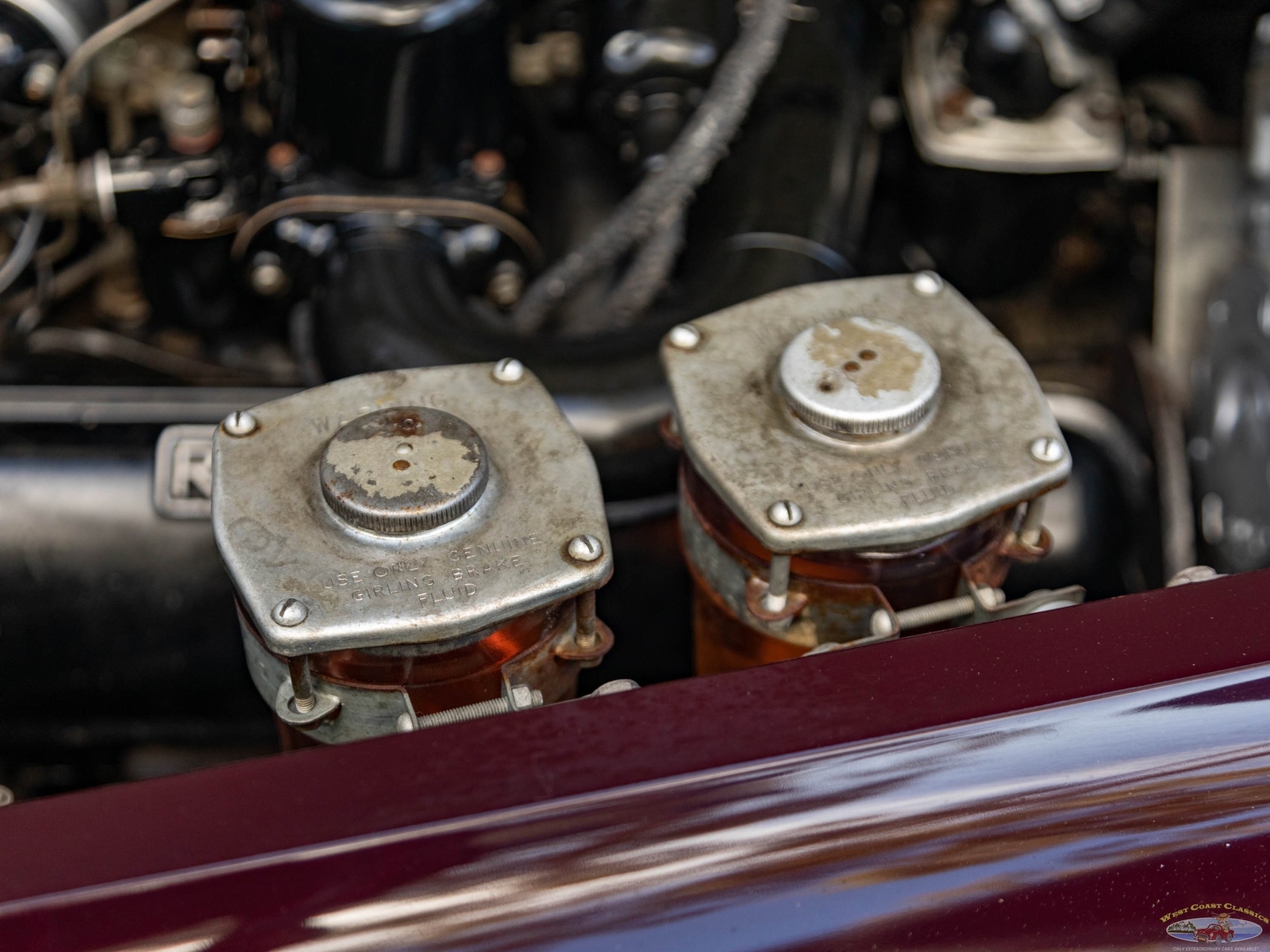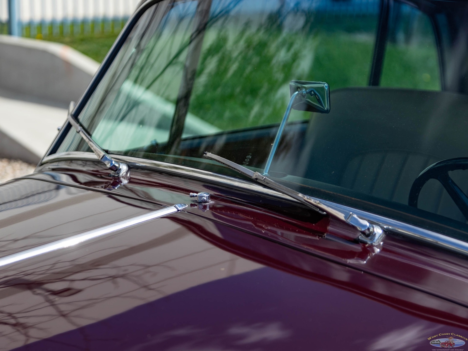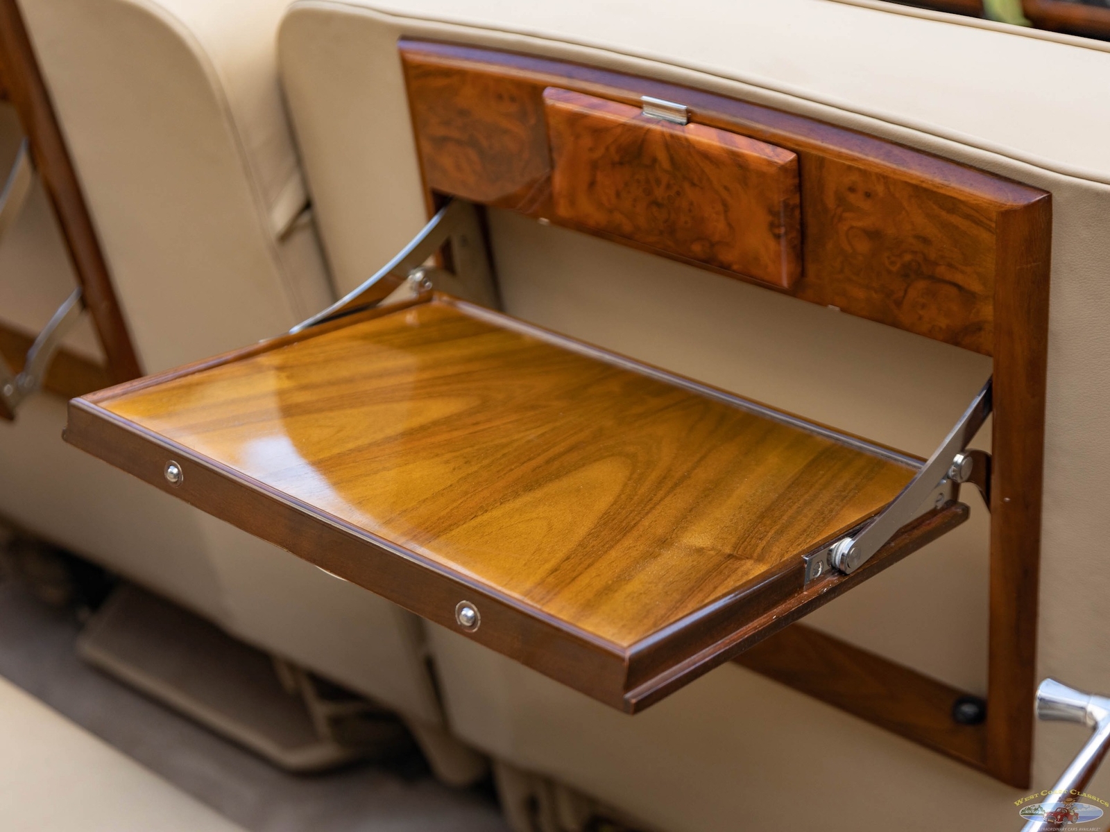 In a striking 'Regal Royal Burgundy' color with all new reupholstered leather interior - 32K original miles & equipped with factory power windows & original air conditioning equipment & rare altimeter & dashboard mounted tachometer by Mulliner to replace the left side cubby box, original AM radio, rear folding picnic tables, white wall tires and rare 'Kneeling Lady' mascot.