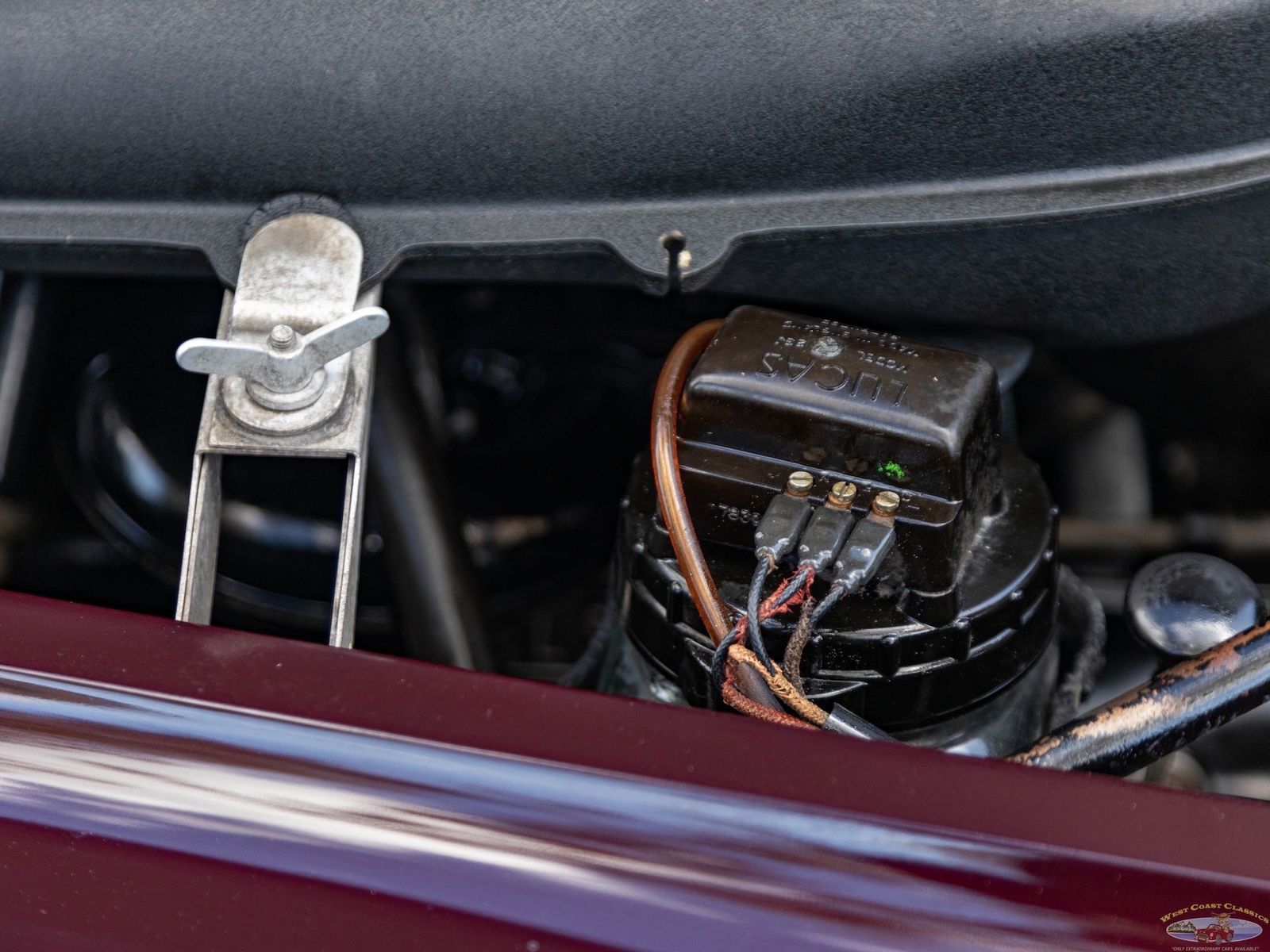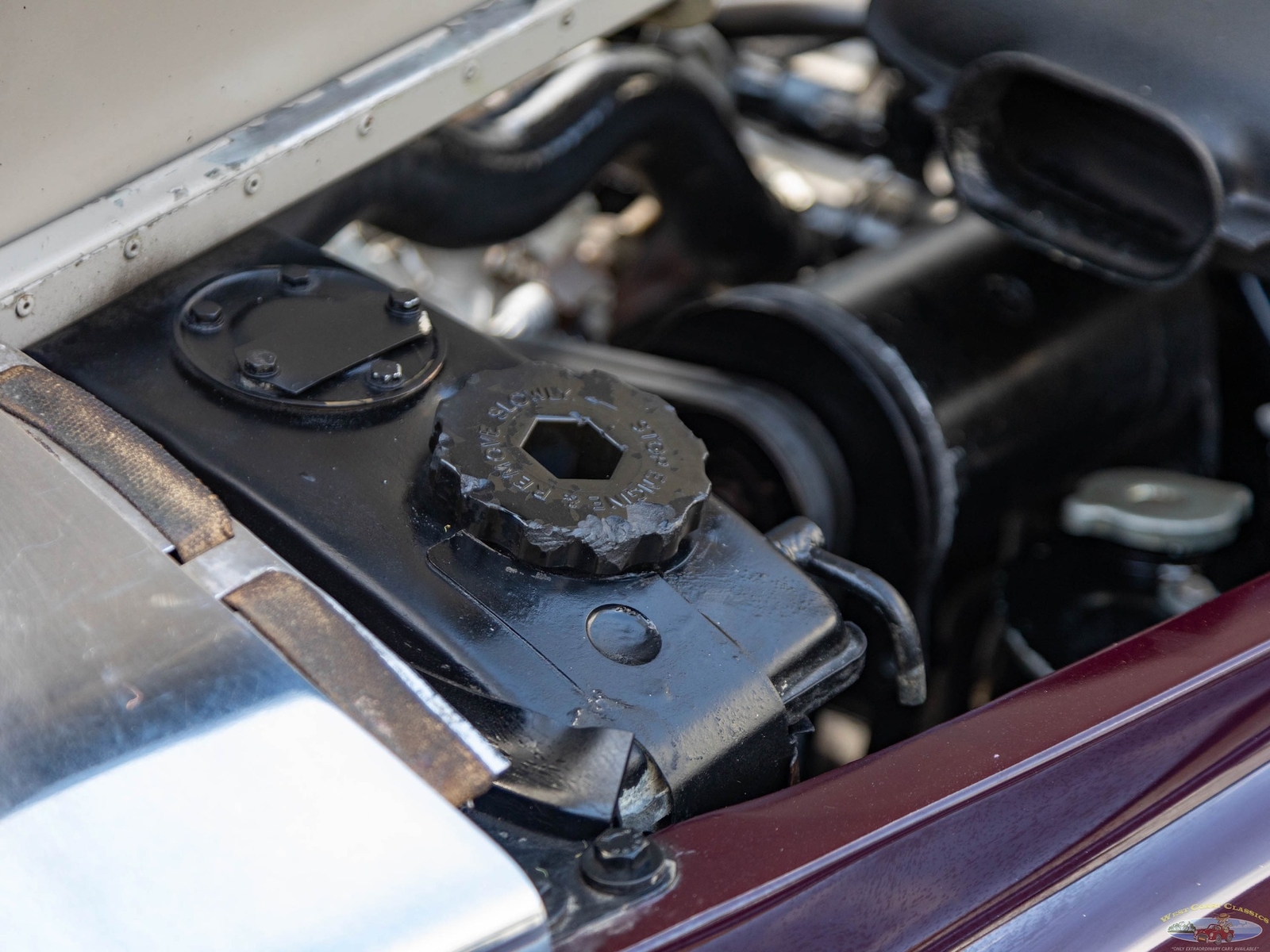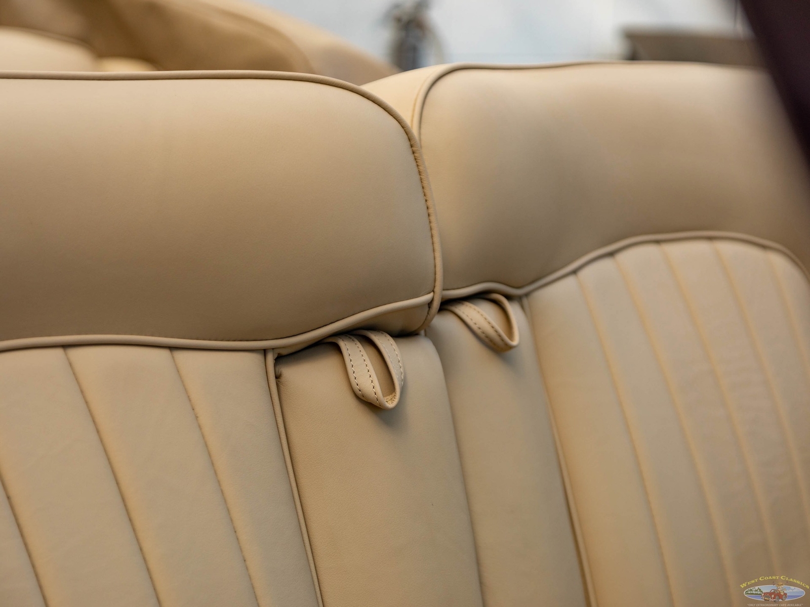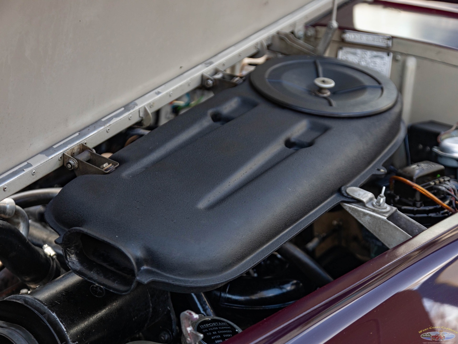 It has rare options of the altimeter and tachometer, air conditioning, 'Sundym' reflective tinted glass, White sided tubeless tires, power brakes and power windows. Finished in an exceptionally striking color of 'Regal Burgundy' with a newly upholstered 'Tan' color Connolly hides interior. The original seats are truly still as comfortable as the day they were new, firm and supportive and recently reupholstered. The carpeting and the car's original convertible top and mohair headliner have also been restored with no expense spared and the car show superb maintenance and care from its three long time owners.