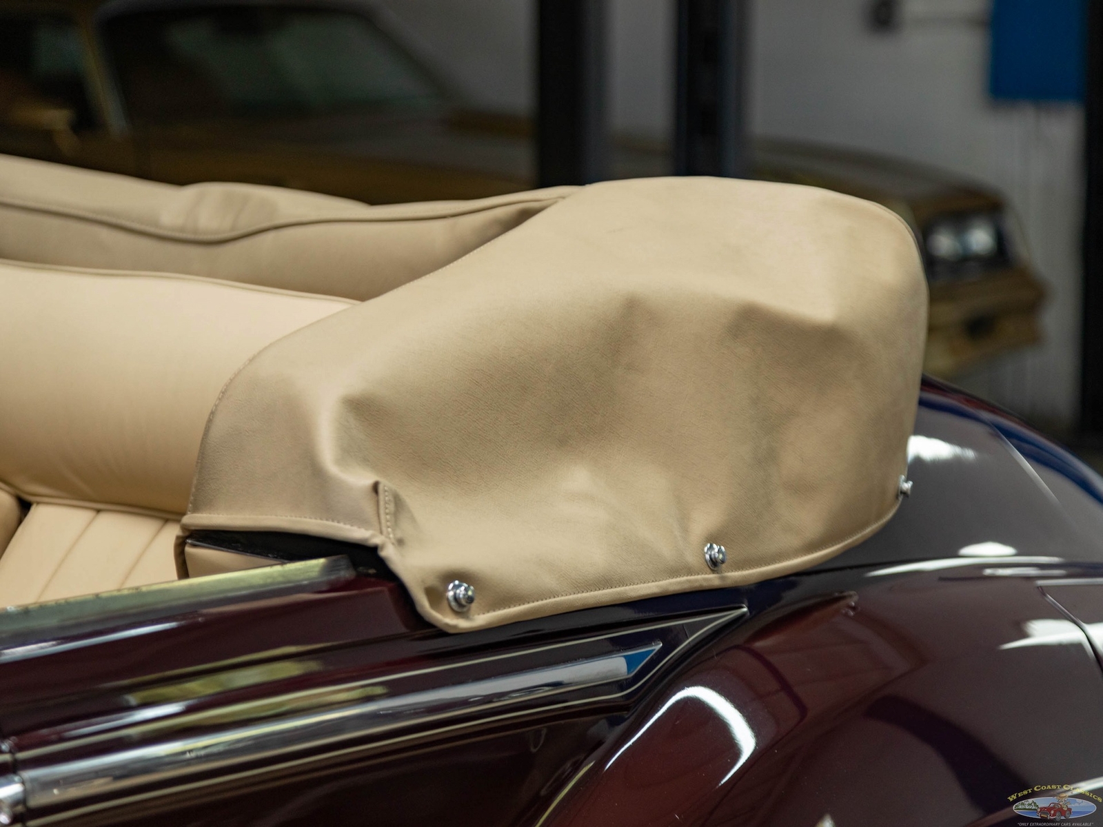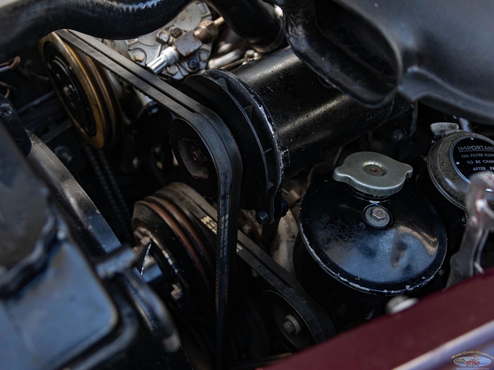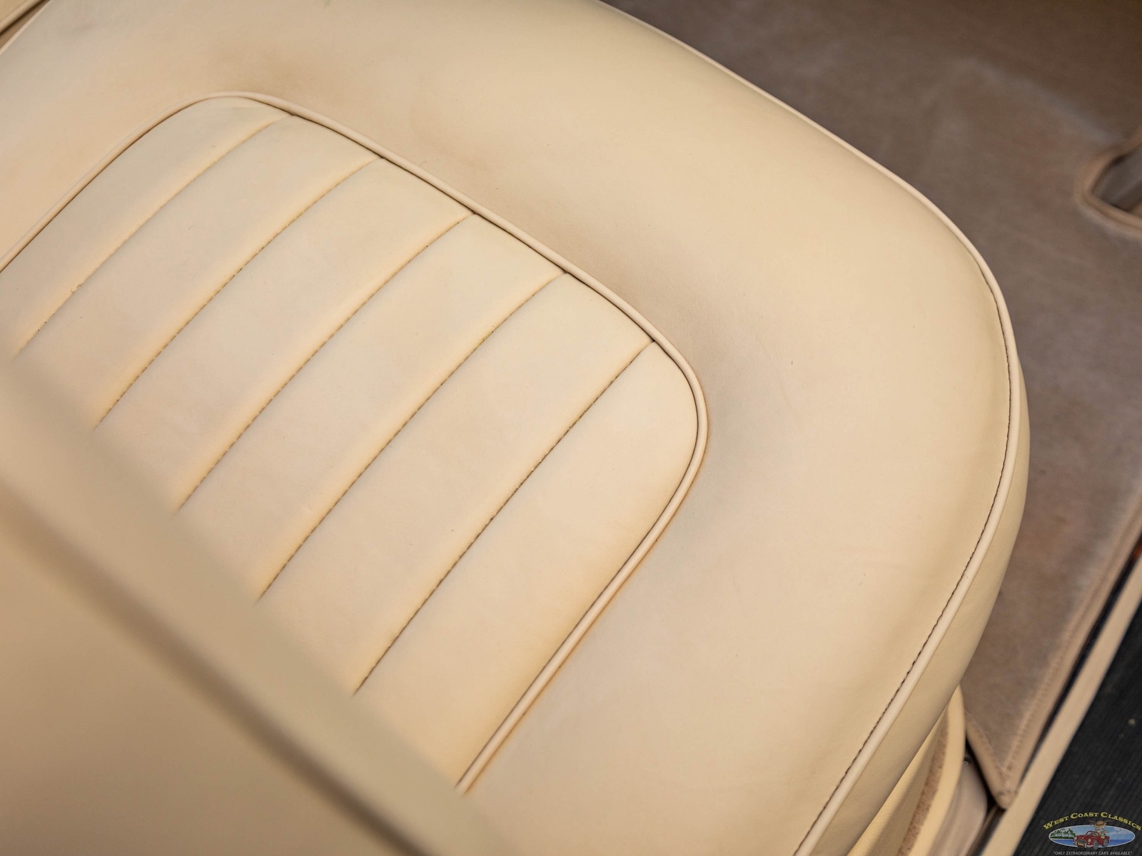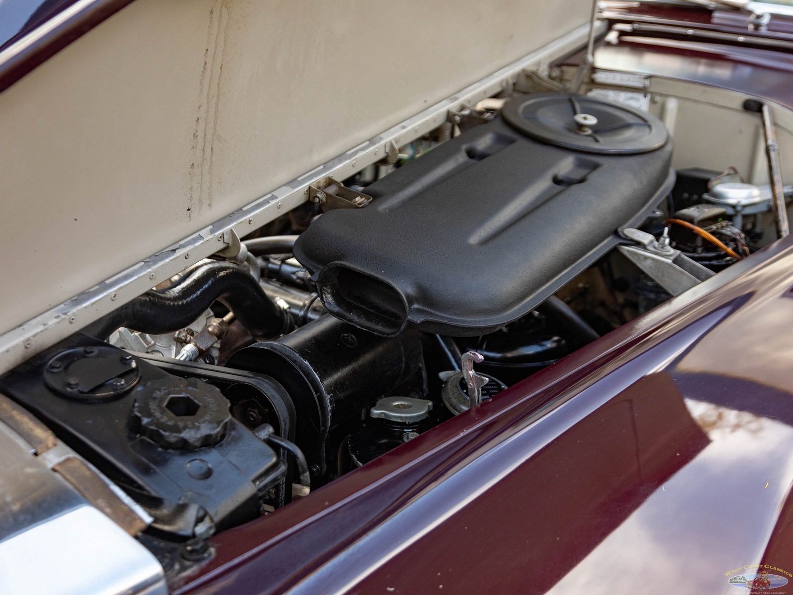 It has rare options of the altimeter and tachometer, air conditioning, 'Sundym' reflective tinted glass, White sided tubeless tires, power brakes and power windows. Finished in an exceptionally striking color of 'Regal Burgundy' with a newly upholstered 'Tan' color Connolly hides interior. The original seats are truly still as comfortable as the day they were new, firm and supportive and recently reupholstered. The carpeting and the car's original convertible top and mohair headliner have also been restored with no expense spared and the car show superb maintenance and care from its three long time owners.